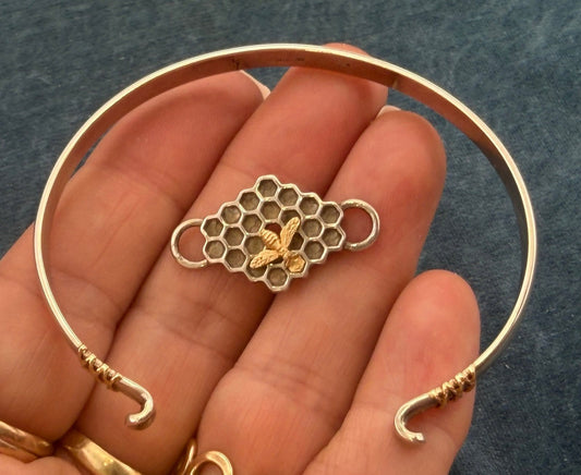 14k Gold Honey Bee on 925 Silver Bee Hive Bangle Bracelet