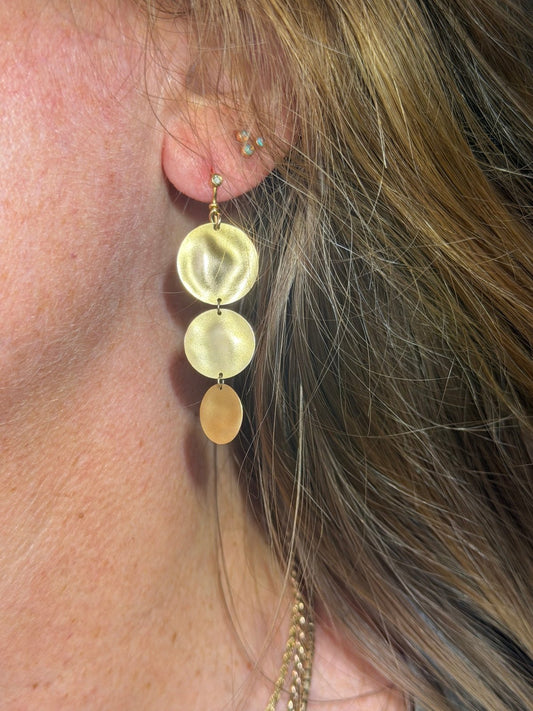 14k Yellow Gold 2" Hammered 3 Disk Dangle Earrings w Diamonds. Designer