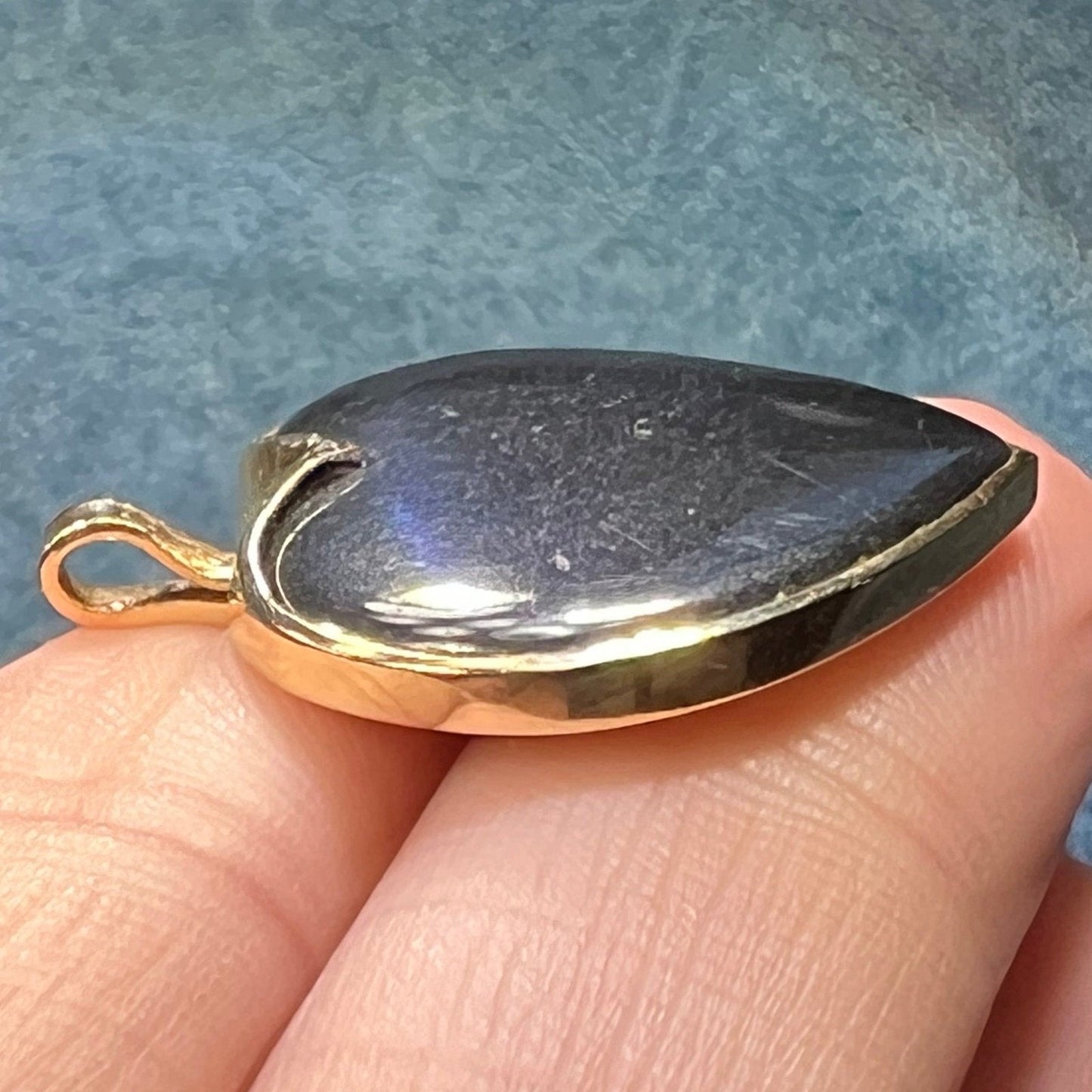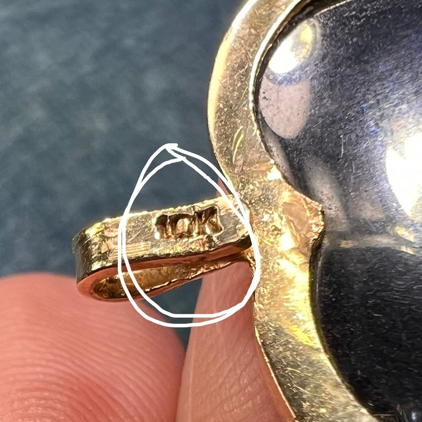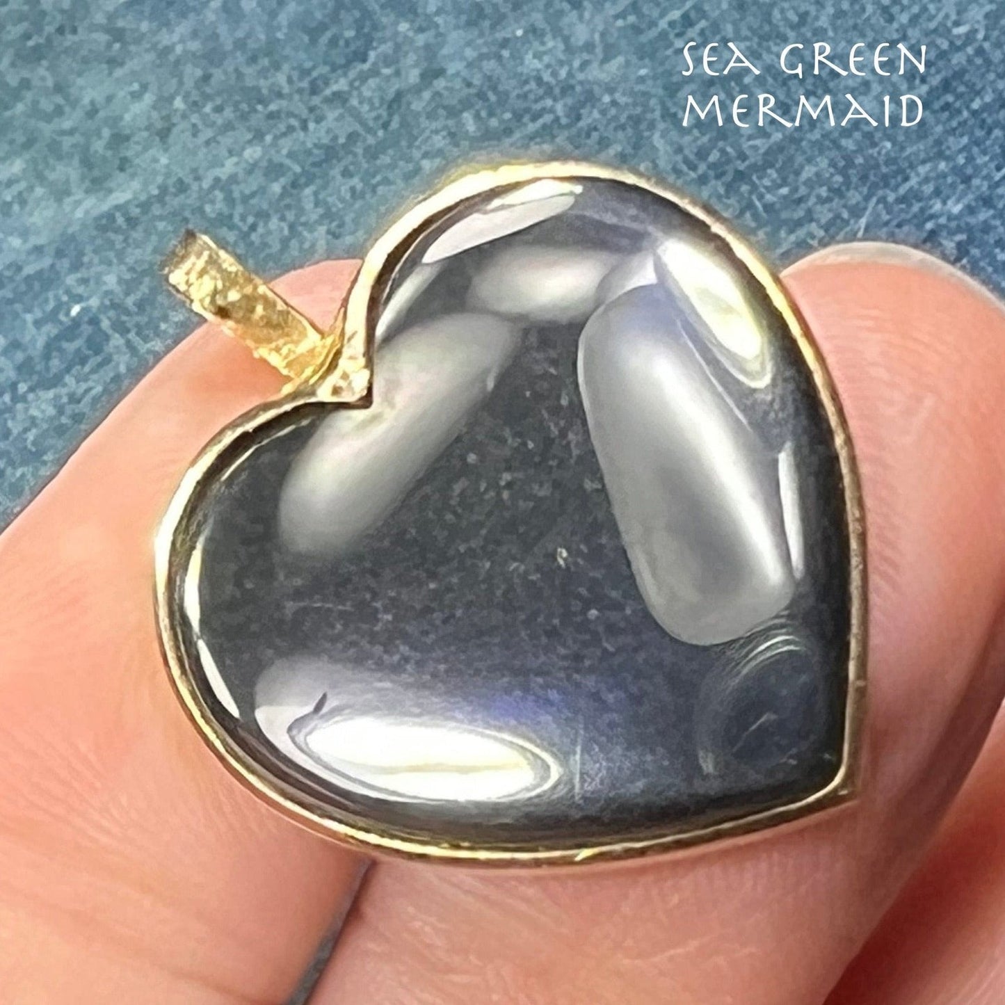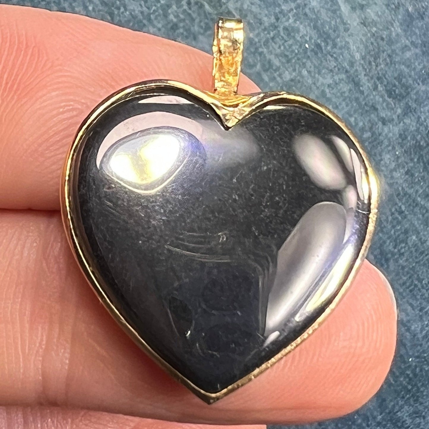 For sale is a 10k yellow gold pendant with a heart-shaped hematite gemstone. The pendant is large, heavy and well-crafted. The hematite is dark gray with lovely iridescence. It can appear black, gray or silver depending on the light. Please see the video for an accurate view. The hematite is a slightly domed on both sides, and is secure in a hand-crafted bezel setting. The pendant can be worn with either side facing forward. The pendant has an attached bail to accommodate your chain.