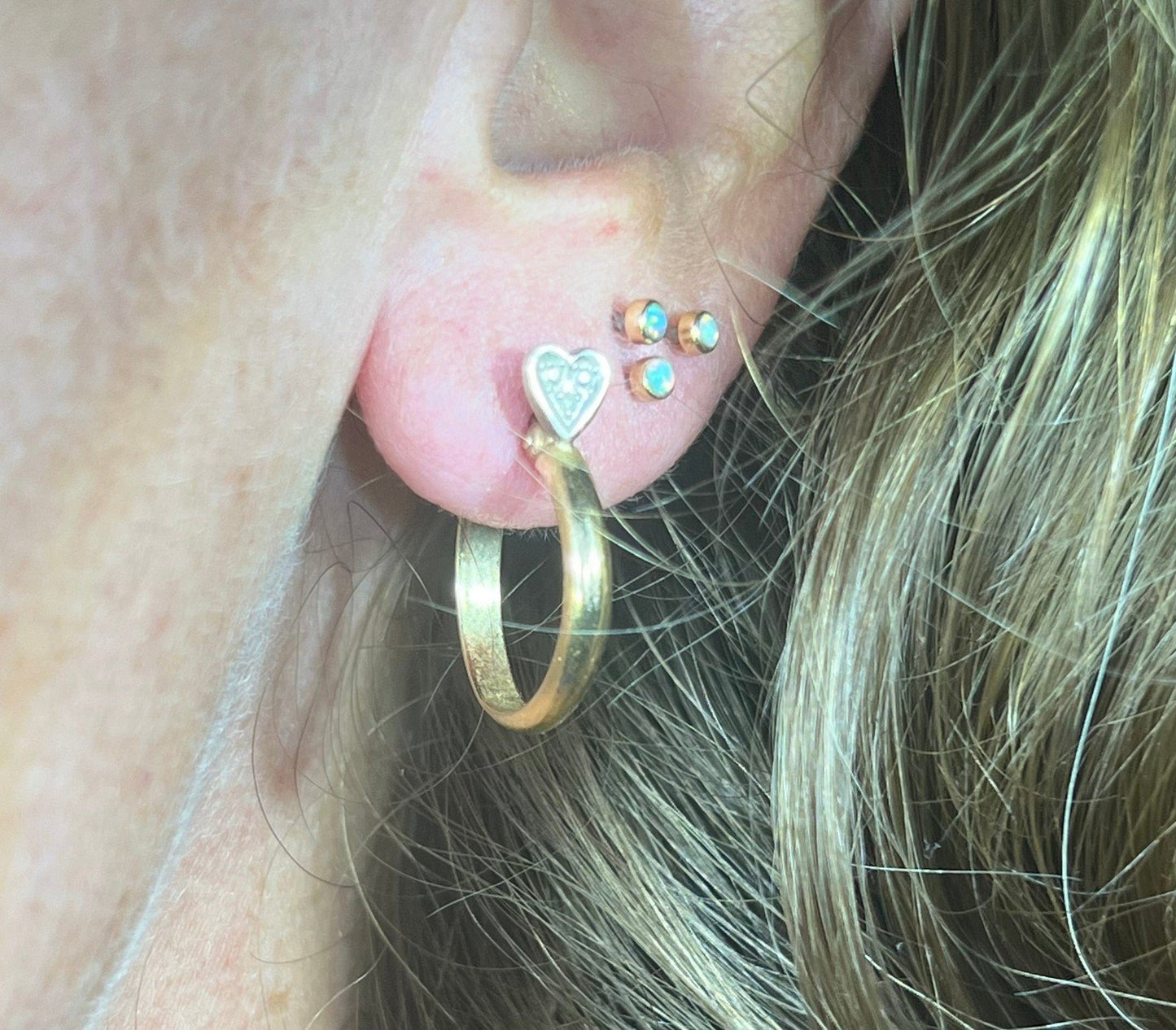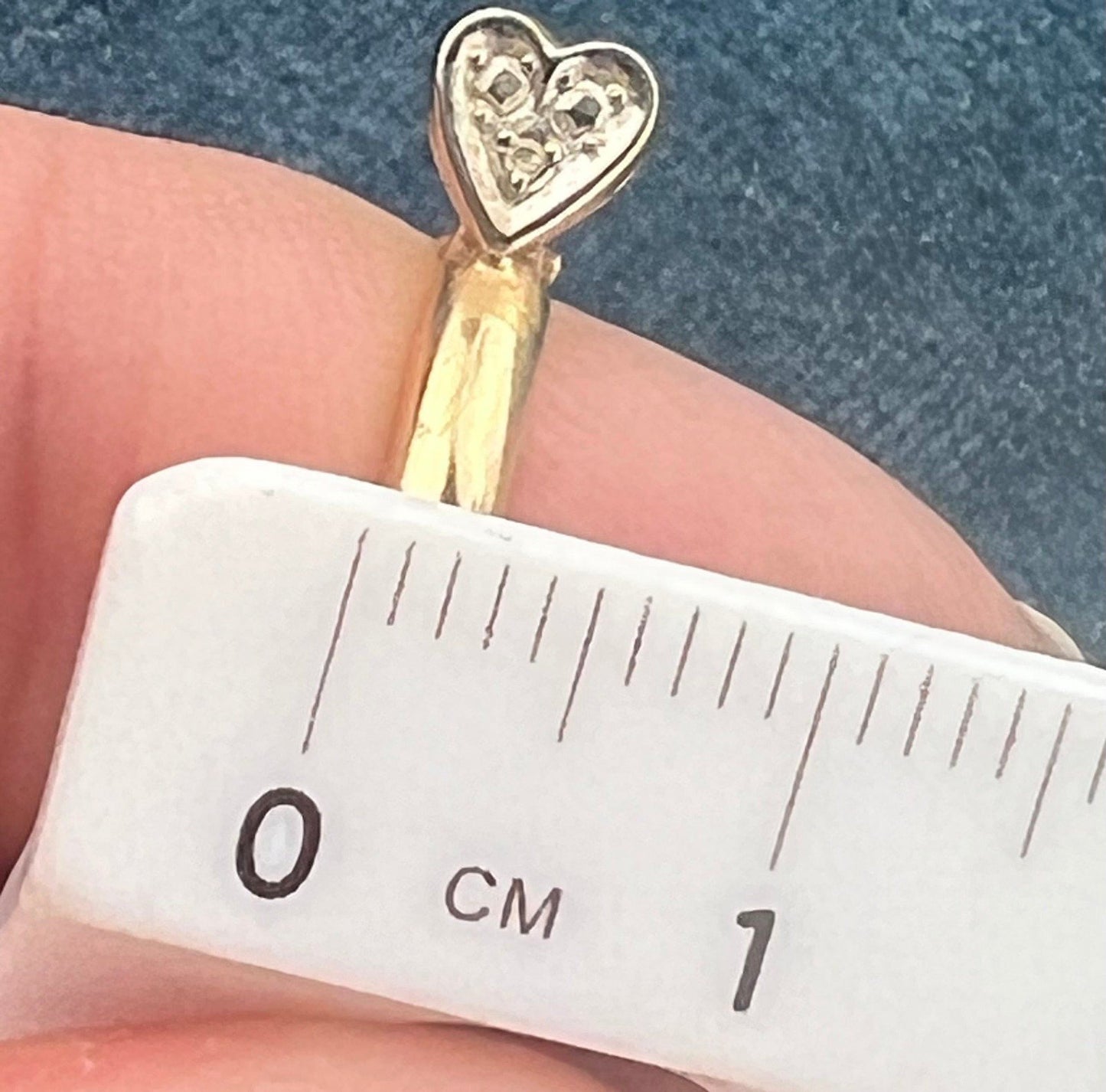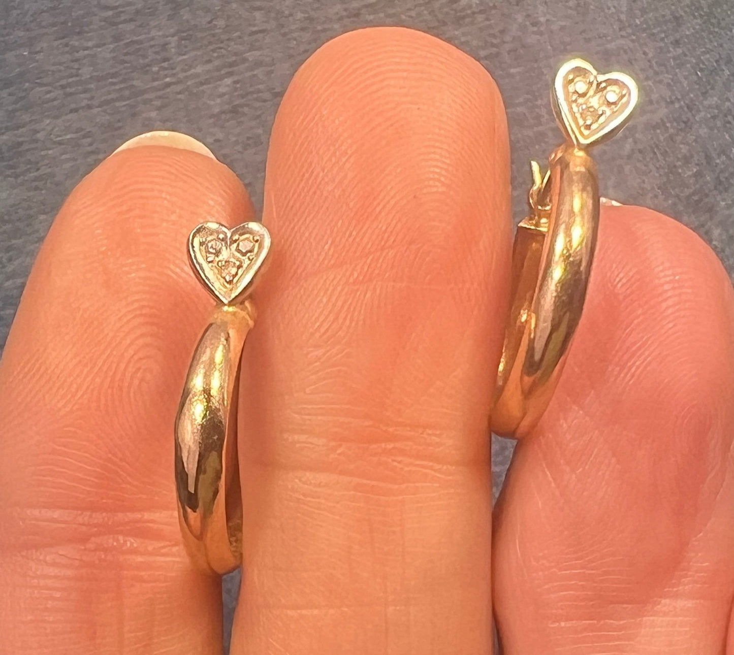 For sale is a pair of 14k yellow gold hoop earrings with white gold diamond hearts. These medium sized hoops are such a cute variation on the classic hoop earring. At the top of each round yellow gold hoop, each earring features a small white gold heart with the teeniest tiniest diamond set at the bottom. The diamond is invisibly set to enhance its brilliance. Although the diamonds are teeny tiny, you can see them sparkle in the light. The hoops fasten securely with a tongue in groove closure.