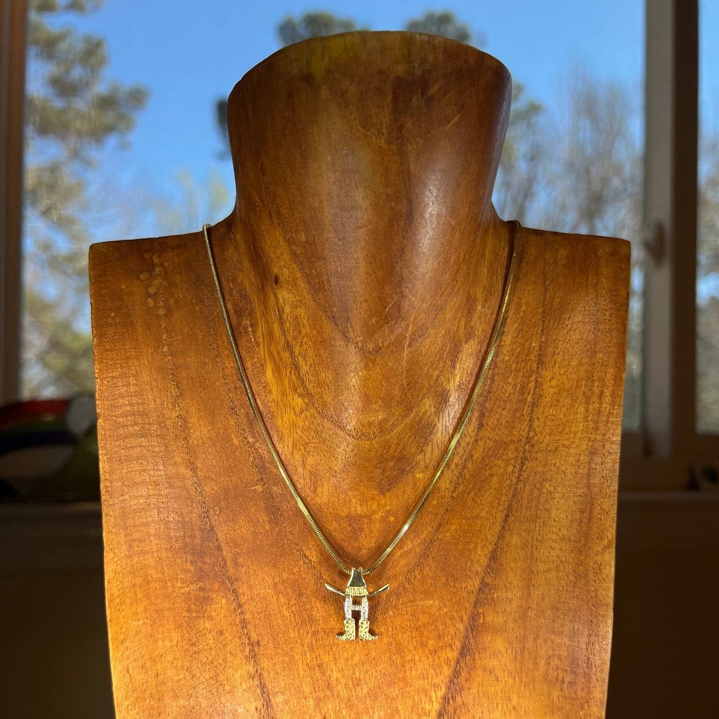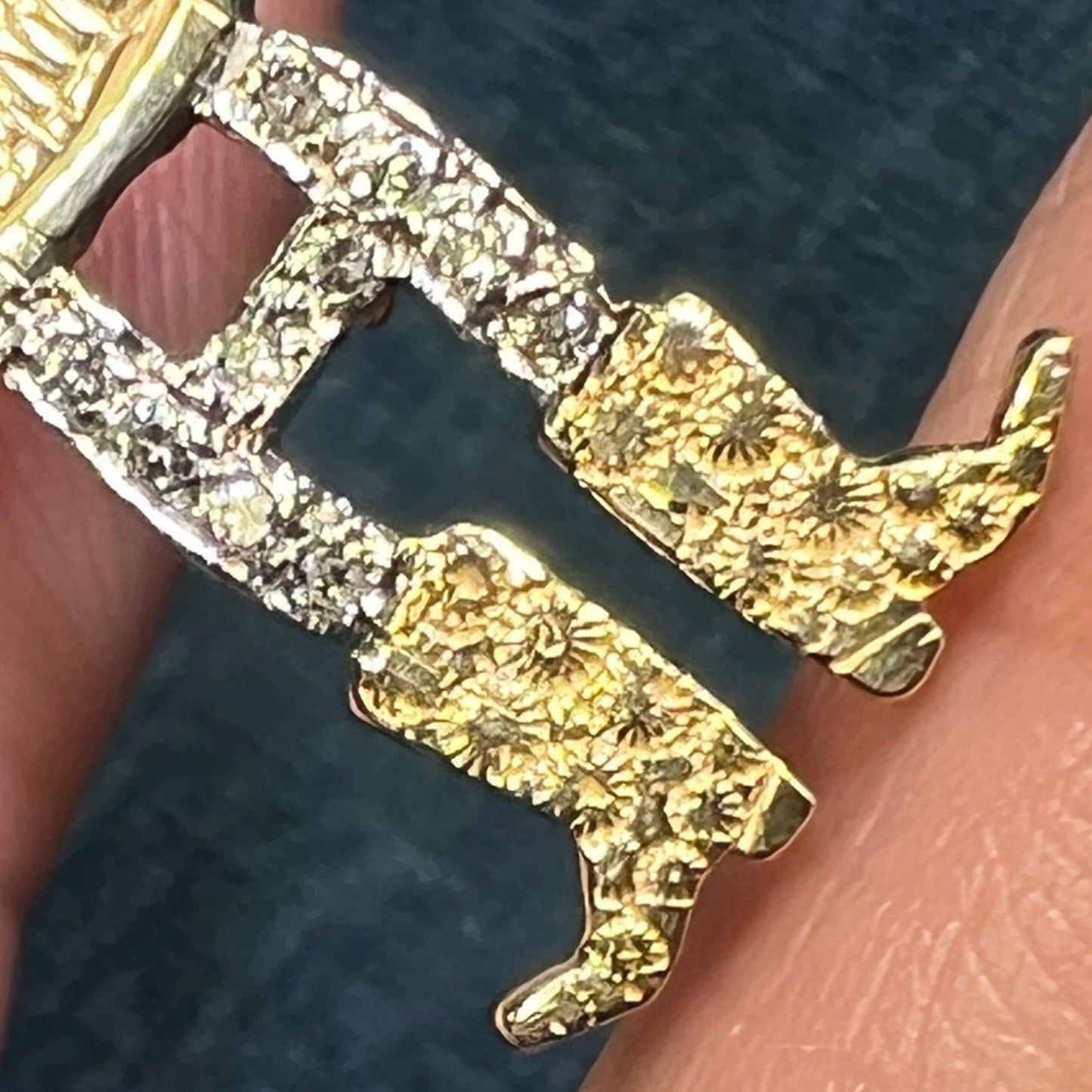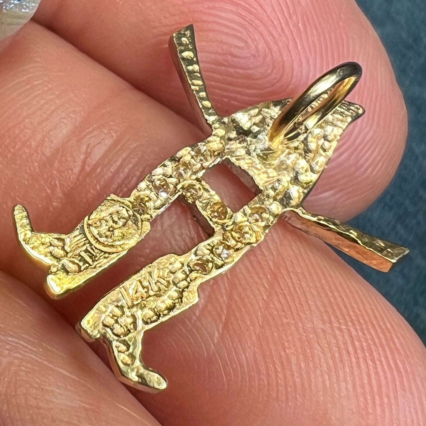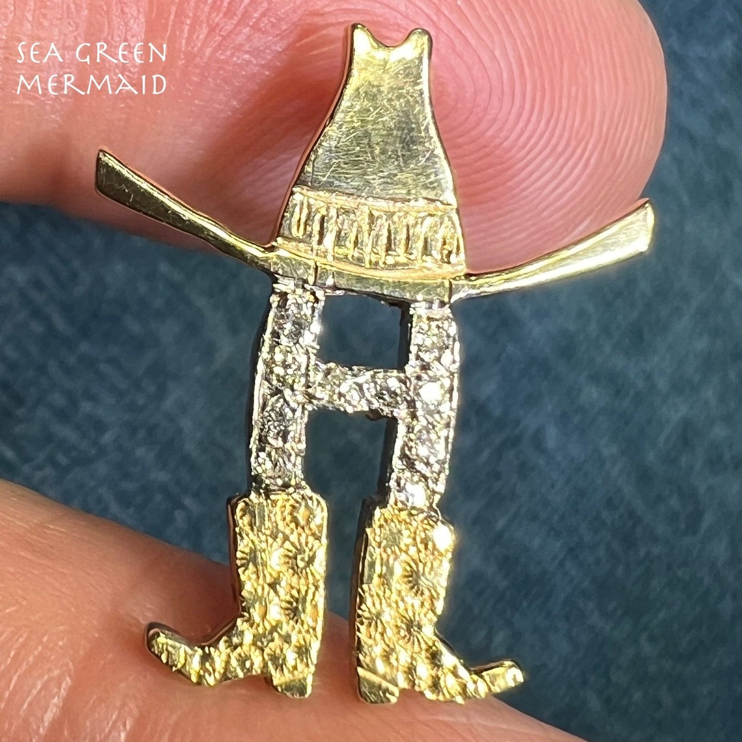 For sale is a 14k yellow gold and diamond cowboy or cowgirl pendant. This funny little ranch-hand wears a huge hat and pointy-toed boots. The boots are engraved with a splashy sunburst design. The figure's body is made from white gold studded with tiny sparkly diamonds. The body of the cowboy is shaped like the letter "H." Possibly the name of a ranch? This is a slide-style pendant, with a hidden bail in back to accommodate your chain. Perfect for the cowboy - or cowgirl - in your life!