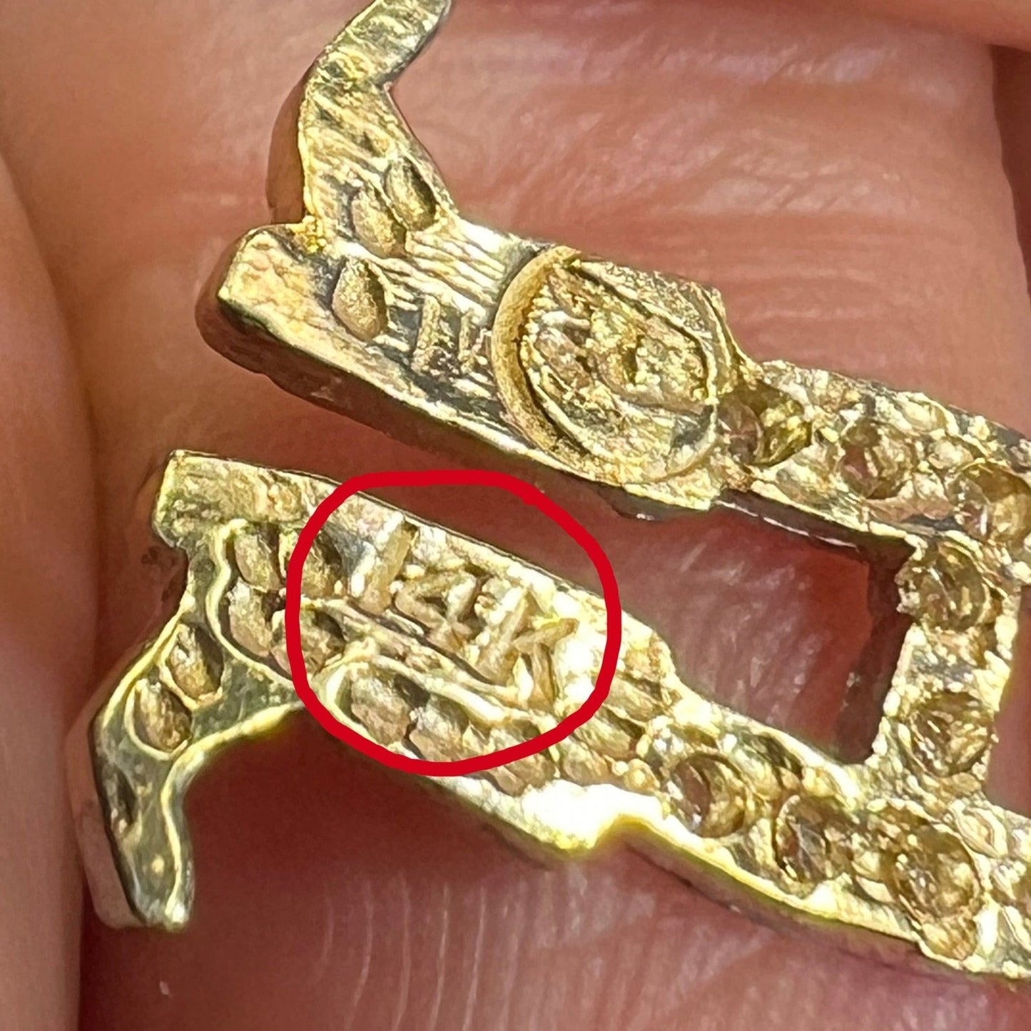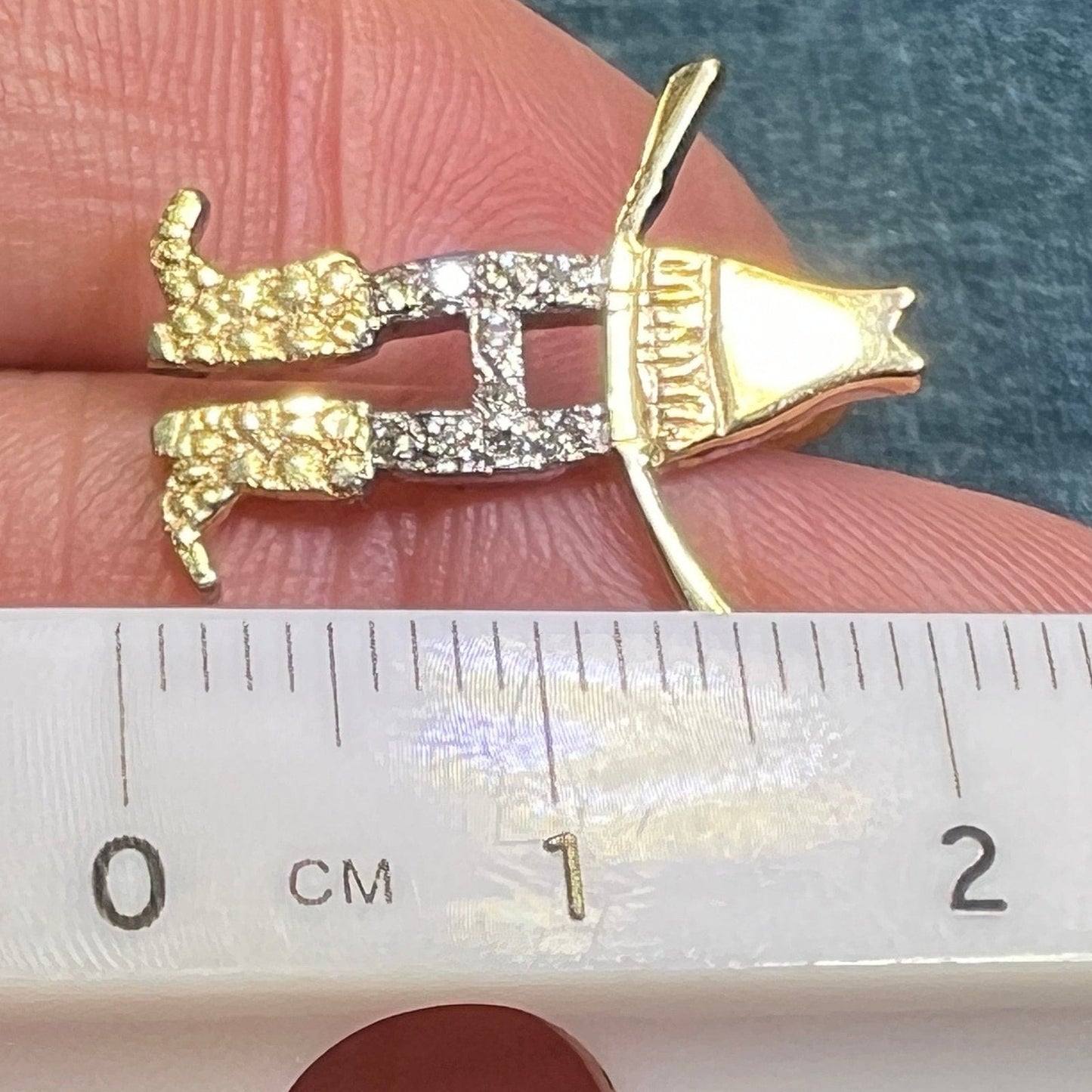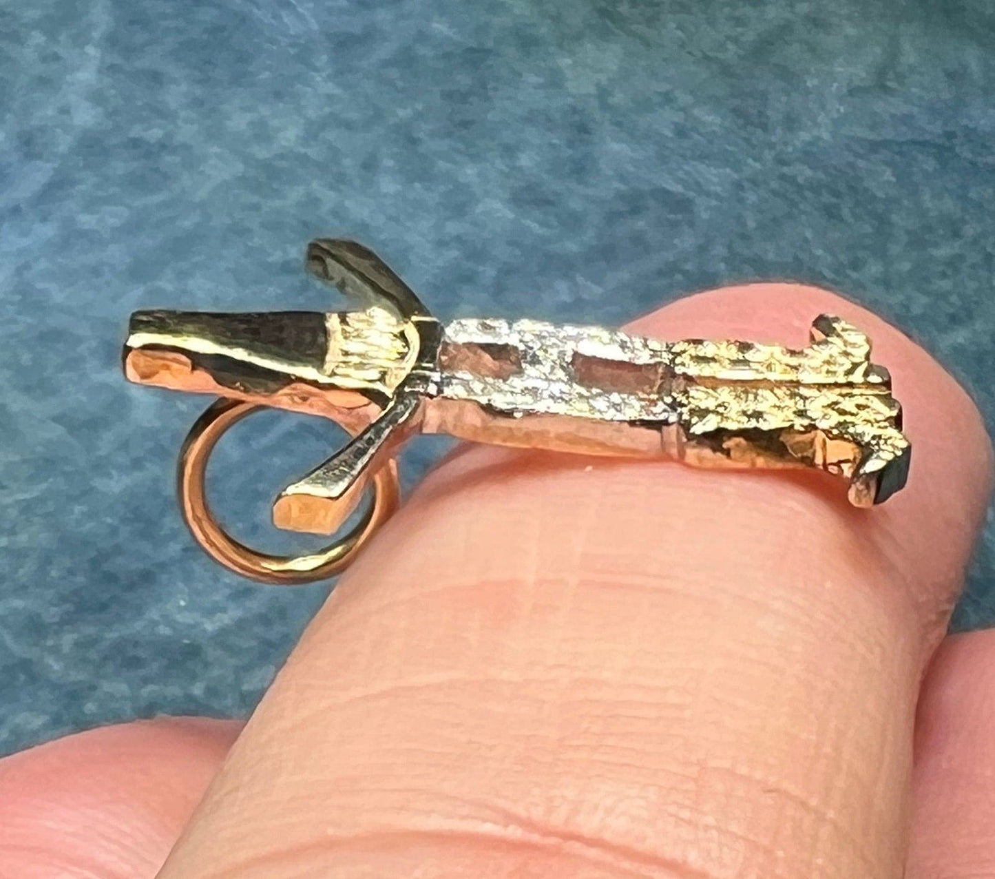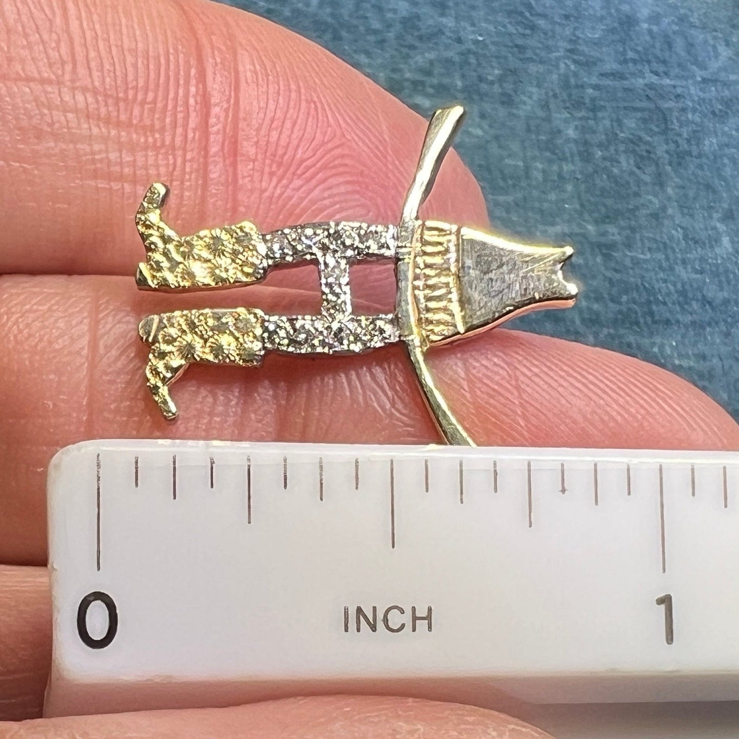 For sale is a 14k yellow gold and diamond cowboy or cowgirl pendant. This funny little ranch-hand wears a huge hat and pointy-toed boots. The boots are engraved with a splashy sunburst design. The figure's body is made from white gold studded with tiny sparkly diamonds. The body of the cowboy is shaped like the letter "H." Possibly the name of a ranch? This is a slide-style pendant, with a hidden bail in back to accommodate your chain. Perfect for the cowboy - or cowgirl - in your life!