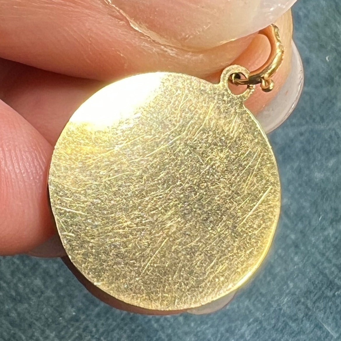 This rare and beautifully crafted pendant is a large, thick, flat disk of gold of solid 14k. The flower is raised gold, polished smooth. The pendant is edged in a circle of raised gold, polished smooth as well. We have added a 14k yellow gold spring ring clasp for you to use as a bail with your necklace. This pendant can be worn on a longer chain as a medallion or at the neckline for a more dramatic look. This pendant would be attractive worn by a man or a woman.