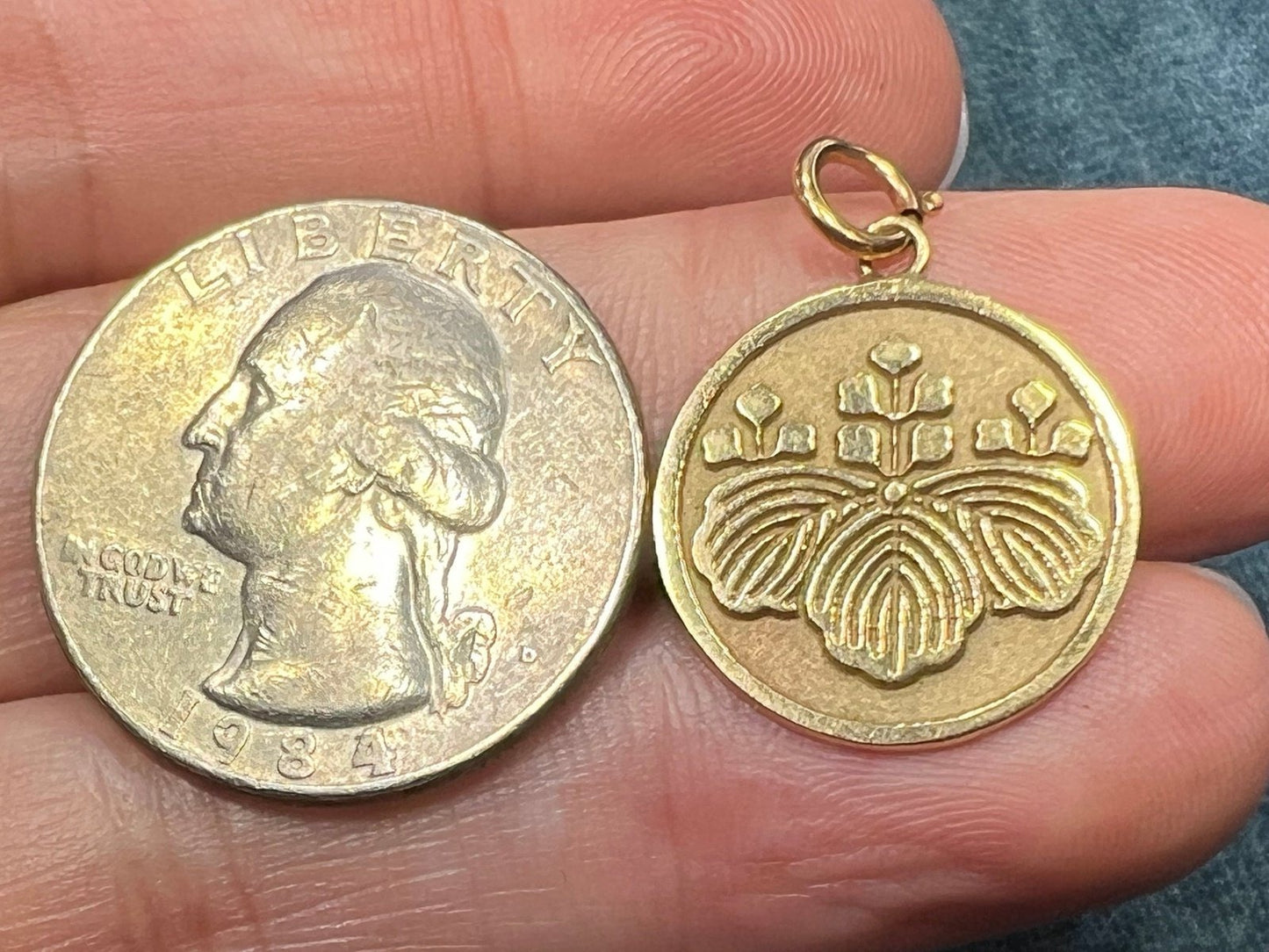 For sale is a 14k yellow gold pendant featuring the national seal of Japan. The design is a Kamon, or Japanese family crest, commonly used to represent a family, town, or government. This particular design using a Paulownia flower is called "Maru-ni gosan-no kiri" in Japan, and it represents the Government Seal of Japan, used by the Prime Minister, the Cabinet, and the Japanese government on official documents. This Paulownia seal used to be the private symbol of the Japanese Imperial Family.