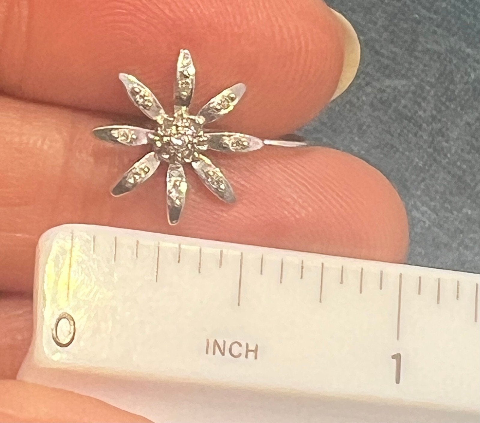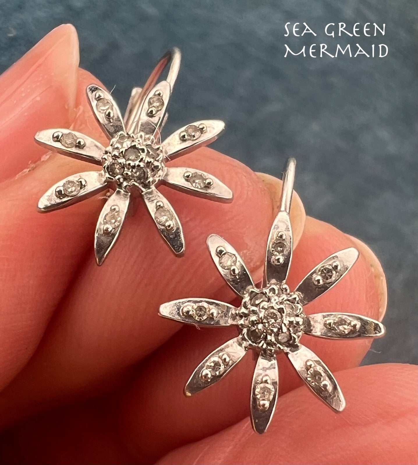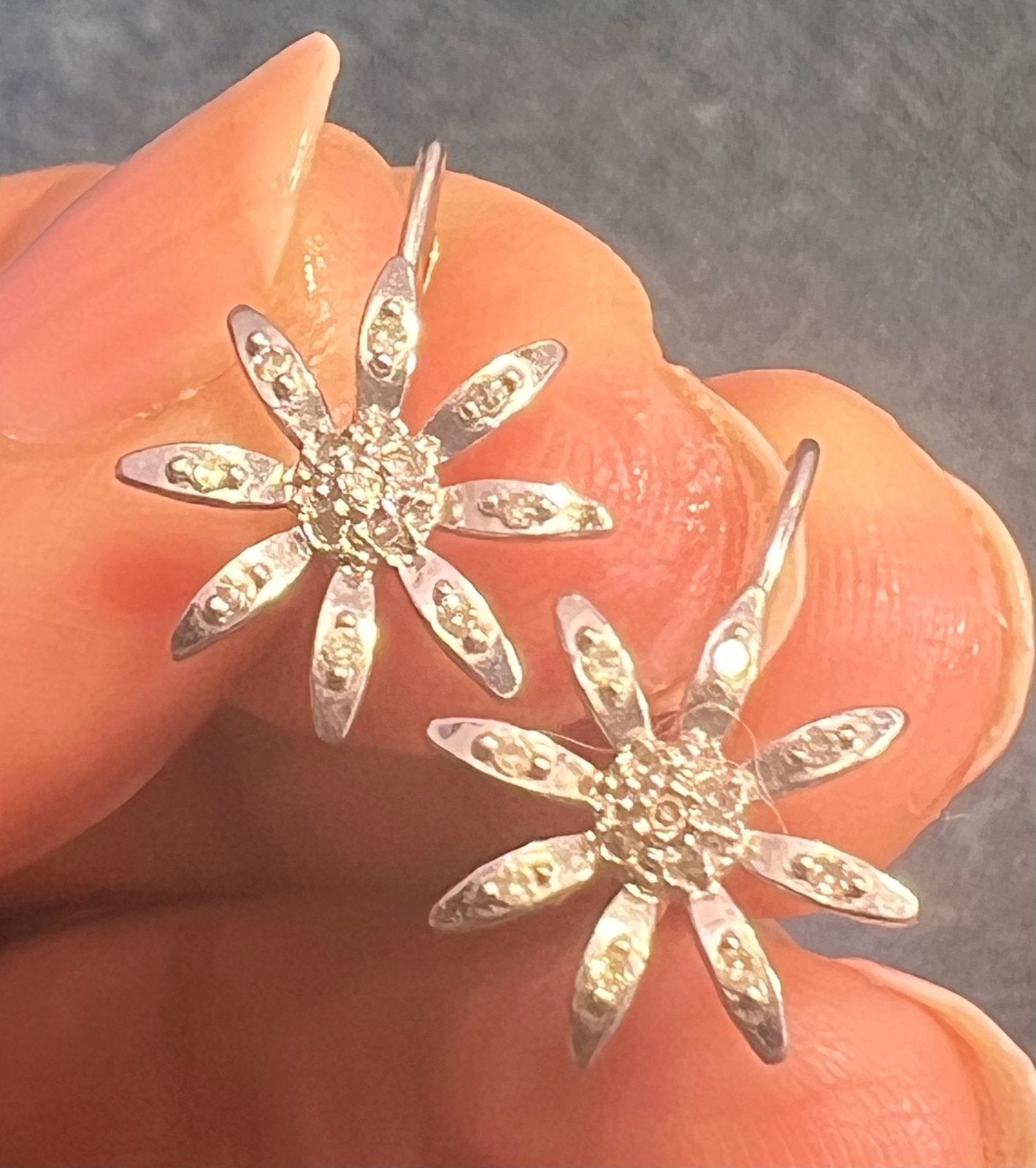 For sale is a pair of 14k white gold daisy leverback earrings with tiny diamonds. Each daisy has a cluster of diamonds set at the center, and a single diamond set in each of its 8 flower petals. The diamonds are medium quality, with just a tiny hint of sparkle. The earrings are leverbacks that fasten securely. I love daisies, and daisy earrings are hard to find. Please don't miss these if you love them too!