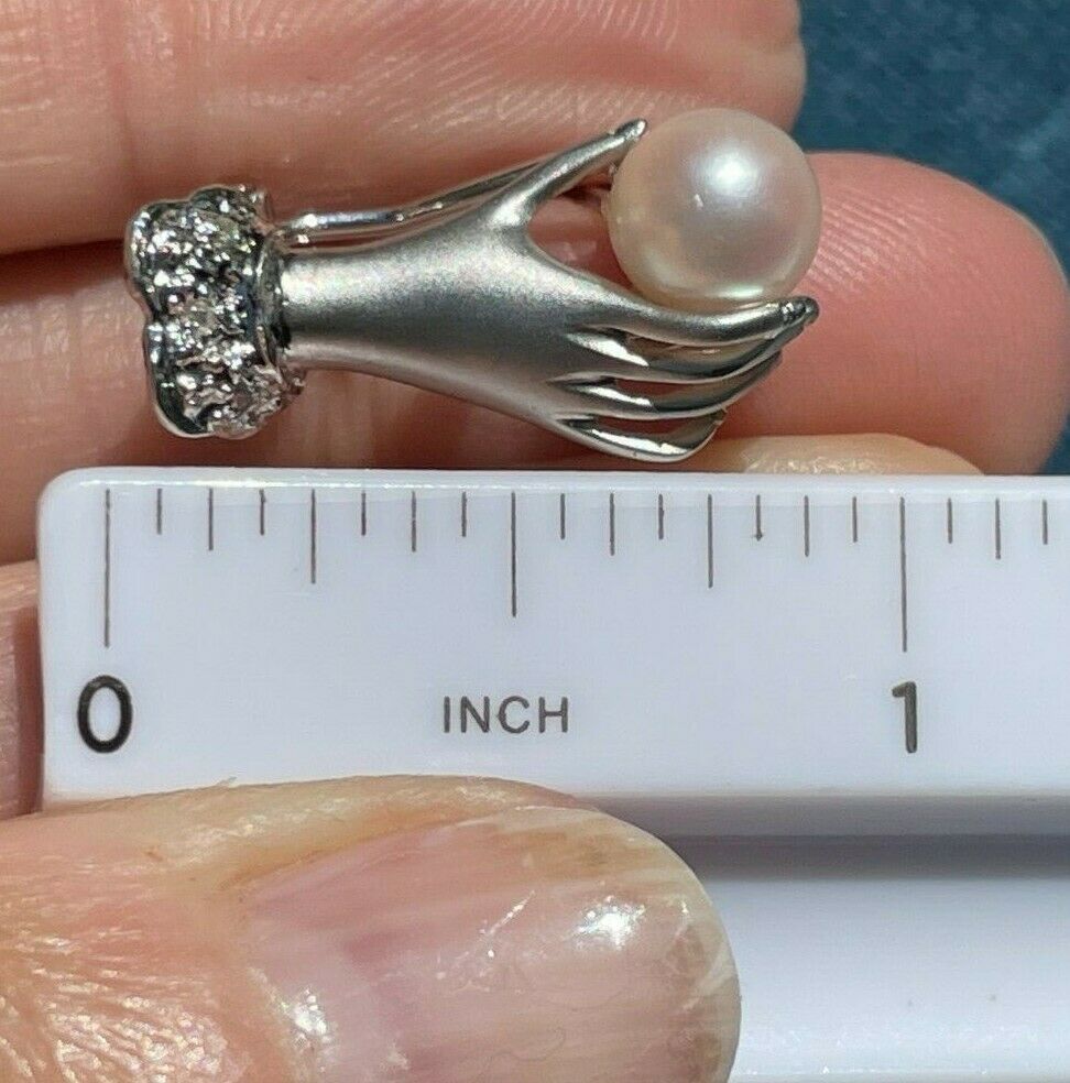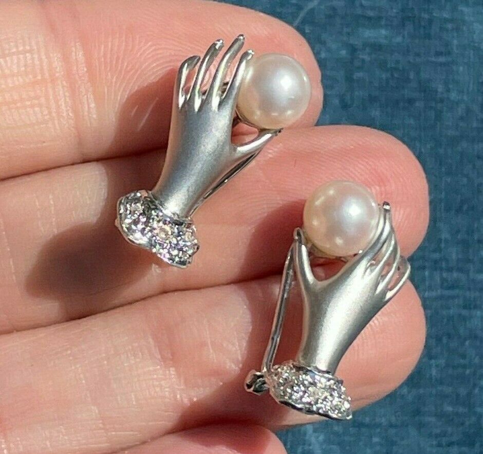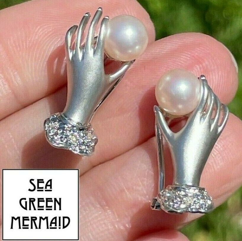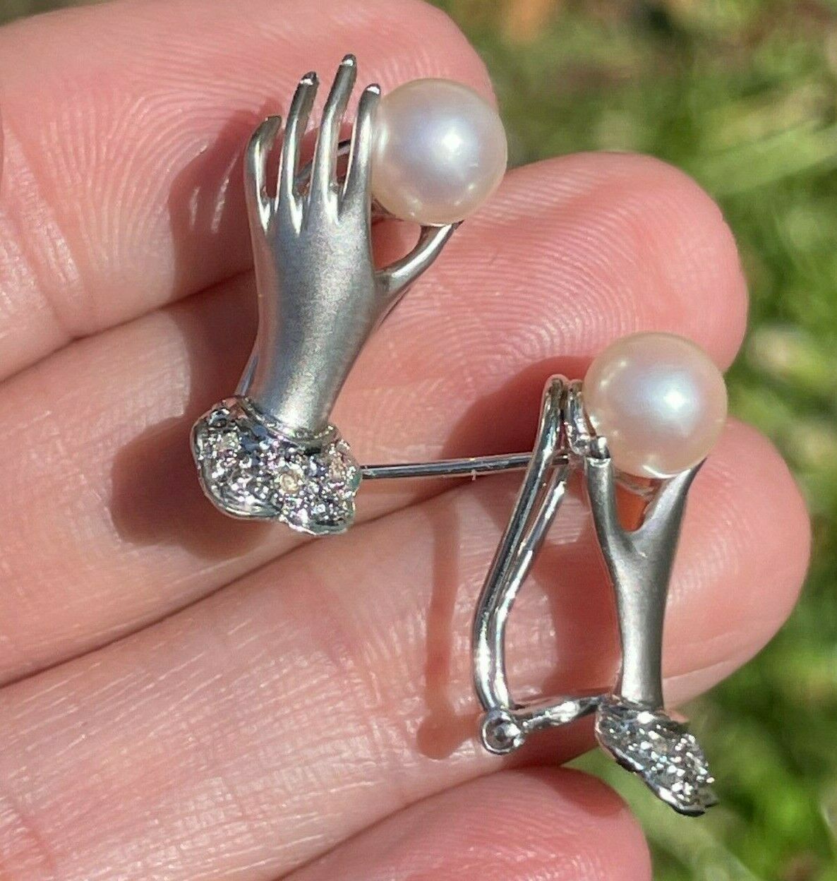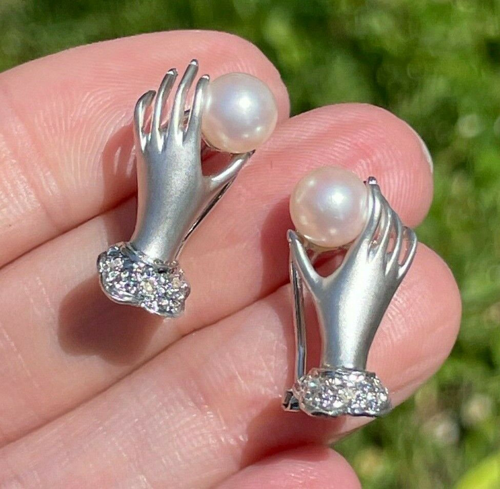 For sale is a pair of 14k white gold OMEGABACK earrings each featuring a hand with a white gold diamond bracelet holding a pearl. These antique-style earrings are charming and romantic. Each earring features an elegant, slim-fingered hand arching gracefully around a large creamy white pearl. Each hand sparkles with a diamond "bracelet" with tiny brilliant diamonds that encircles the wrist. The white gold has a slightly textured matte appearance. These earrings would combine beautifully with a classic pearl necklace or pendant, or with a simple diamond pendant.