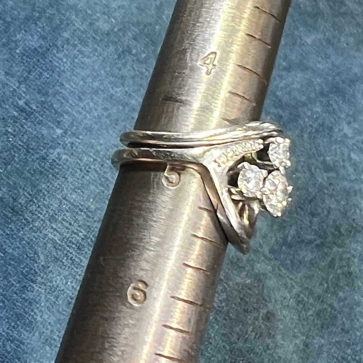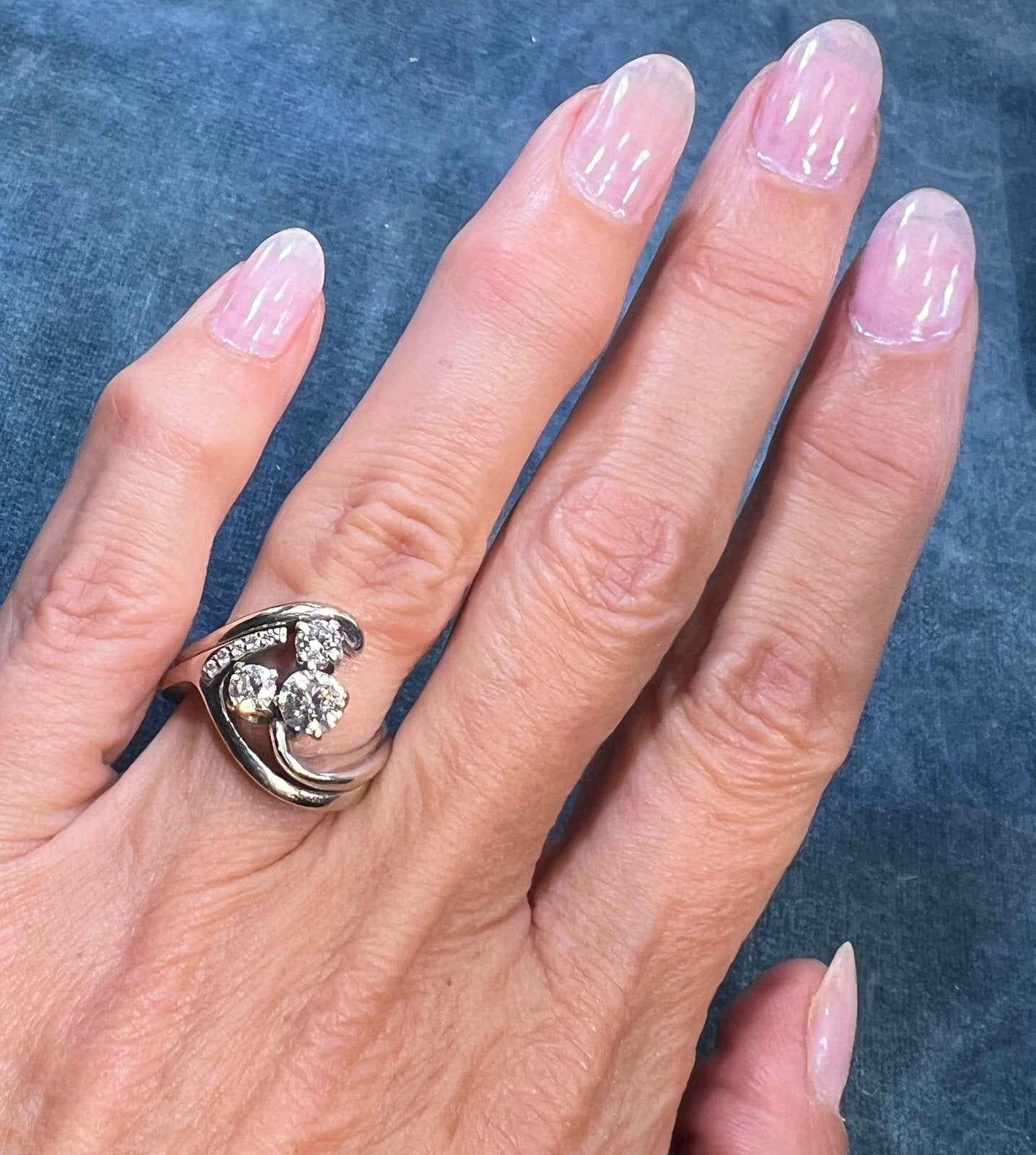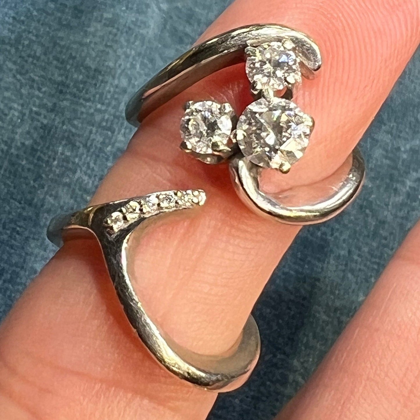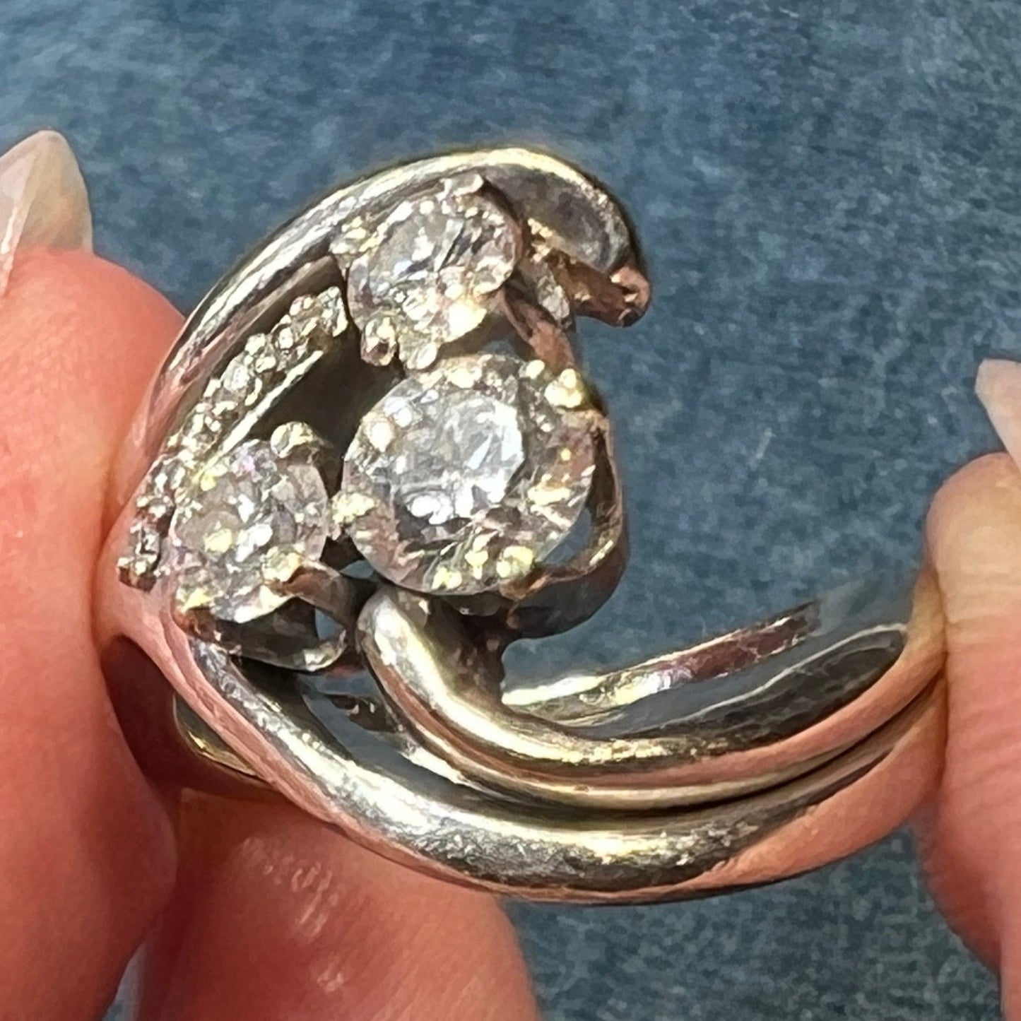 For sale is a 14k white gold and natural diamond two ring wedding and engagement band set. This amazing, custom-made ring set is designed to represent the power and beauty of an ocean wave. The larger band features three large, round diamonds that are set inside the curve of the ocean wave. The smaller band curves to fit perfectly with the larger band. The smaller band has a glittering row of channel set diamonds that curve up towards the three larger diamonds. The overall effect when the two rings are set together is simply stunning. The ring is quite wide at about 3/4". This is a statement ring set with clean lines and modern elegance!