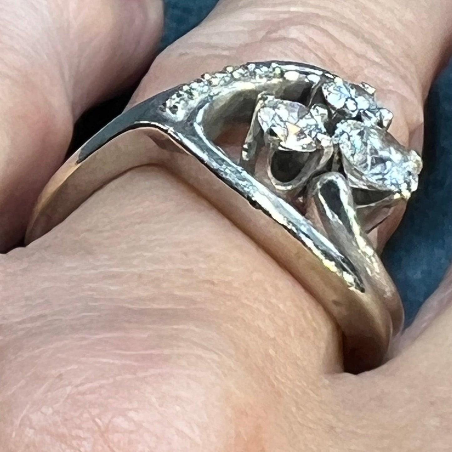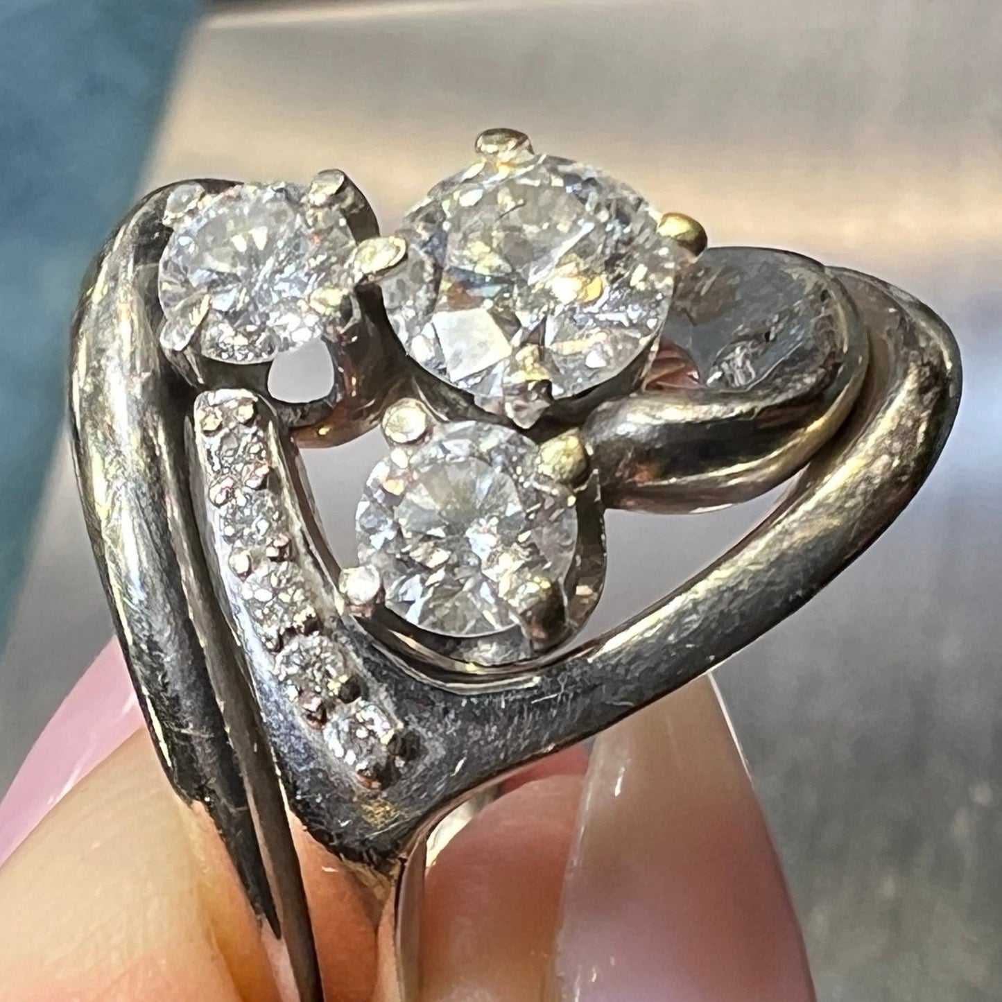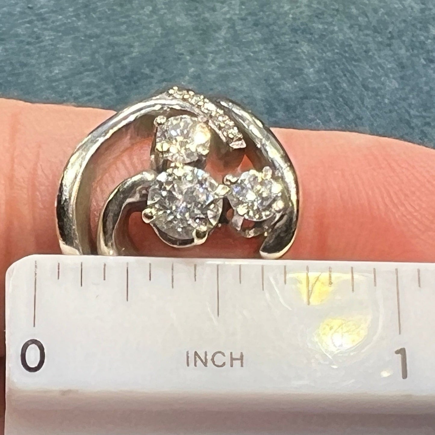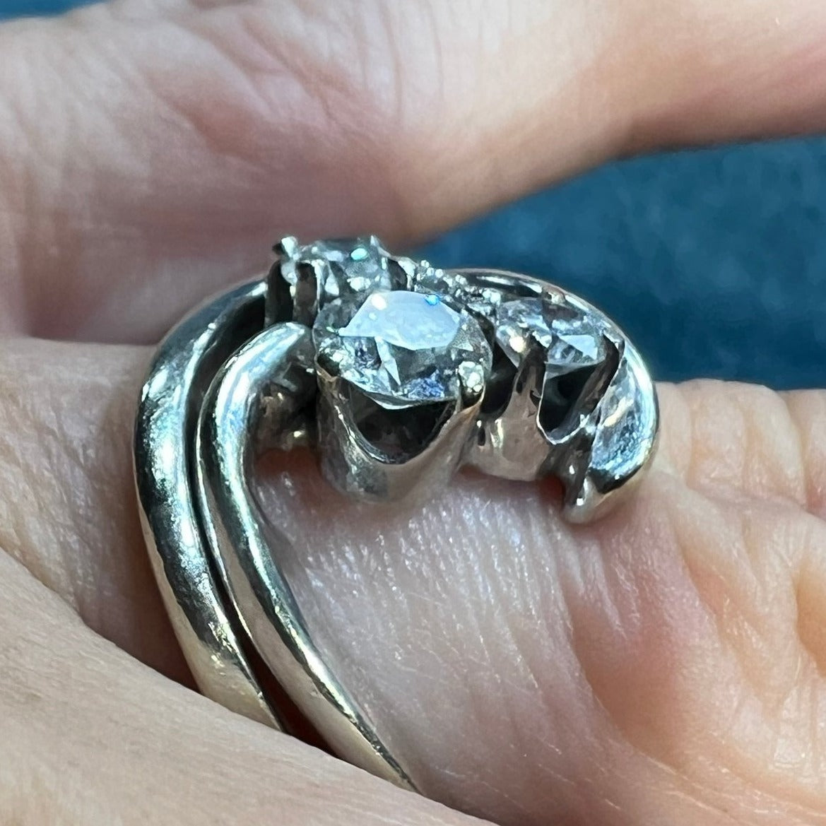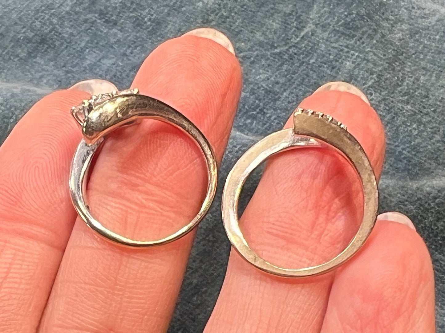 For sale is a 14k white gold and natural diamond two ring wedding and engagement band set. This amazing, custom-made ring set is designed to represent the power and beauty of an ocean wave. The larger band features three large, round diamonds that are set inside the curve of the ocean wave. The smaller band curves to fit perfectly with the larger band. The smaller band has a glittering row of channel set diamonds that curve up towards the three larger diamonds. The overall effect when the two rings are set together is simply stunning. The ring is quite wide at about 3/4". This is a statement ring set with clean lines and modern elegance!
