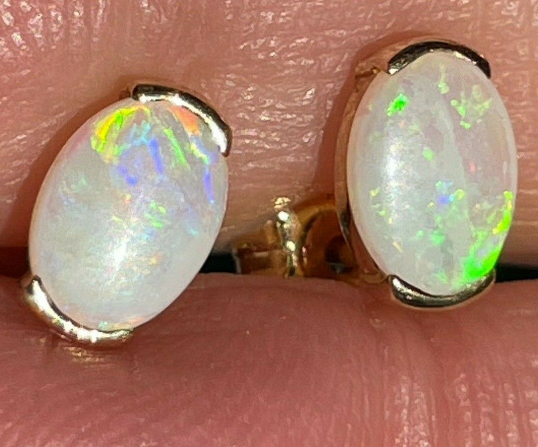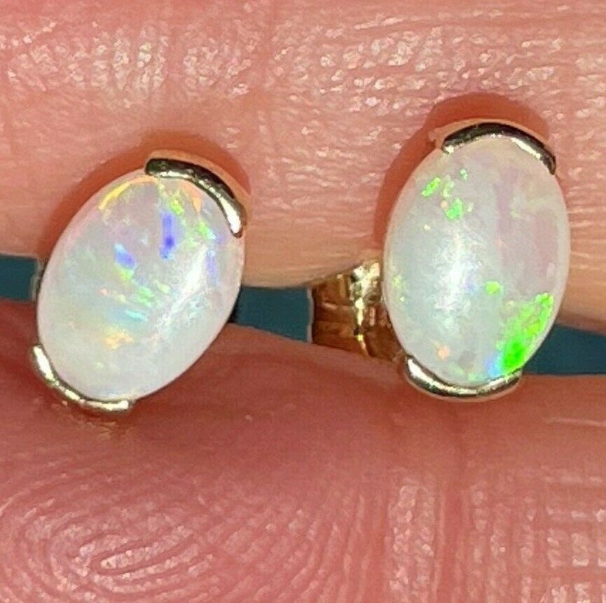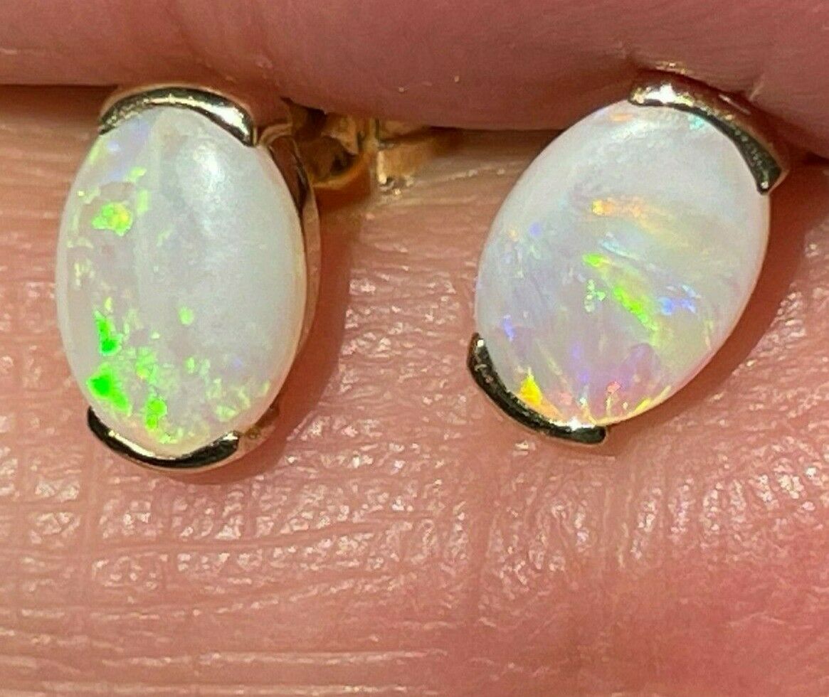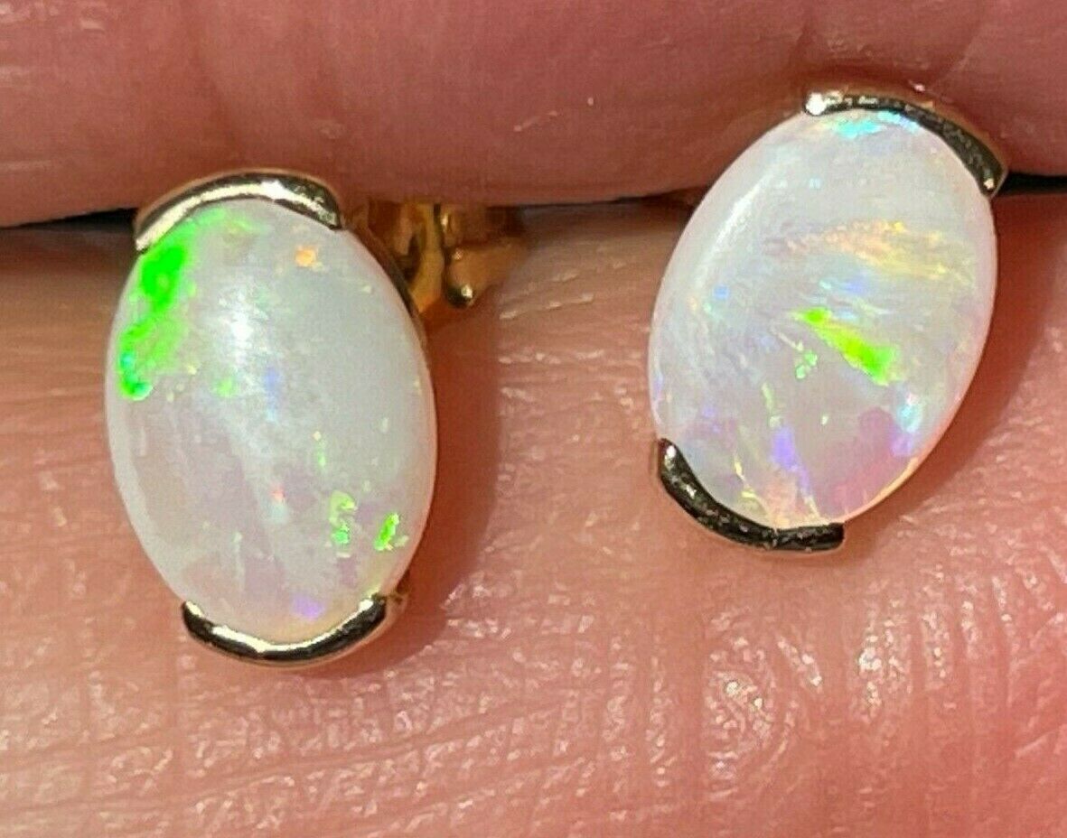 For sale is a pair of 14k yellow gold earrings with Australian crystal opals. Each earring has an oval opal that is translucent with swirls of color. The opals display lime green, tangerine, cherry red, fuchsia and purple fire. One of the opals flashes a lovely rainbow swirl in the sunlight. Each opal is secure in a partial bezel-setting. The earrings fasten with gold butterfly backs.