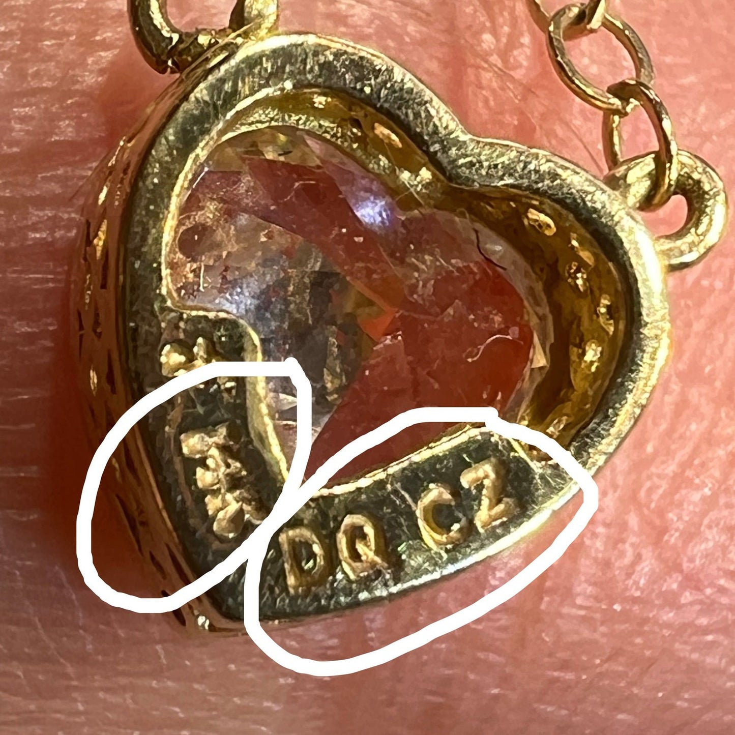 The heart is framed in a sturdy 14k gold bezel setting. The bezel frame is thick and well crafted. the slide style pendant is suspended from a 16" 14k gold chain. The dedicated chain clasps with a large spring ring closure. The pendant is stamped "14K" and "CZ." The chain is stamped "14k" in two places. This pedant is sparkly, well crafted, and classic. Perfect to wear alone and also fun to layer with other pendants.