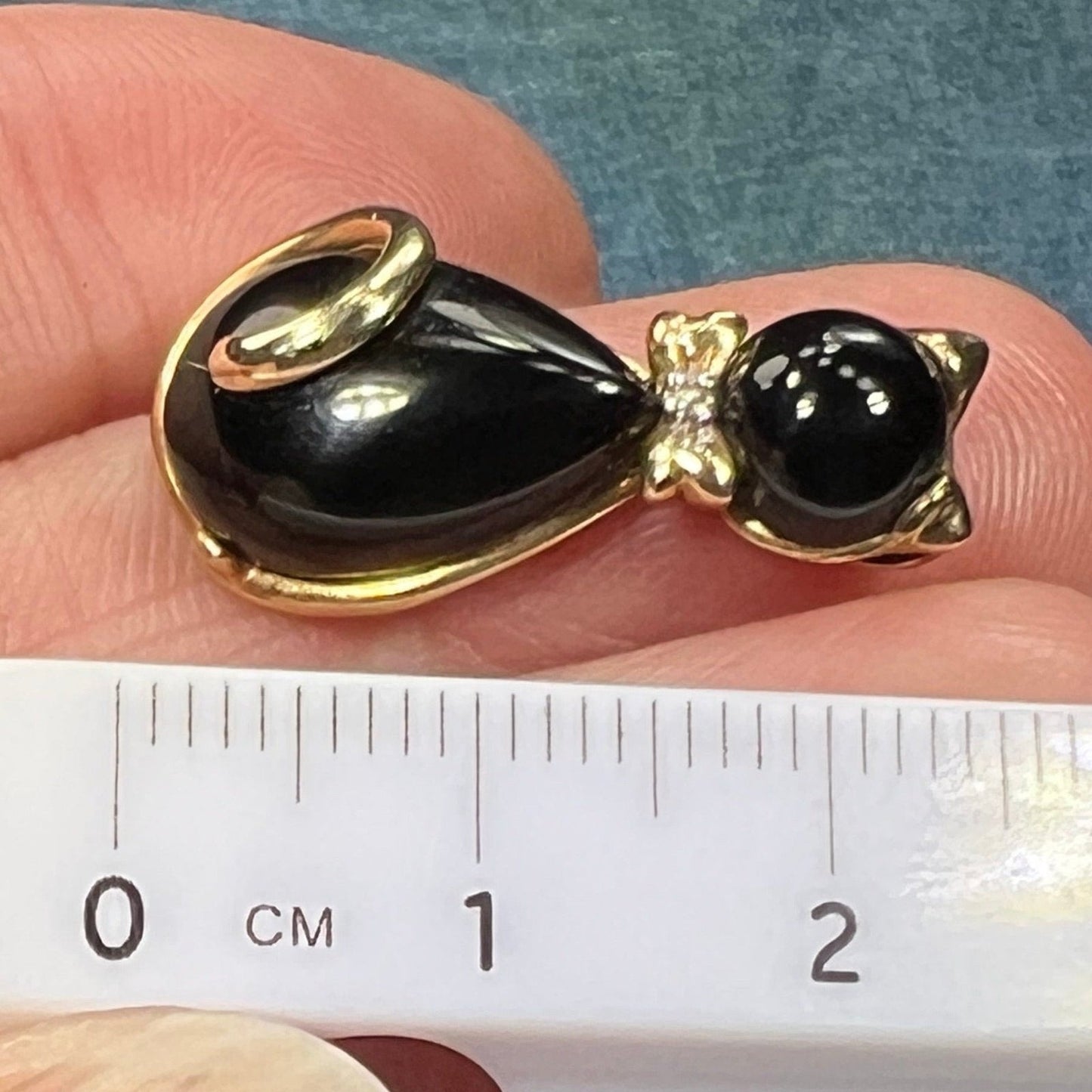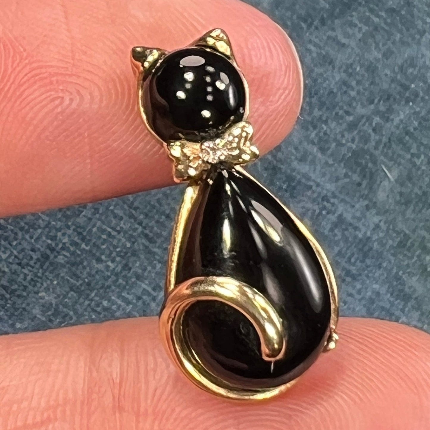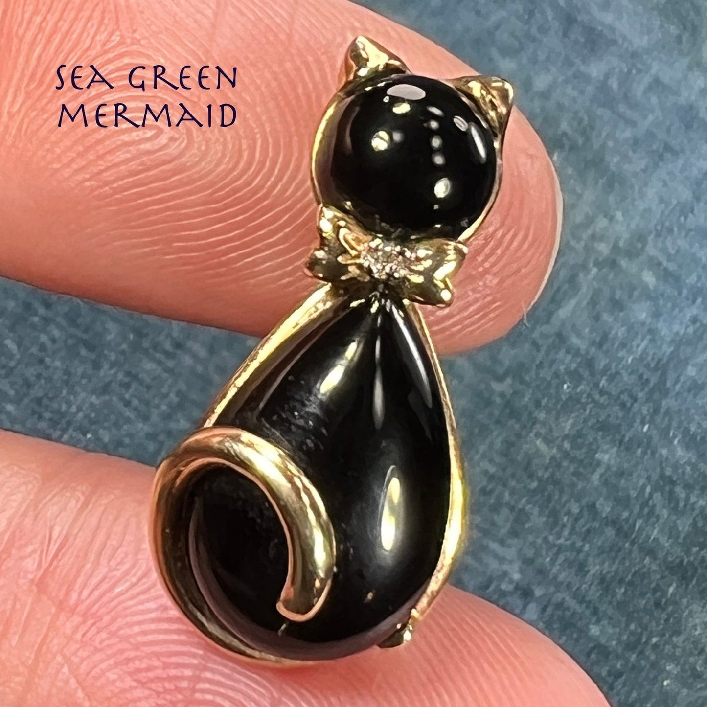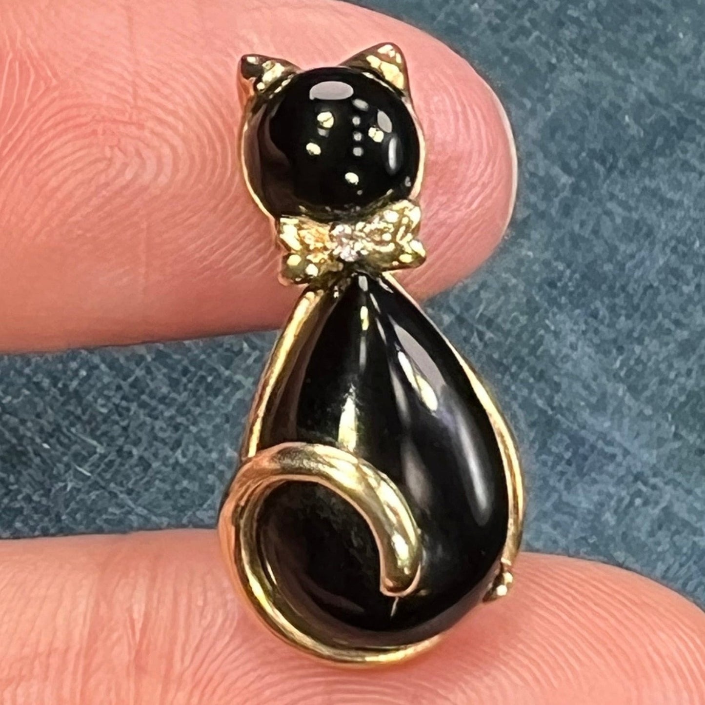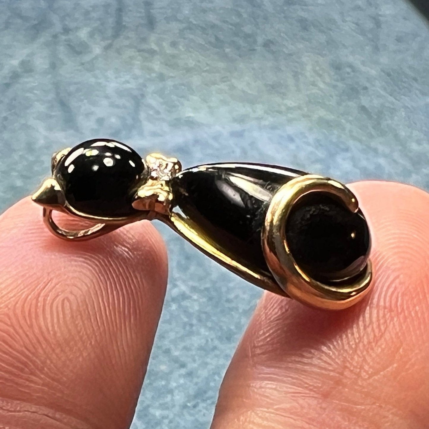 For sale is a 14k yellow gold and black onyx kitty cat pendant with a tiny diamond bow tie collar. The kitten has a round onyx cabochon for her head and another teardrop onyx cabochon for her body. Ms. Kitty has solid gold ears and an elegant tail curving over her belly. She wears a jaunty bow tie collar set with a teeny tiny diamond. The pendant has an hidden bail to accommodate your chain. This pussy cat pendant would look lovely on its own, or layered with other necklaces. Perfect for the cat lover!