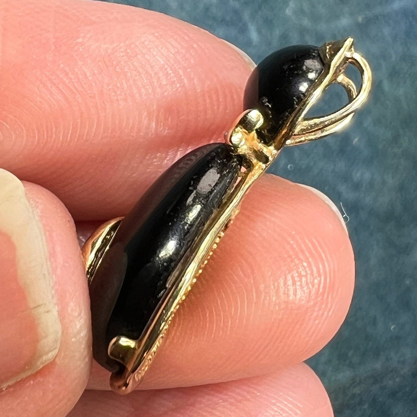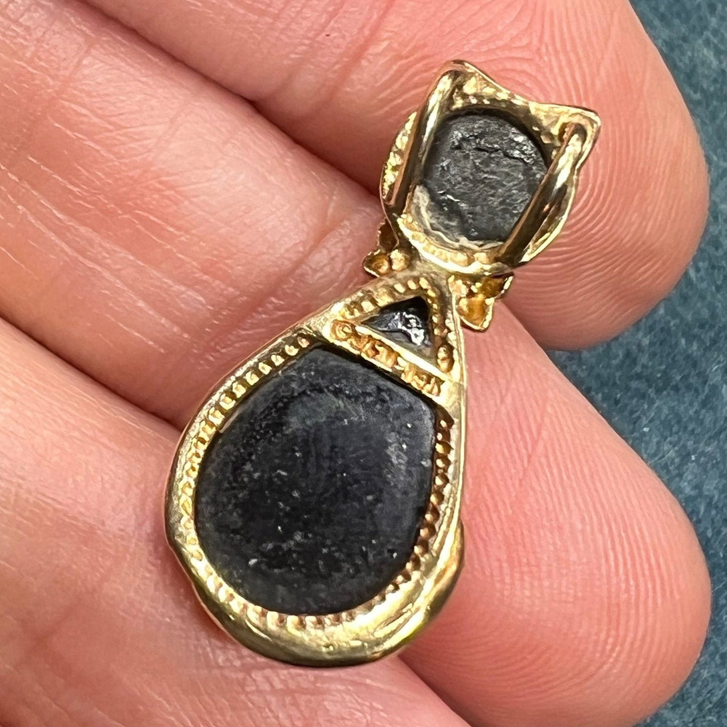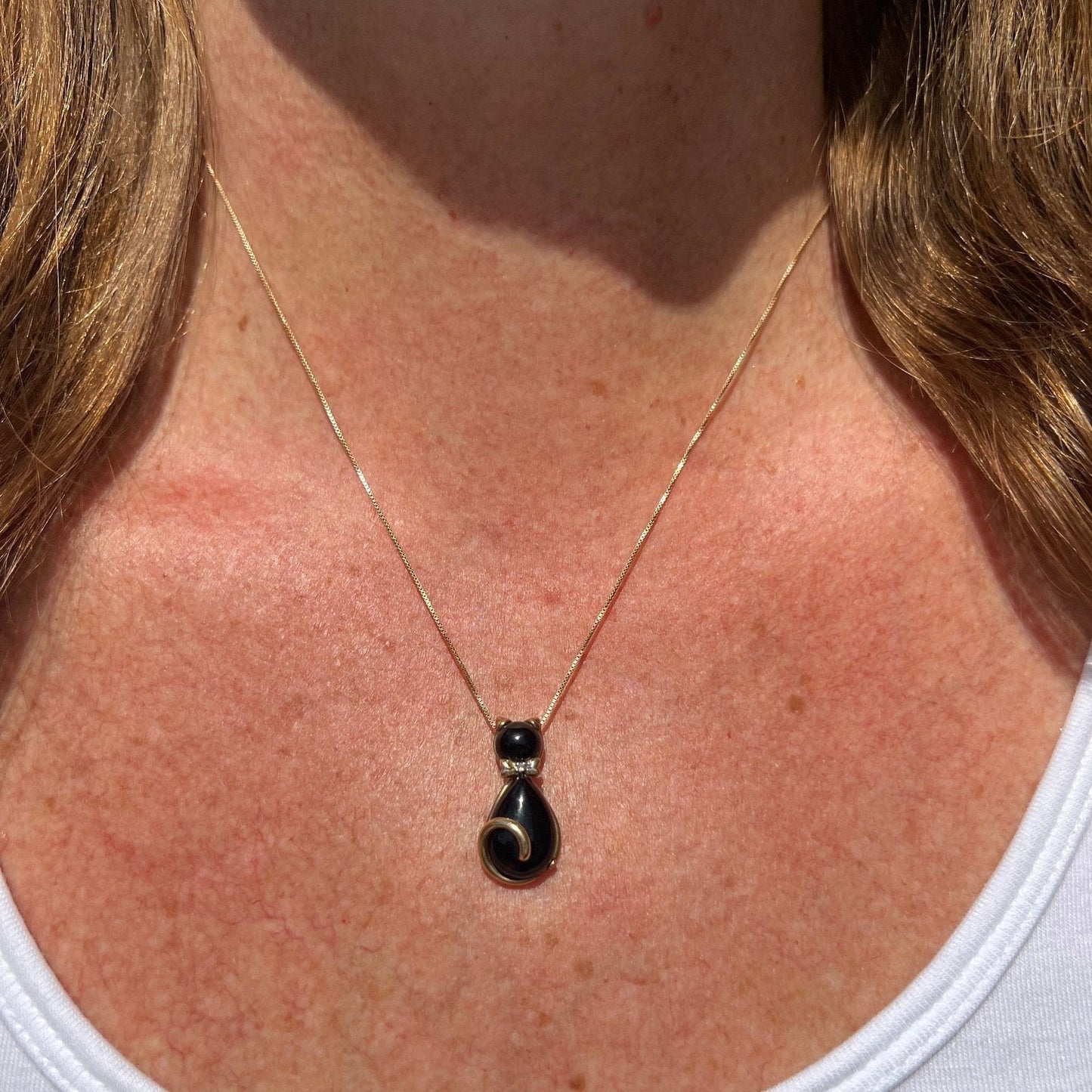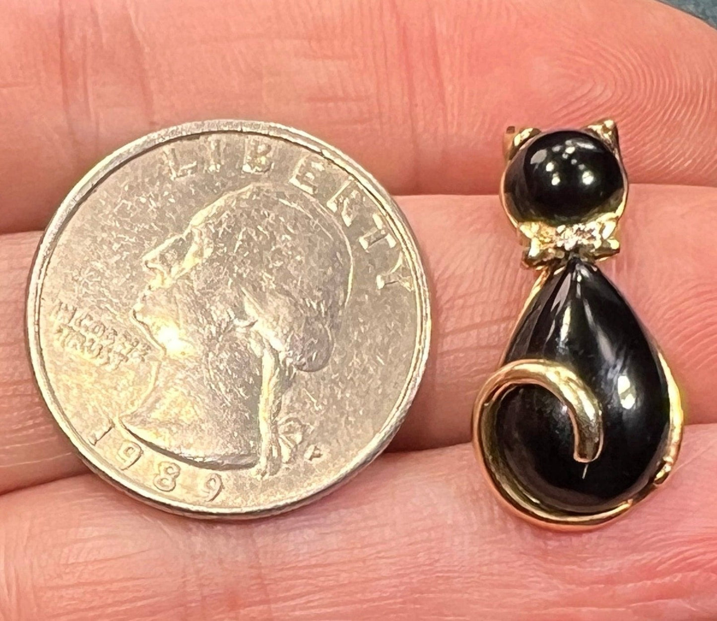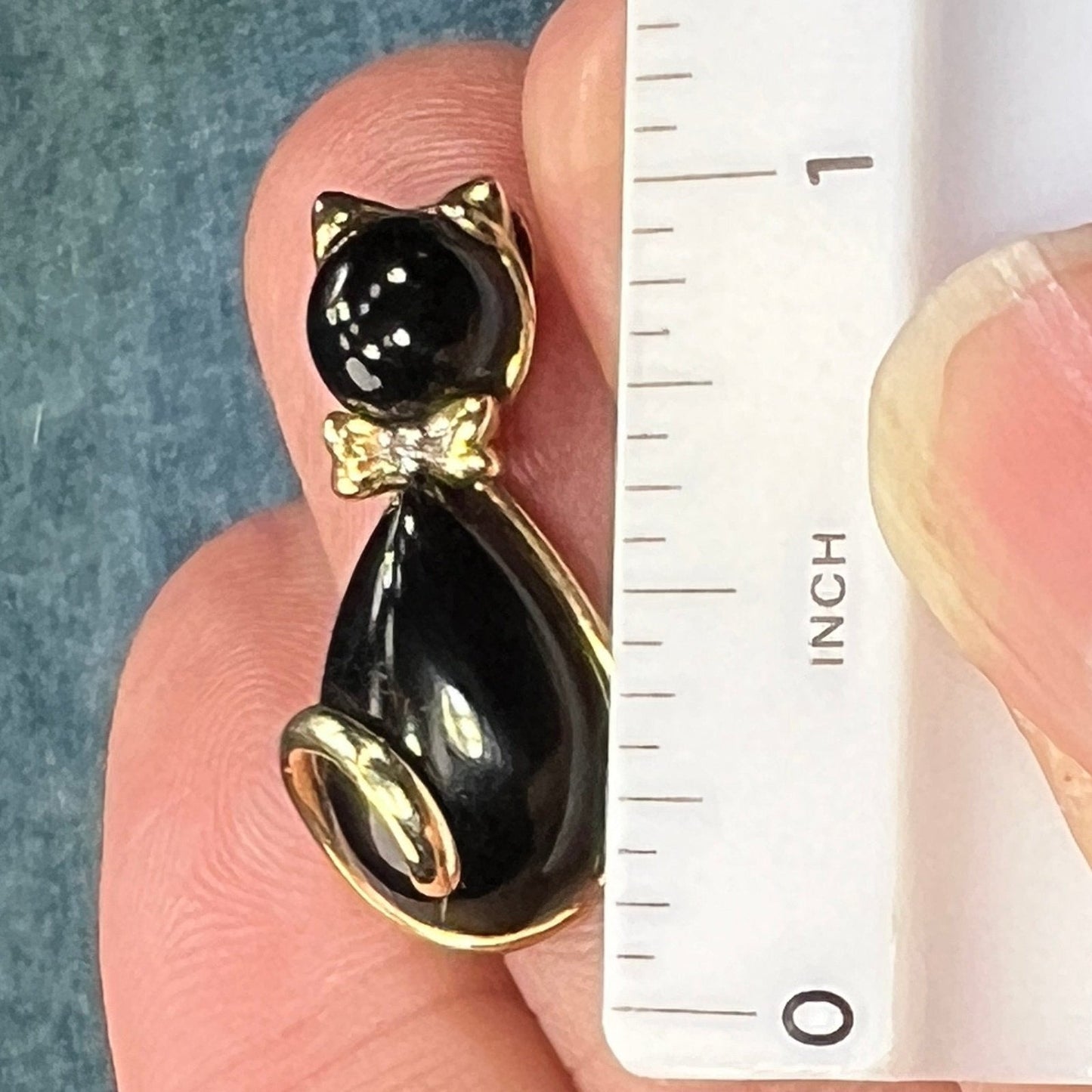 For sale is a 14k yellow gold and black onyx kitty cat pendant with a tiny diamond bow tie collar. The kitten has a round onyx cabochon for her head and another teardrop onyx cabochon for her body. Ms. Kitty has solid gold ears and an elegant tail curving over her belly. She wears a jaunty bow tie collar set with a teeny tiny diamond. The pendant has an hidden bail to accommodate your chain. This pussy cat pendant would look lovely on its own, or layered with other necklaces. Perfect for the cat lover!