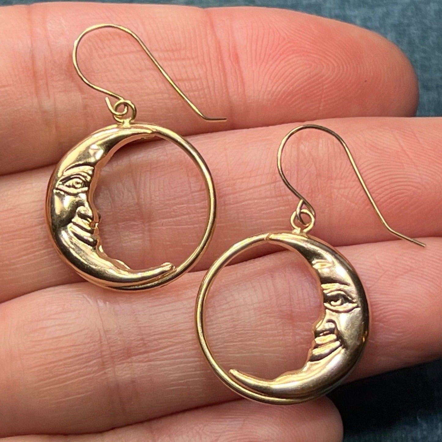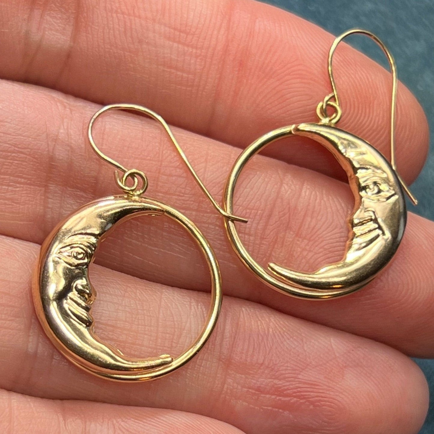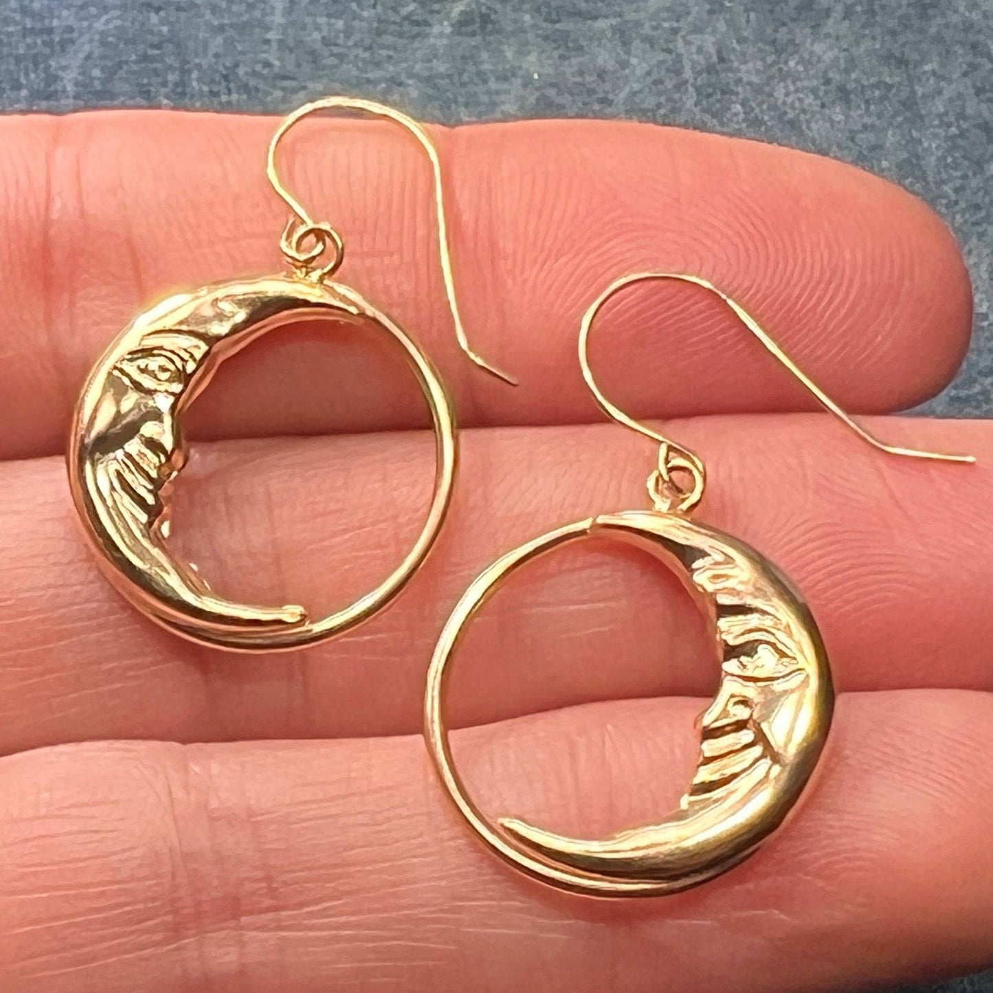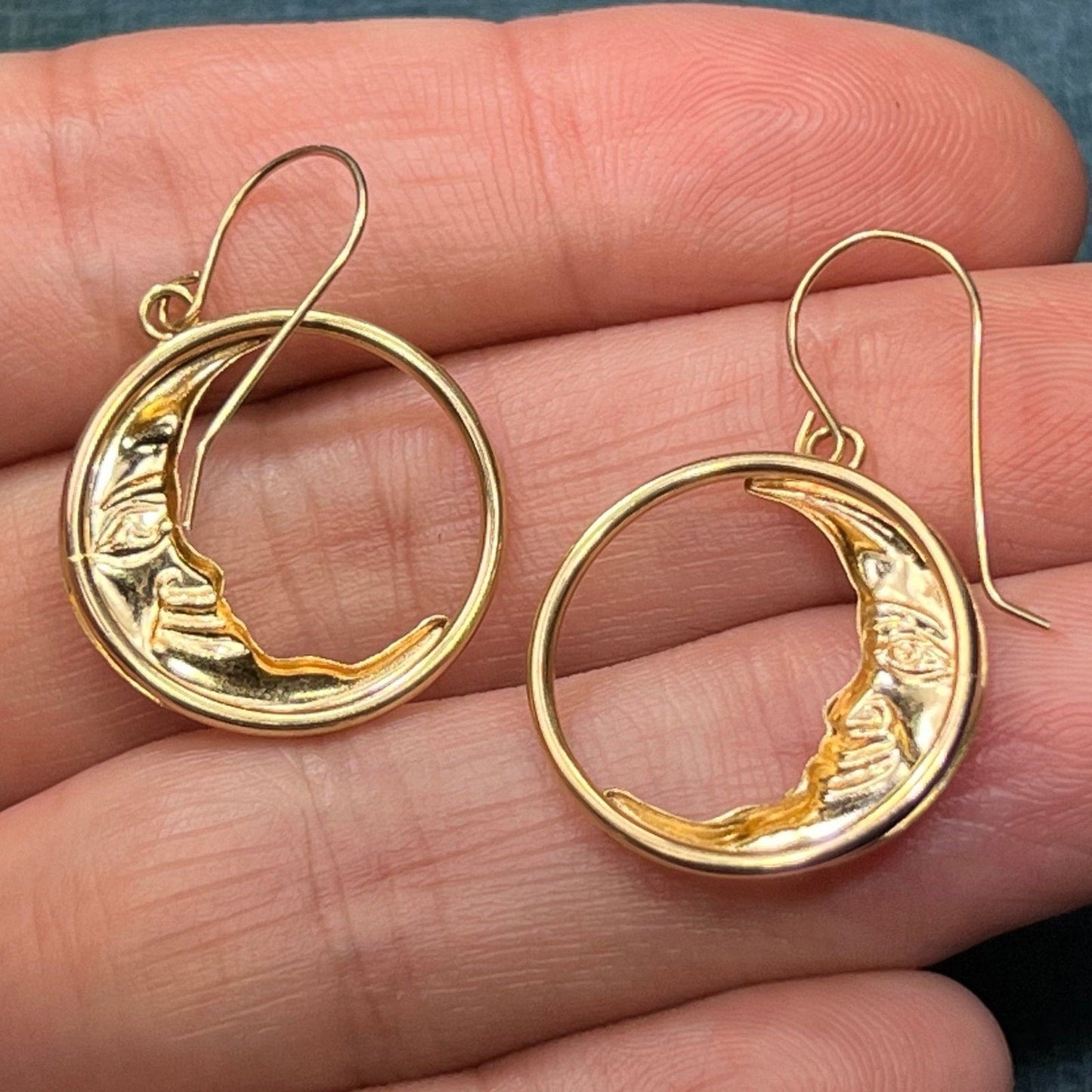 14k Yellow Gold Crescent "Man in the Moon" Circle Earrings. 1.25"