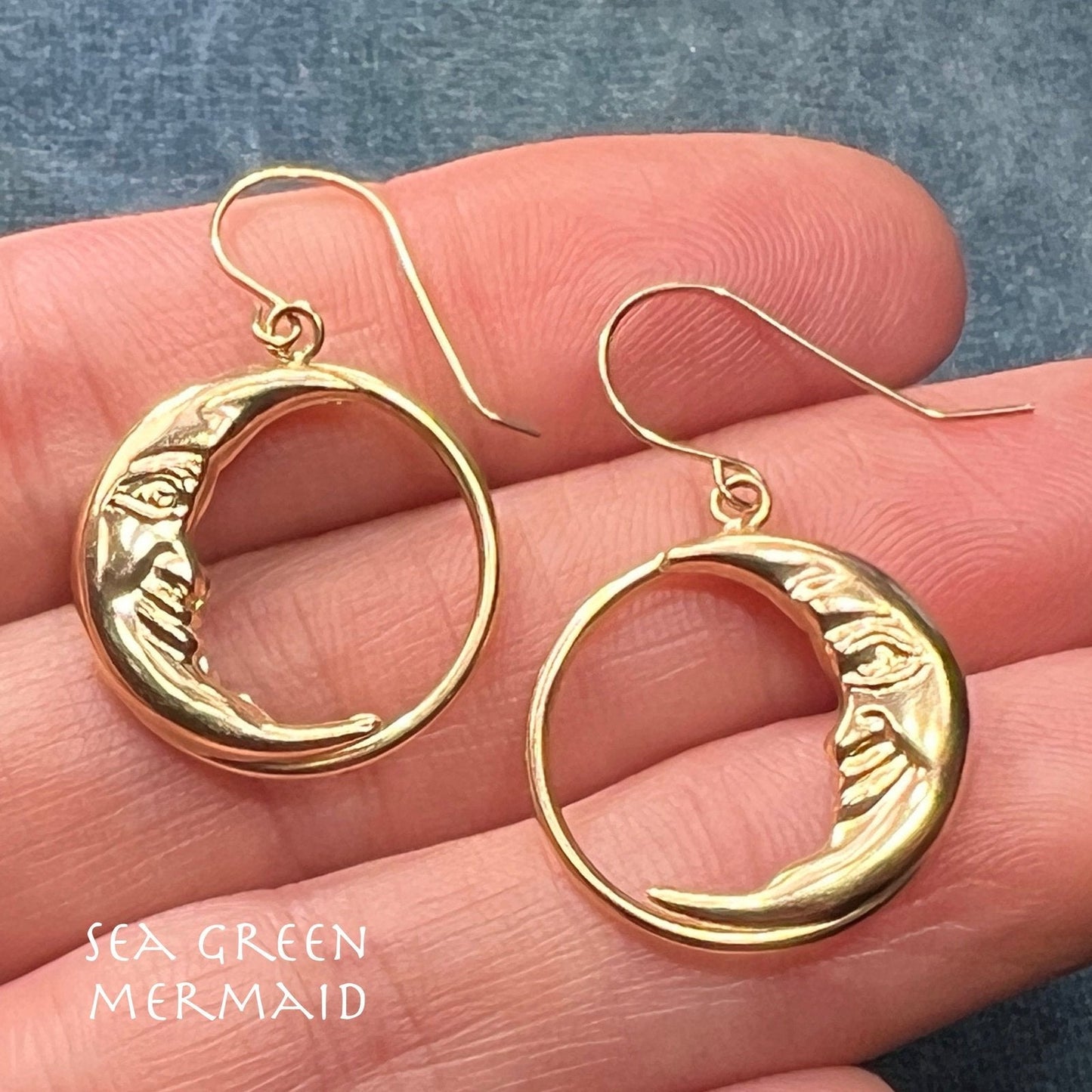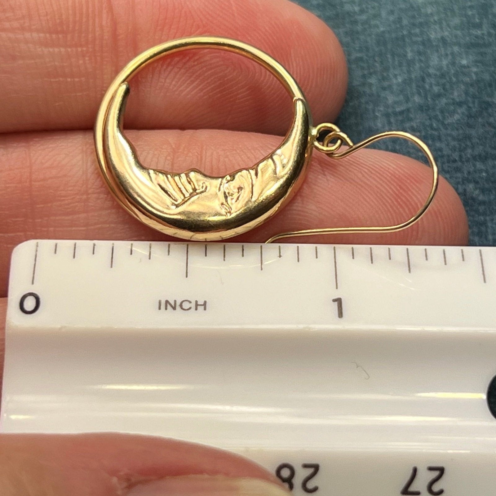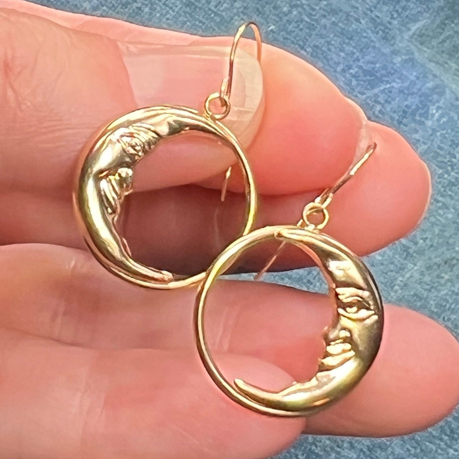 14k Yellow Gold Crescent "Man in the Moon" Circle Earrings. 1.25"