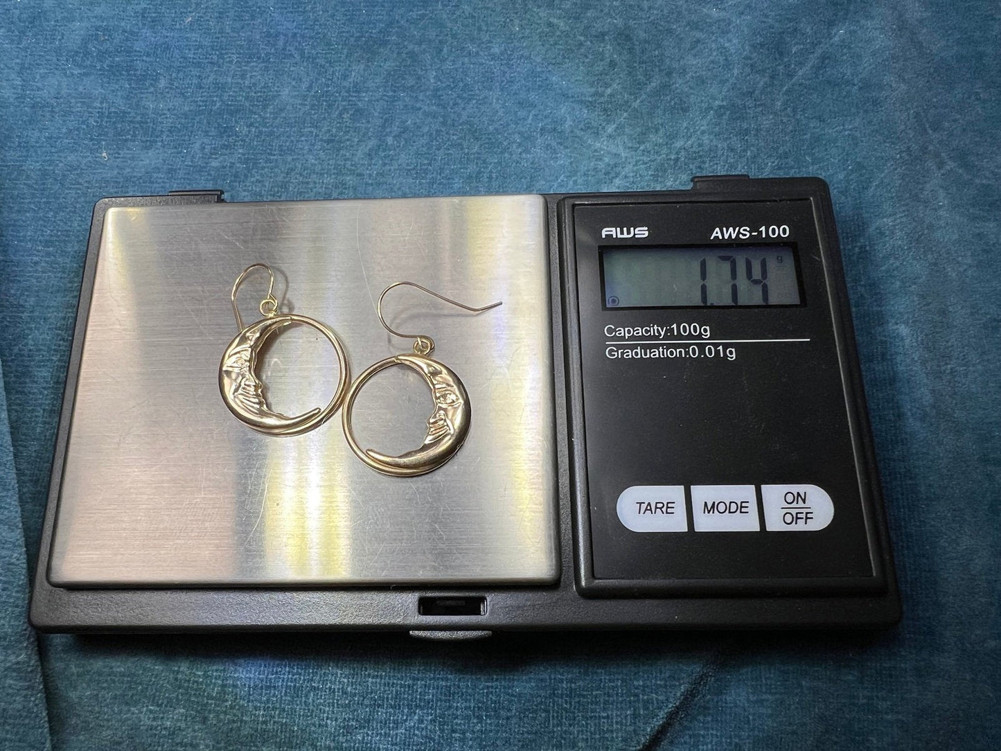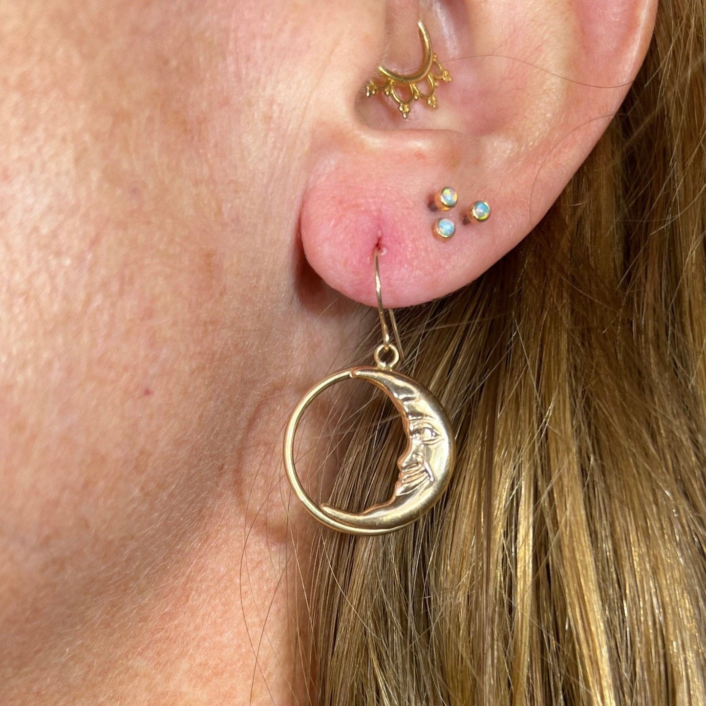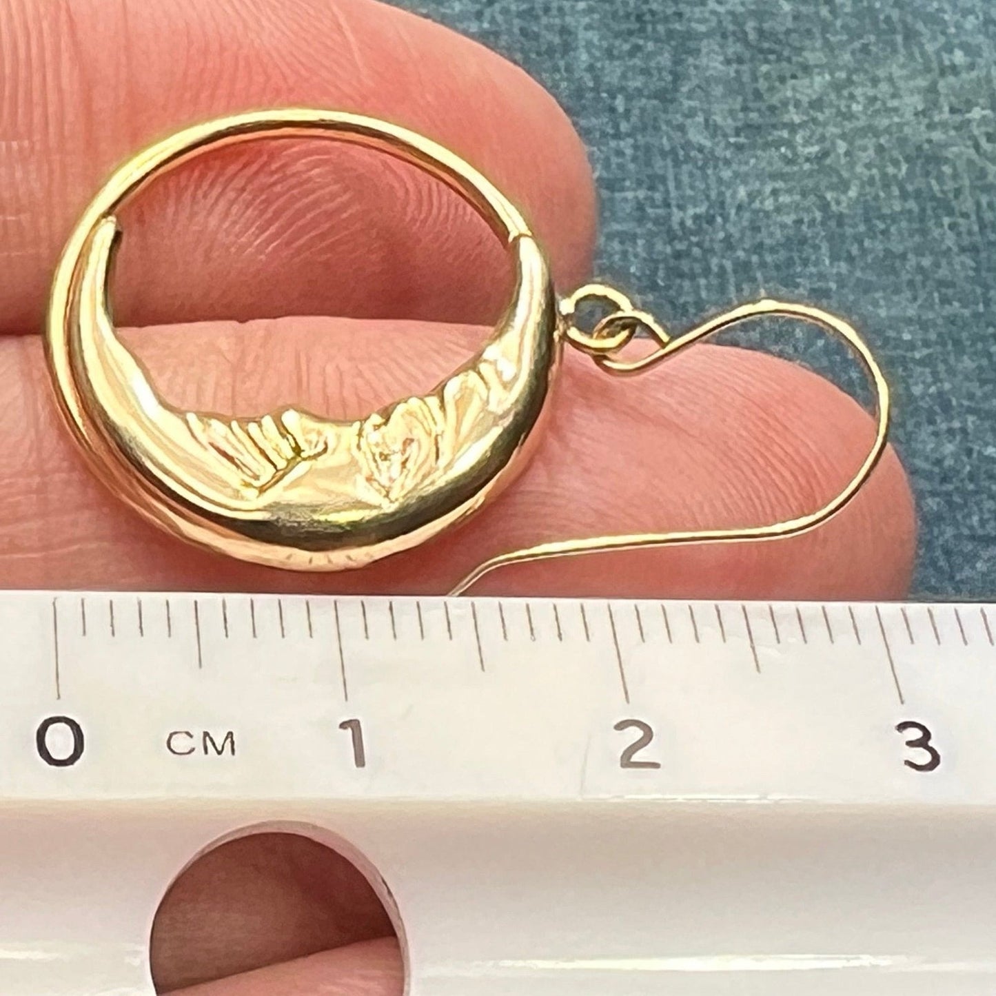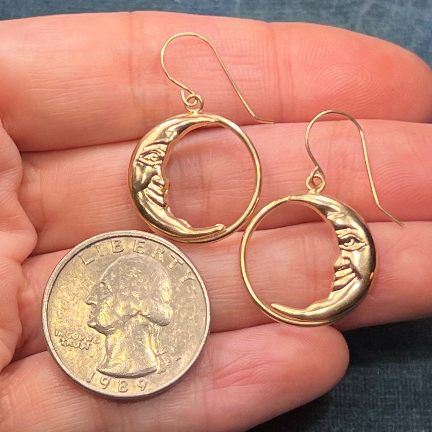 14k Yellow Gold Crescent "Man in the Moon" Circle Earrings. 1.25"