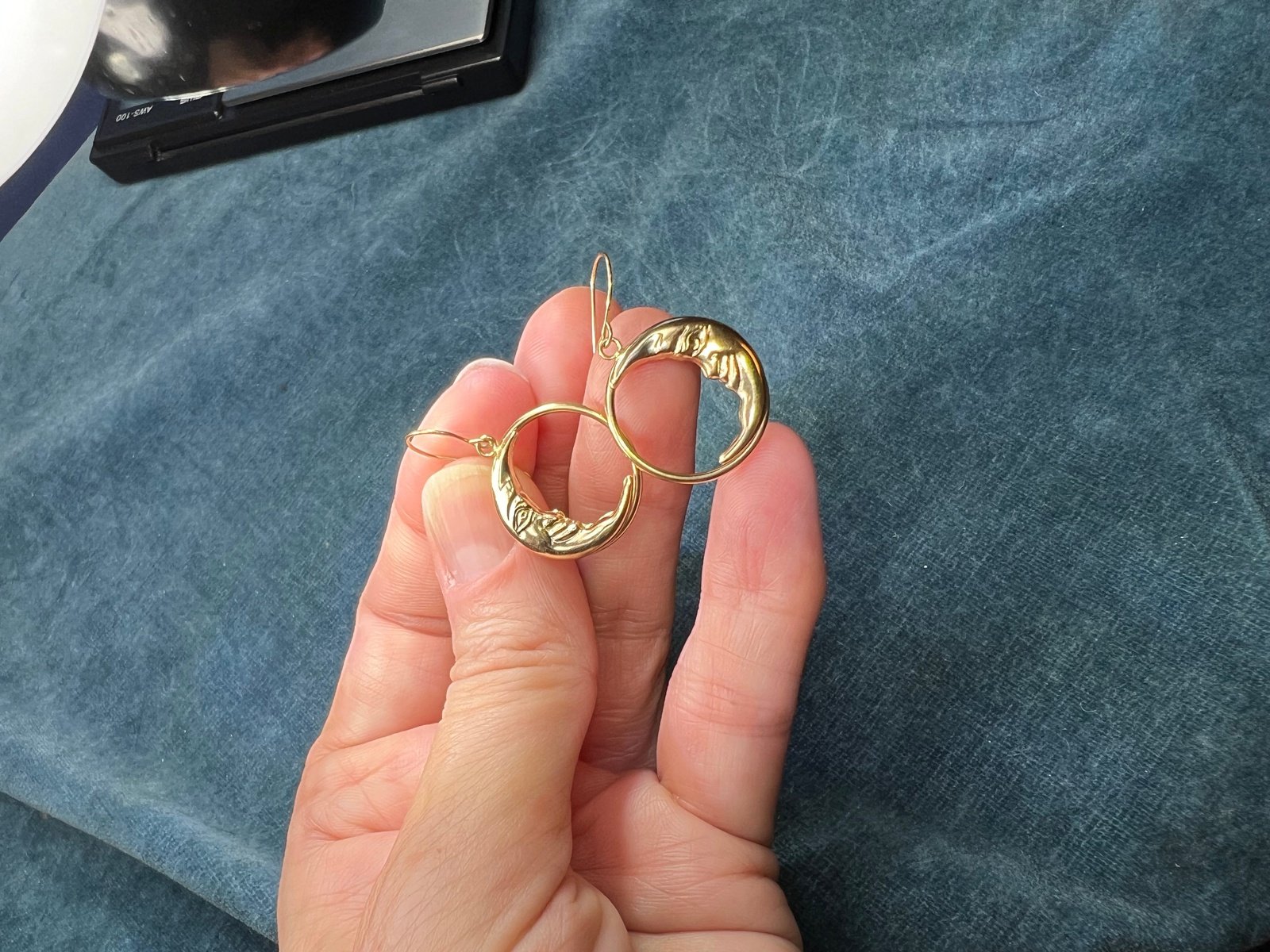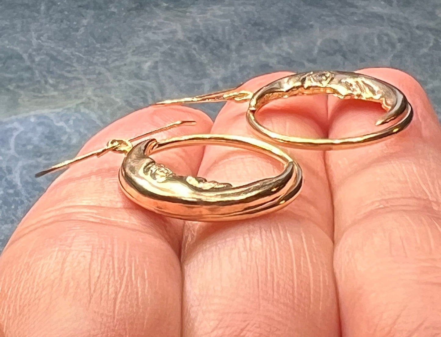 These 14k yellow gold crescent moon earrings are fun and playful, and will add some good celestial energy to your day. Each "puffy" circle is a sturdy, hollow tube of gold. One side of each circle widens into a crescent "man in the moon" face. The moons each have a smiling, gleeful face with detailed eyes, nose, and mouth.