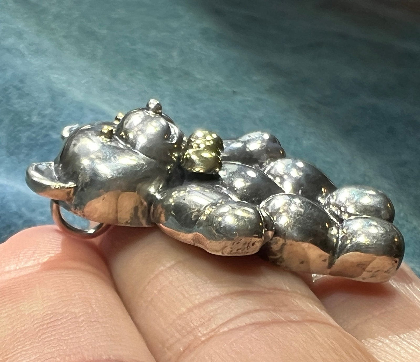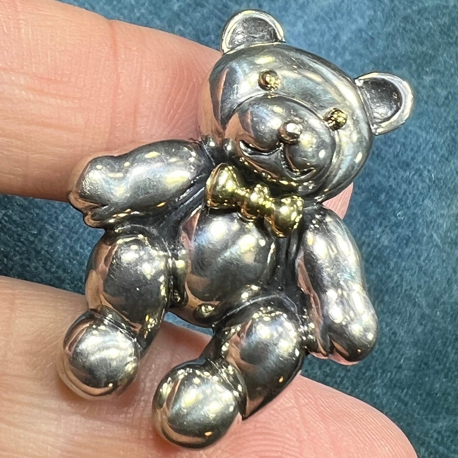 For sale is a sterling silver teddy bear pendant with 18k yellow gold accents. This large, heavy pendant is beautifully crafted and sturdy. The chubby teddy bear stands slightly awkwardly with her arms at her sides. Her belly, arms, legs and paws are nicely rounded and pleasantly plump. She smiles slightly, in a friendly way. She has a sweet round muzzle and small curving ears. The silver teddy bear has raised 18k yellow gold eyes, nose and bow tie. The pendant has a hidden bail in back to accommodate your gold or silver chain. The pendant is stamped both "Sterling" and "18k." This pendant is one of a kind! I had my jeweler convert it from an antique brooch.