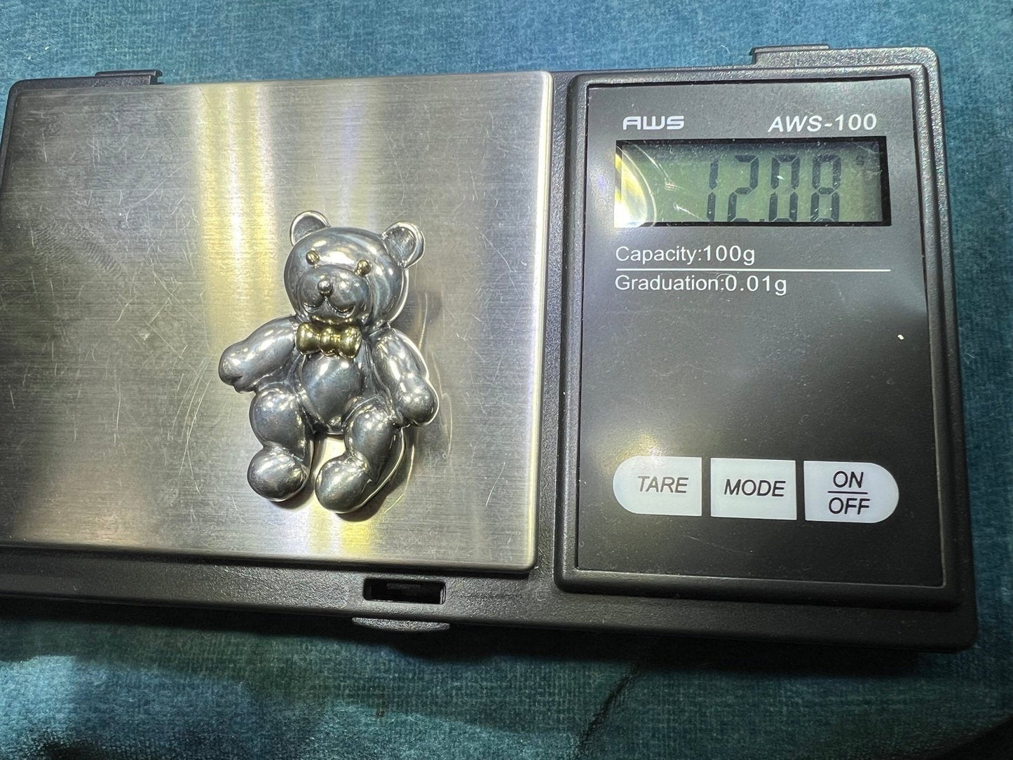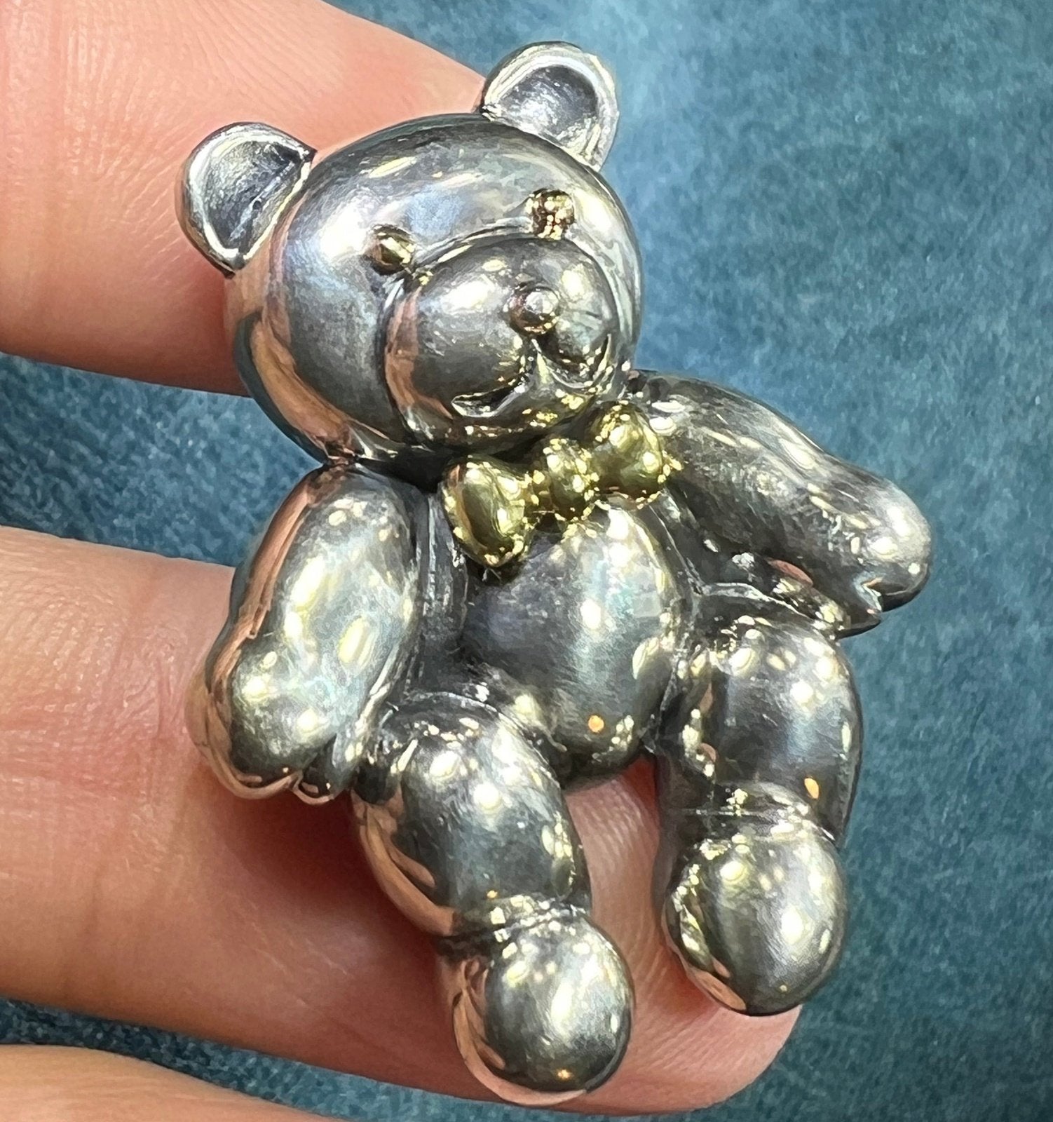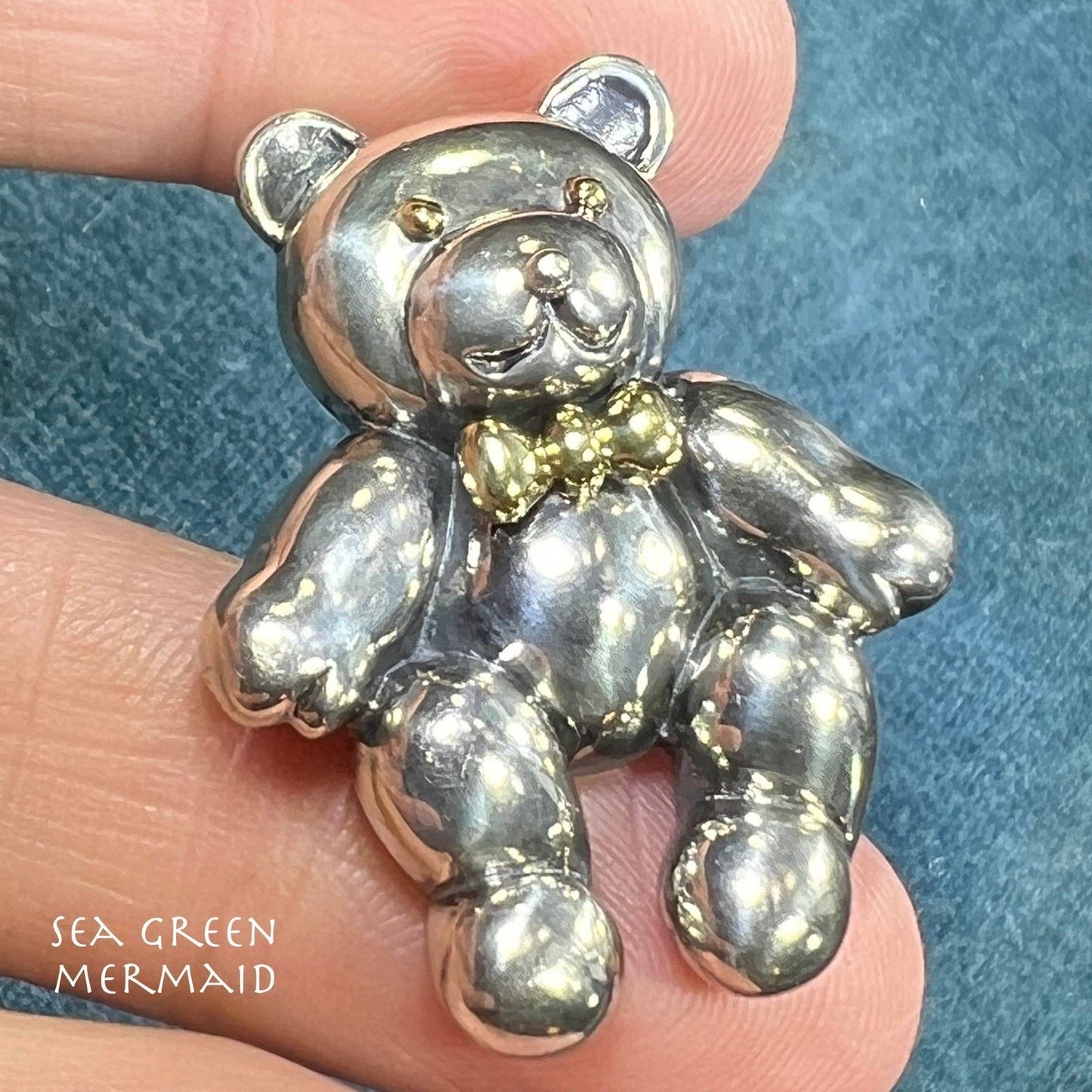18k Yellow Gold + Sterling TEDDY BEAR Pendant. 1.4" + 12g