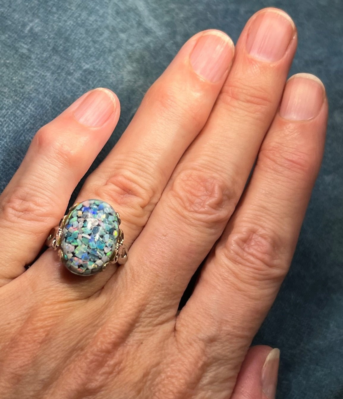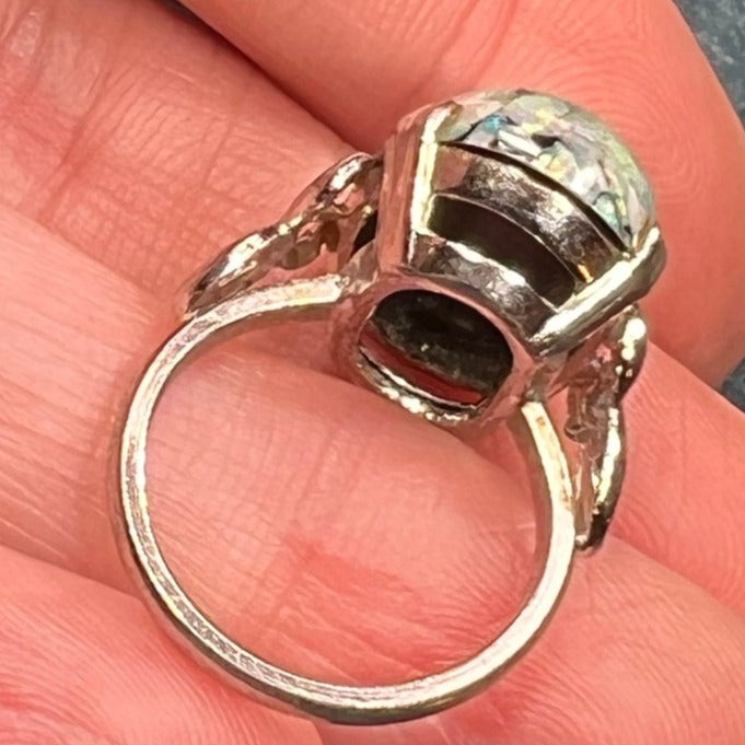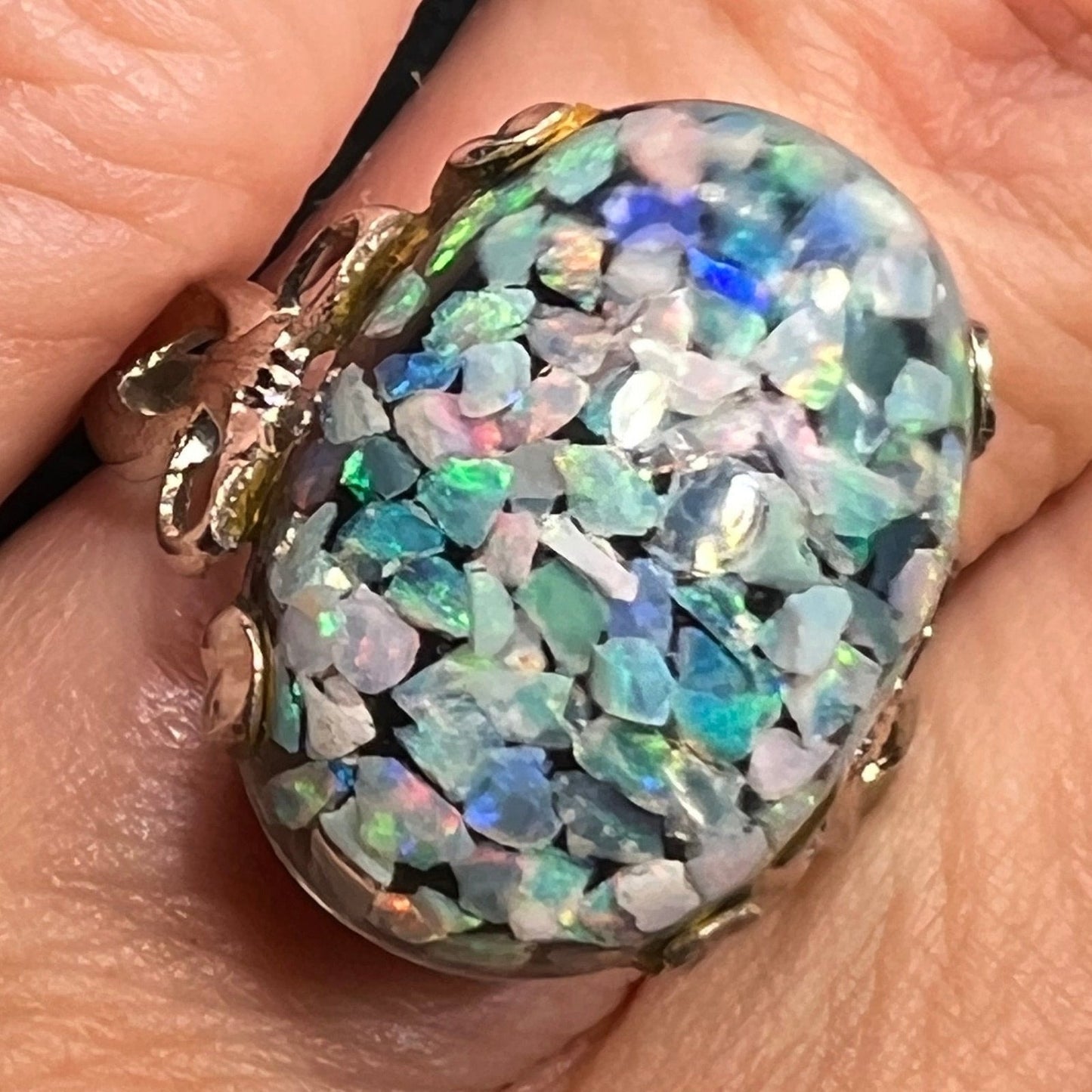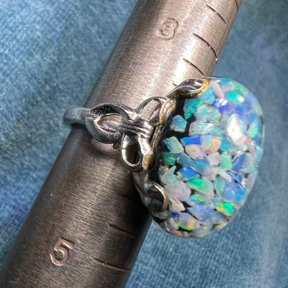 For sale is a sterling silver ring with Australian jelly opals suspended in resin. This unusual ring was crafted in the 1950s. The Australian jelly opals are suspended in a domed, oval bubble of clear resin and backed in dark black onyx. The black onyx creates a striking backdrop to display these iridescent gemstones. The opals flash with eerie, iridescent fire in a kaleidoscope of color. In particular, you will see lots of cherry red, tangerine, fuchsia and lime green fire. This magical opal ring is truly one-of-a-kind.