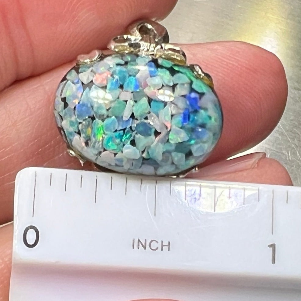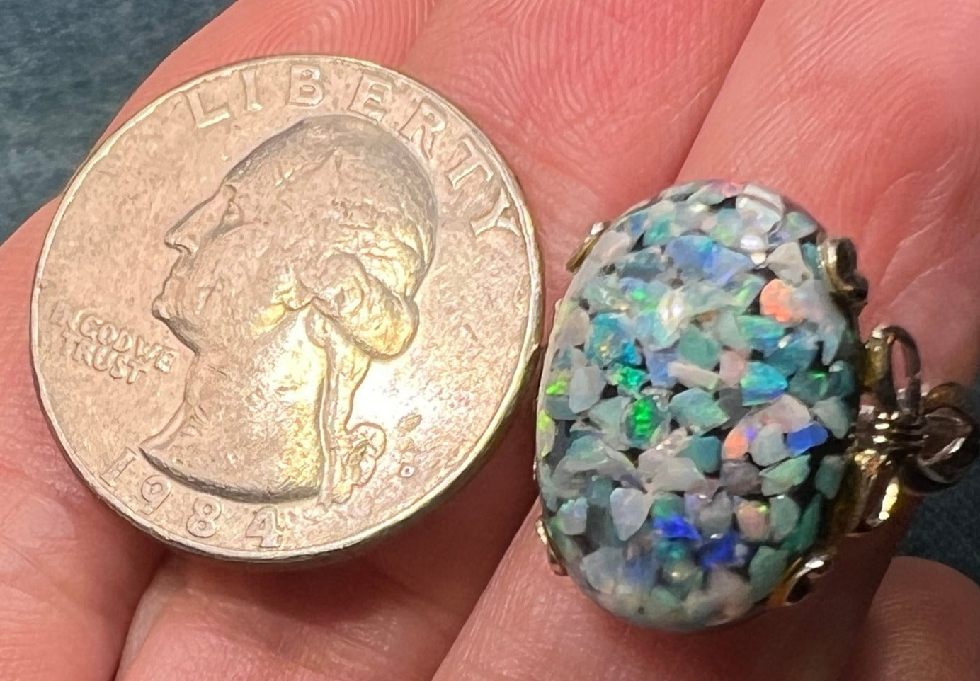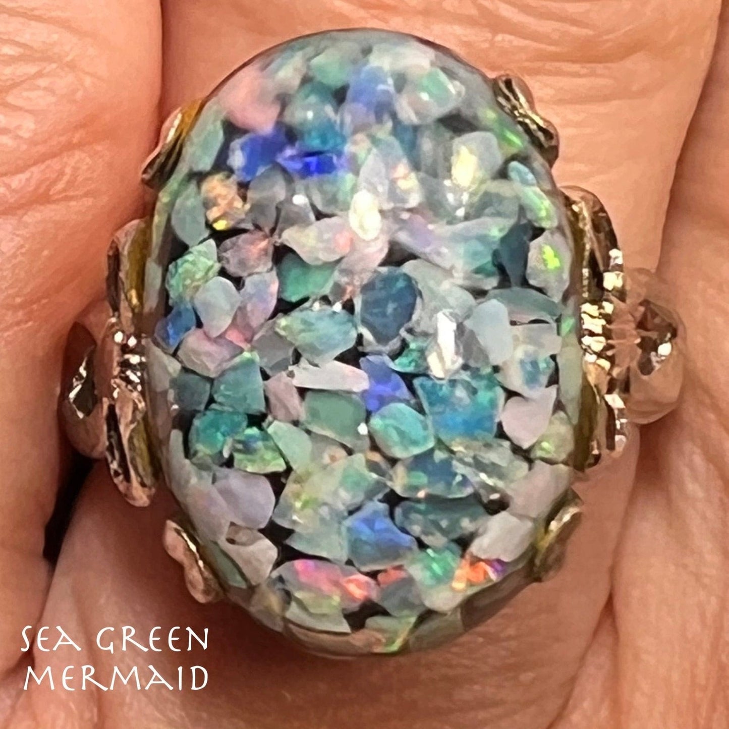 For sale is a sterling silver ring with Australian jelly opals suspended in resin. This unusual ring was crafted in the 1950s. The Australian jelly opals are suspended in a domed, oval bubble of clear resin and backed in dark black onyx. The black onyx creates a striking backdrop to display these iridescent gemstones. The opals flash with eerie, iridescent fire in a kaleidoscope of color. In particular, you will see lots of cherry red, tangerine, fuchsia and lime green fire. This magical opal ring is truly one-of-a-kind.