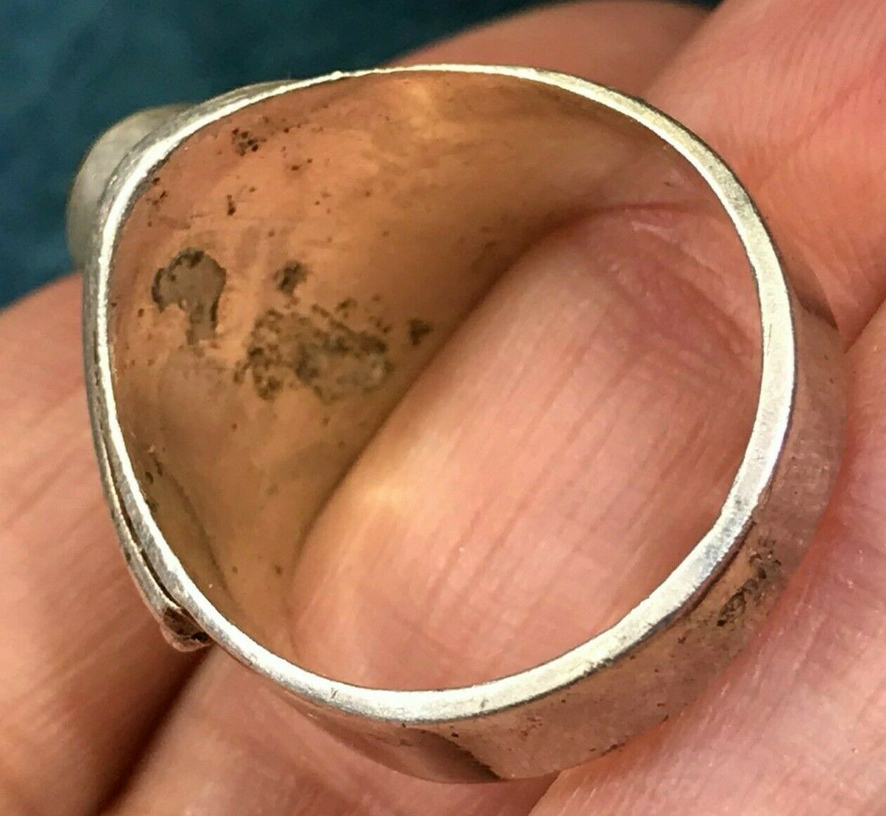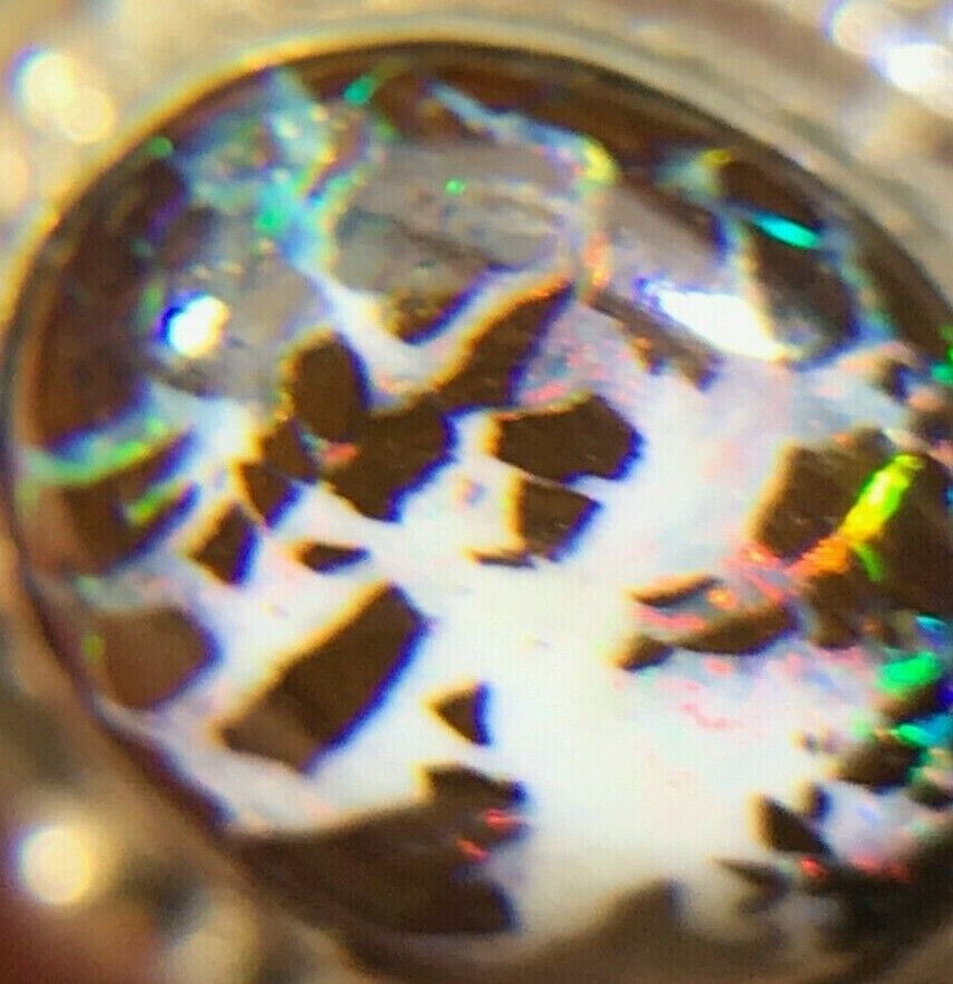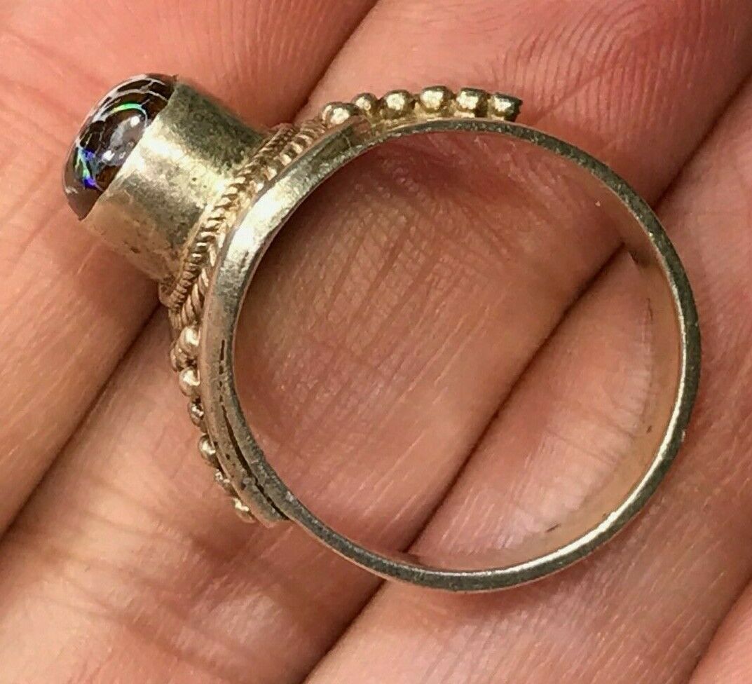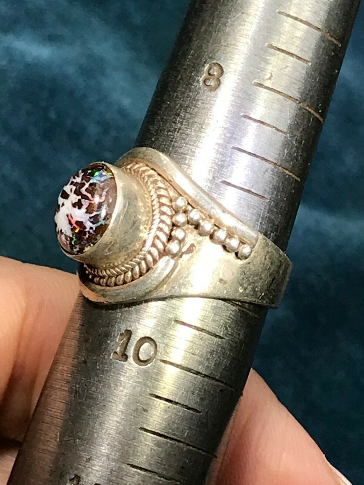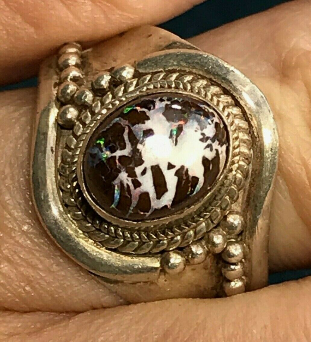 For sale is an Australian Koroit Boulder Opal ring in sterling silver. This opal was mined in the Koroit opal fields in a remote area near South West Queensland, Australia. The gemstone features jagged rivers of opalescence that run through boulder/matrix with a deep chocolate brown color. The opal is milky white at the center of the stone, and sparkles with colorful fire around the edges. The opal flashes with neon green, flame orange and red, as well as peacock blue around the edges of the stone. The opal is a domed oval, and is secure in a hand-crafted wide bezel-setting. The mounting is elaborately decorated with pyrope and Bali beads. The opal is backed in silver and the back of the stone is not visible. The ring has a high profile (see photos) and the opal stands several millimeters from the finger. This is a beautifully crafted, sturdy ring with a uniquely vibrant Koroit opal. It would be equally attractive on a man or a woman.