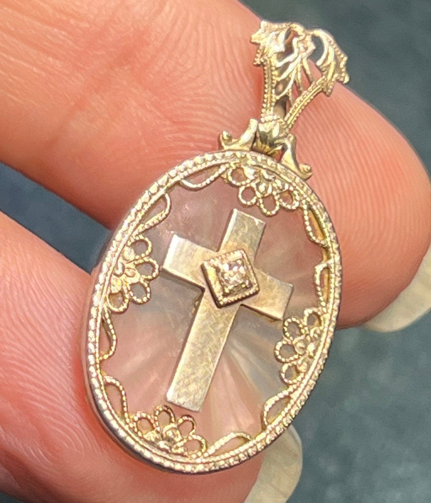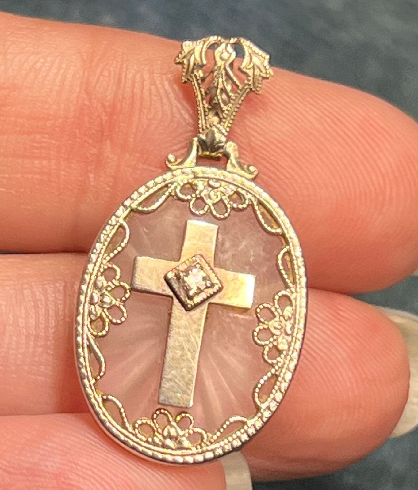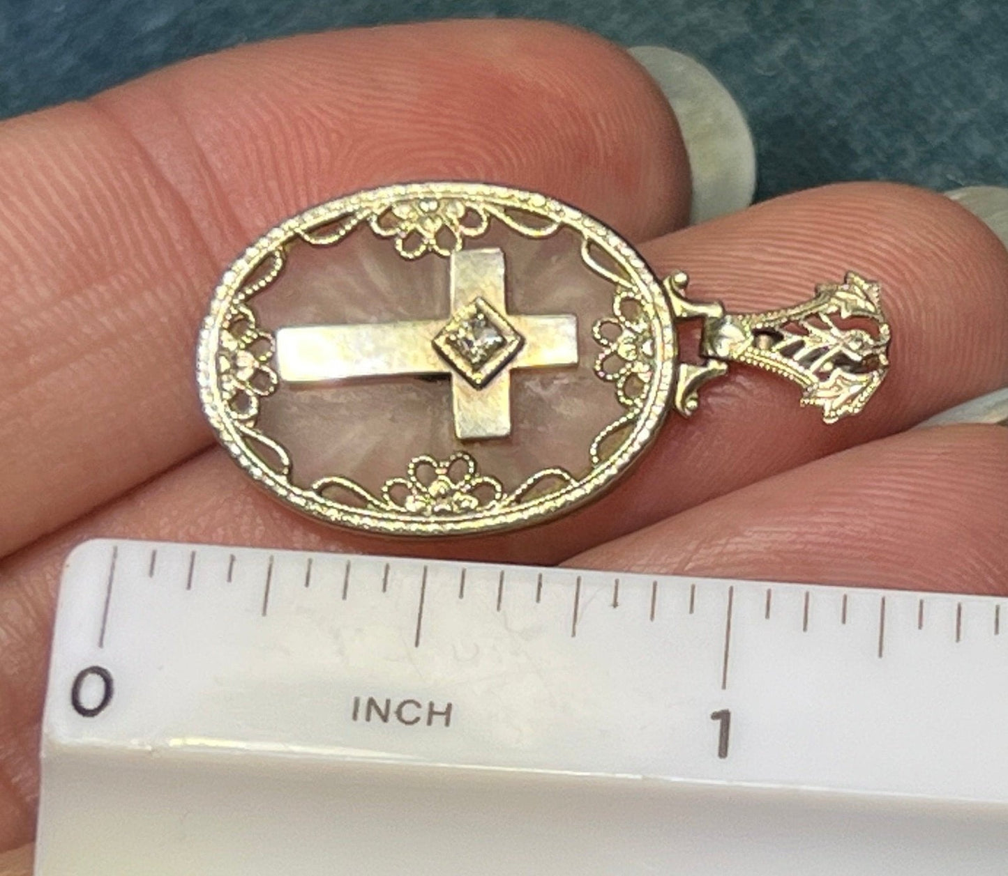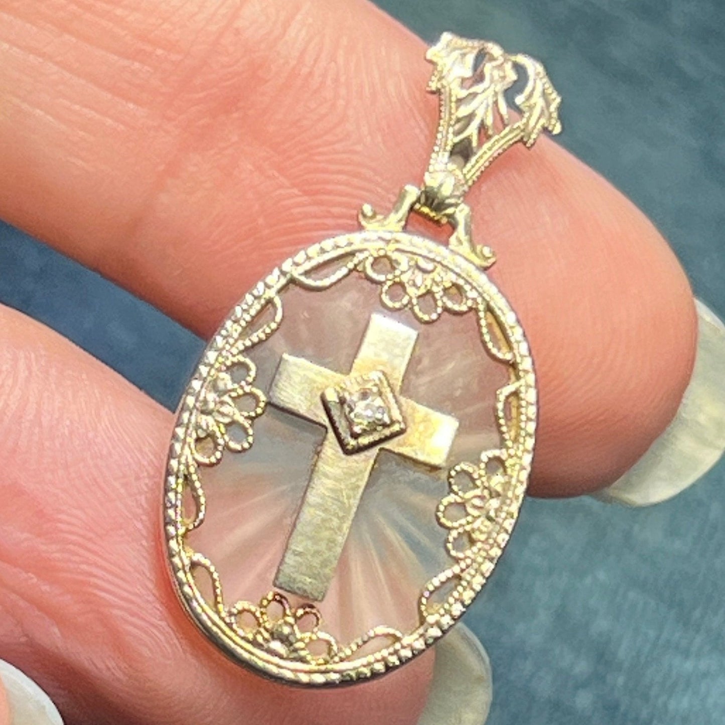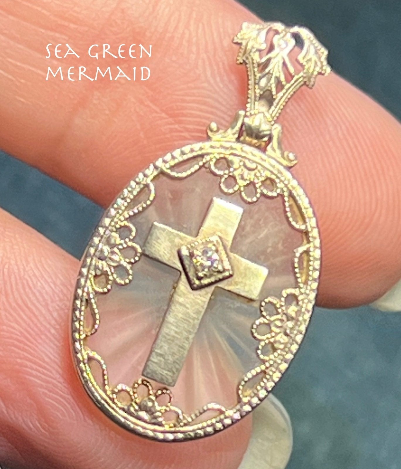 14k Gold Camphor Glass Filigree Cross Pendant w Diamond. Deco Star-burst