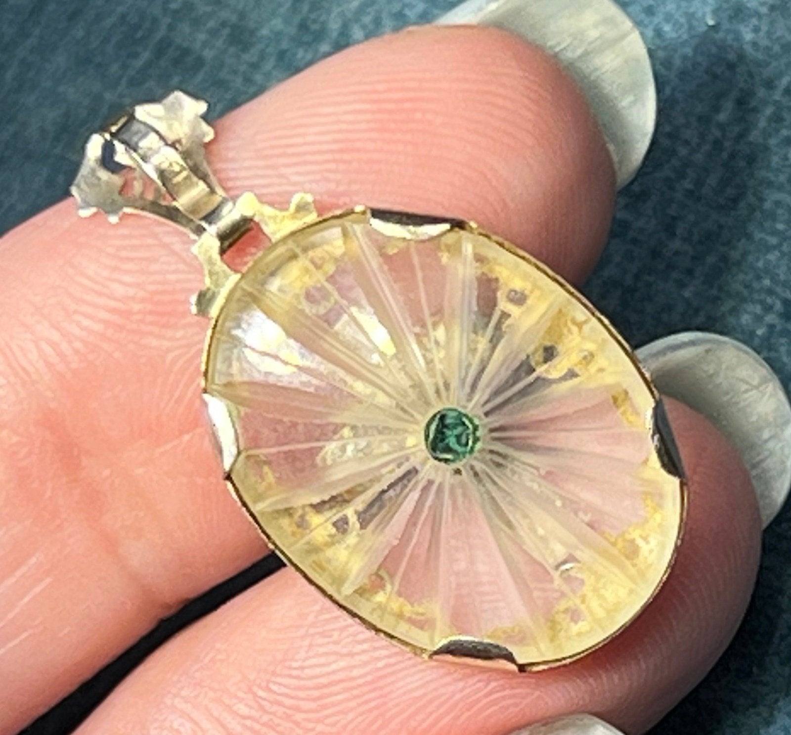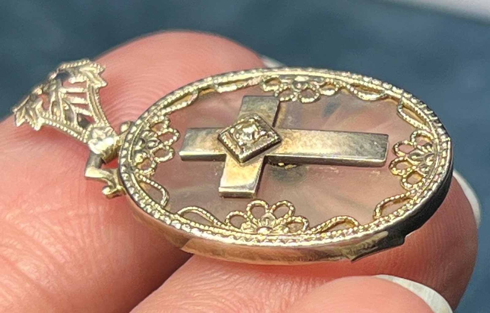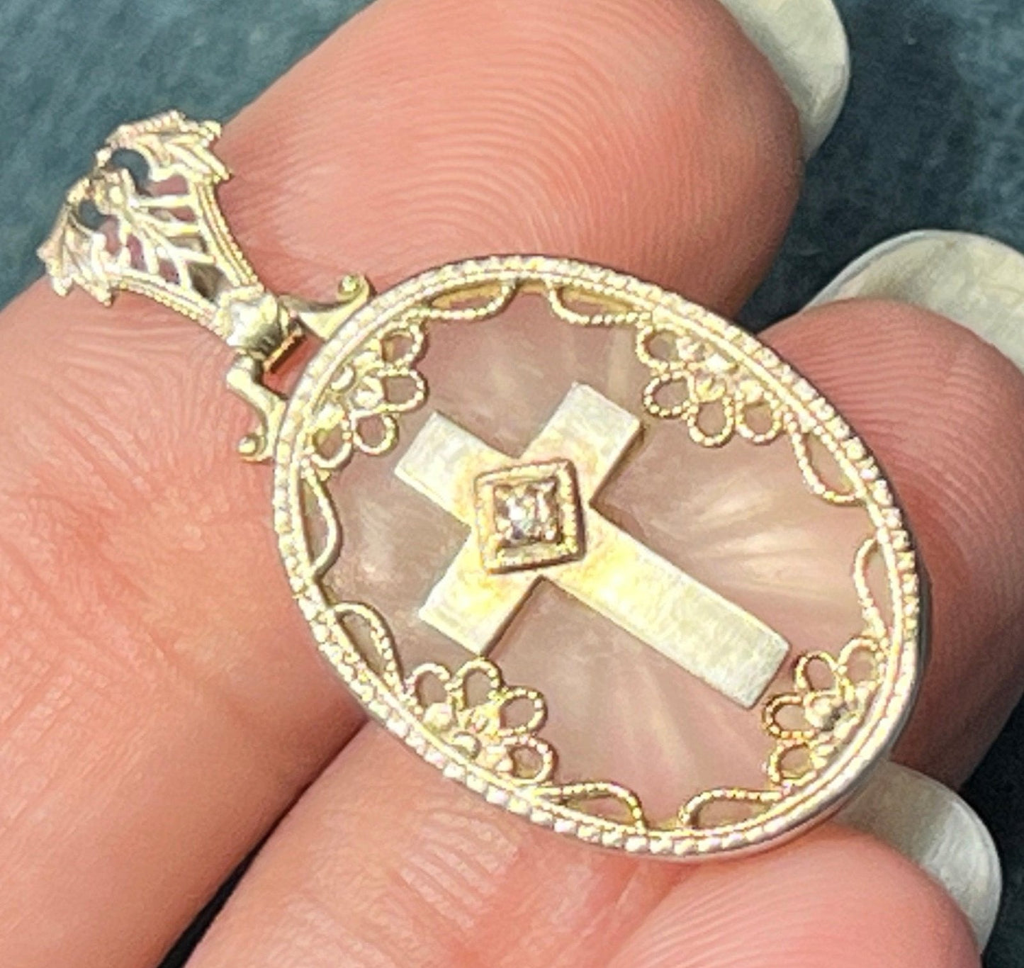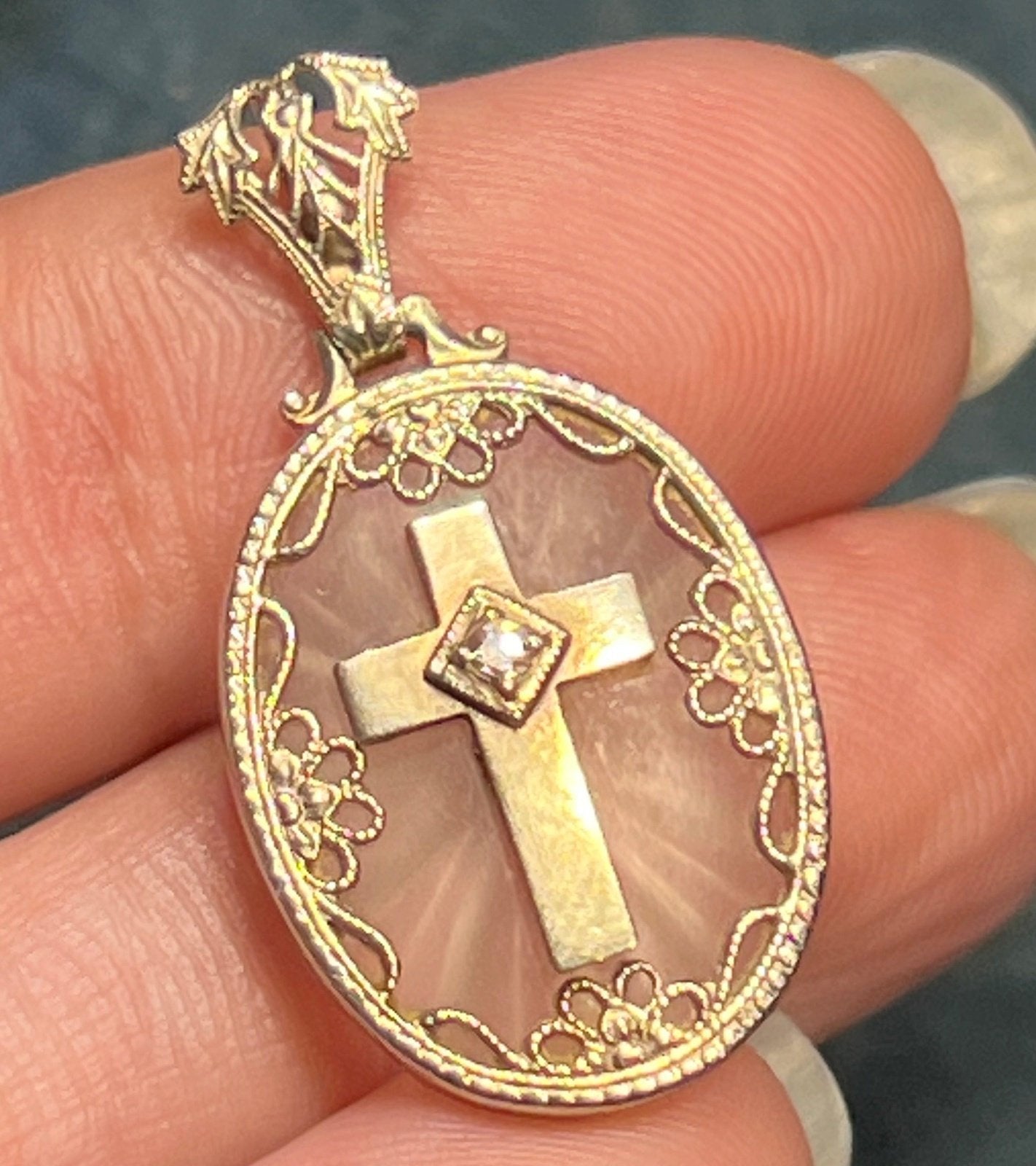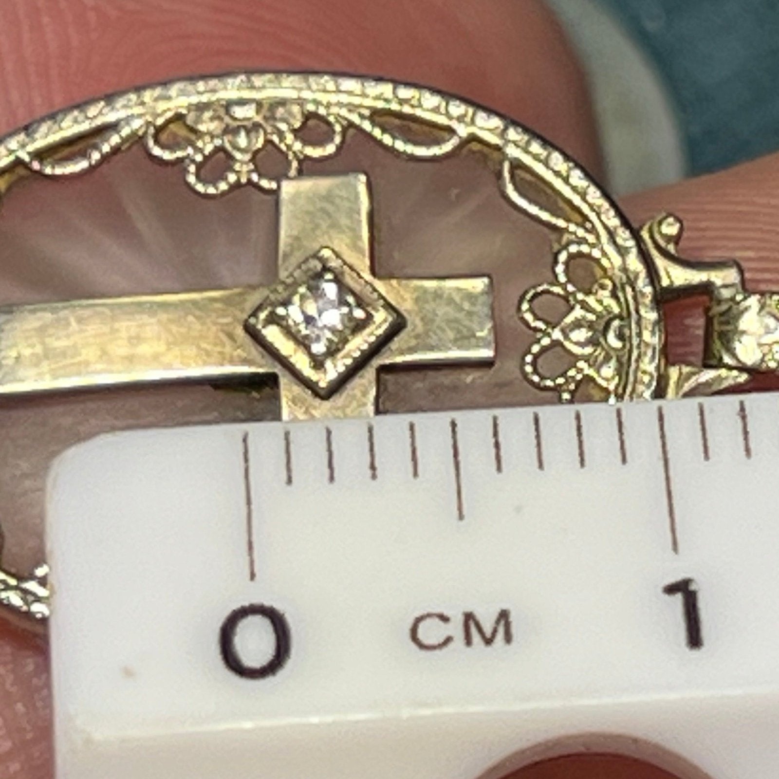 14k Gold Camphor Glass Filigree Cross Pendant w Diamond. Deco Star-burst