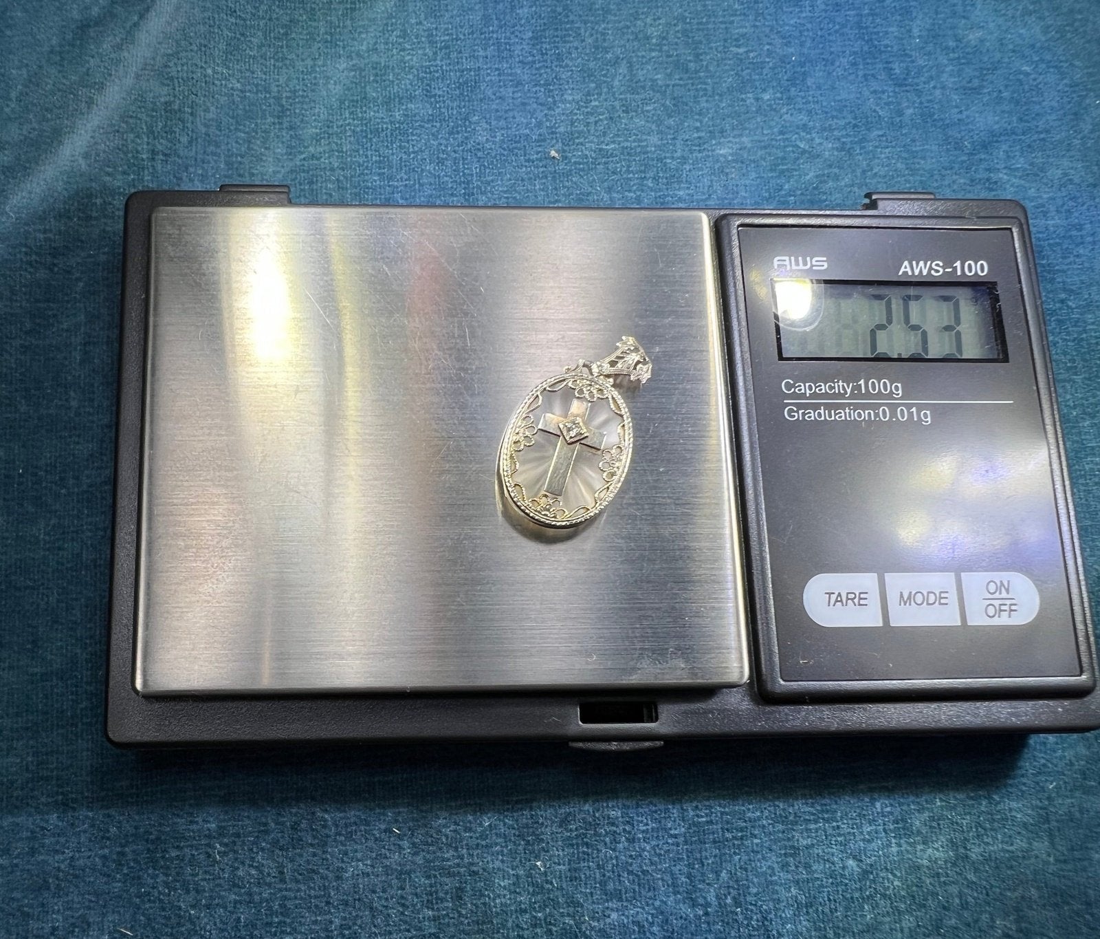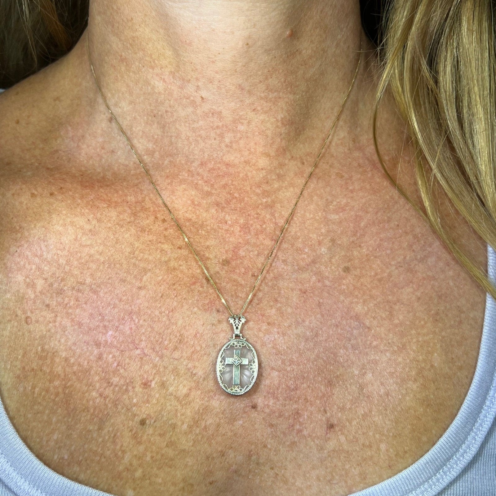 **The cross is technically yellow gold. However, the gold is very pale in color, almost like white gold. Please view photos for an accurate view.