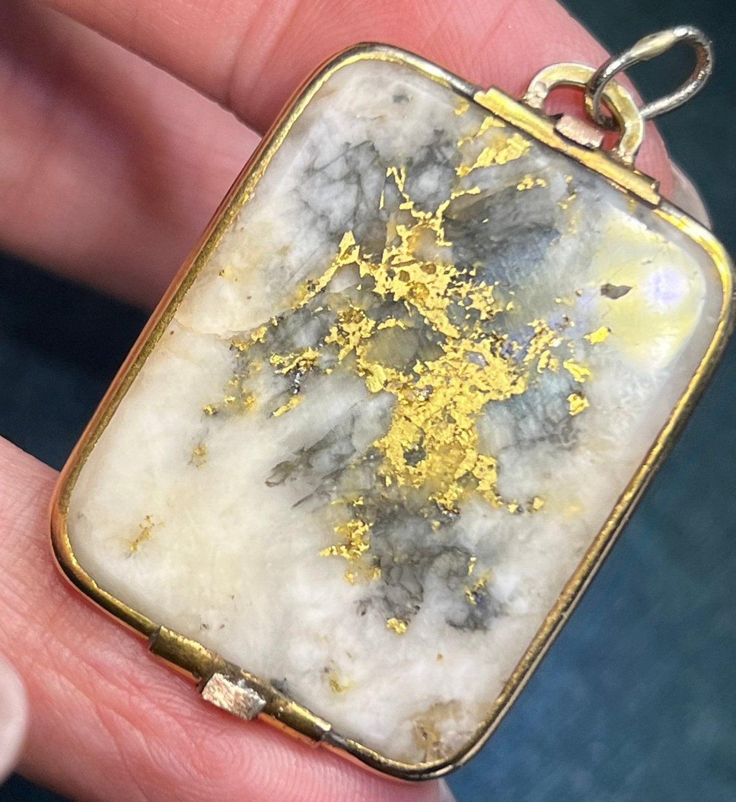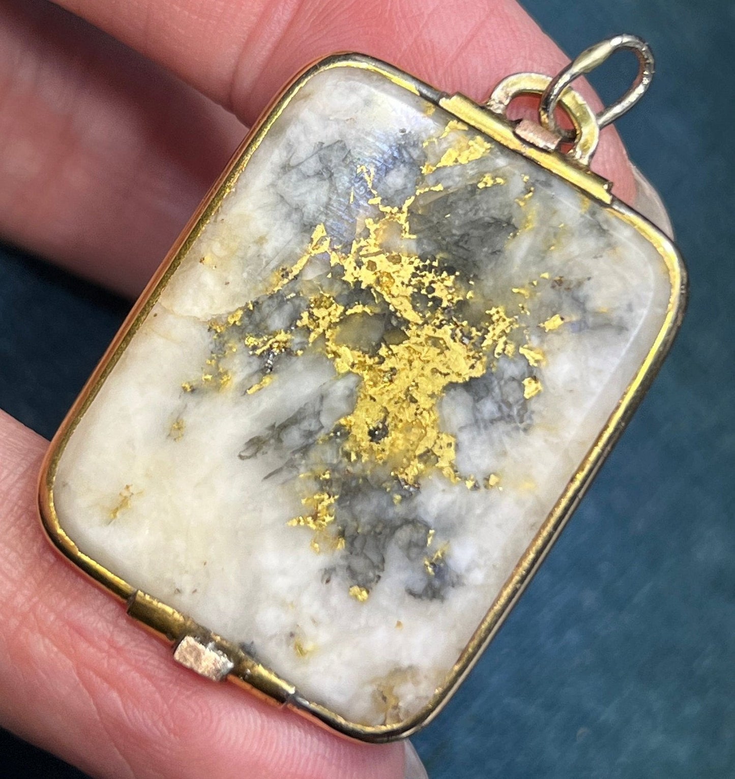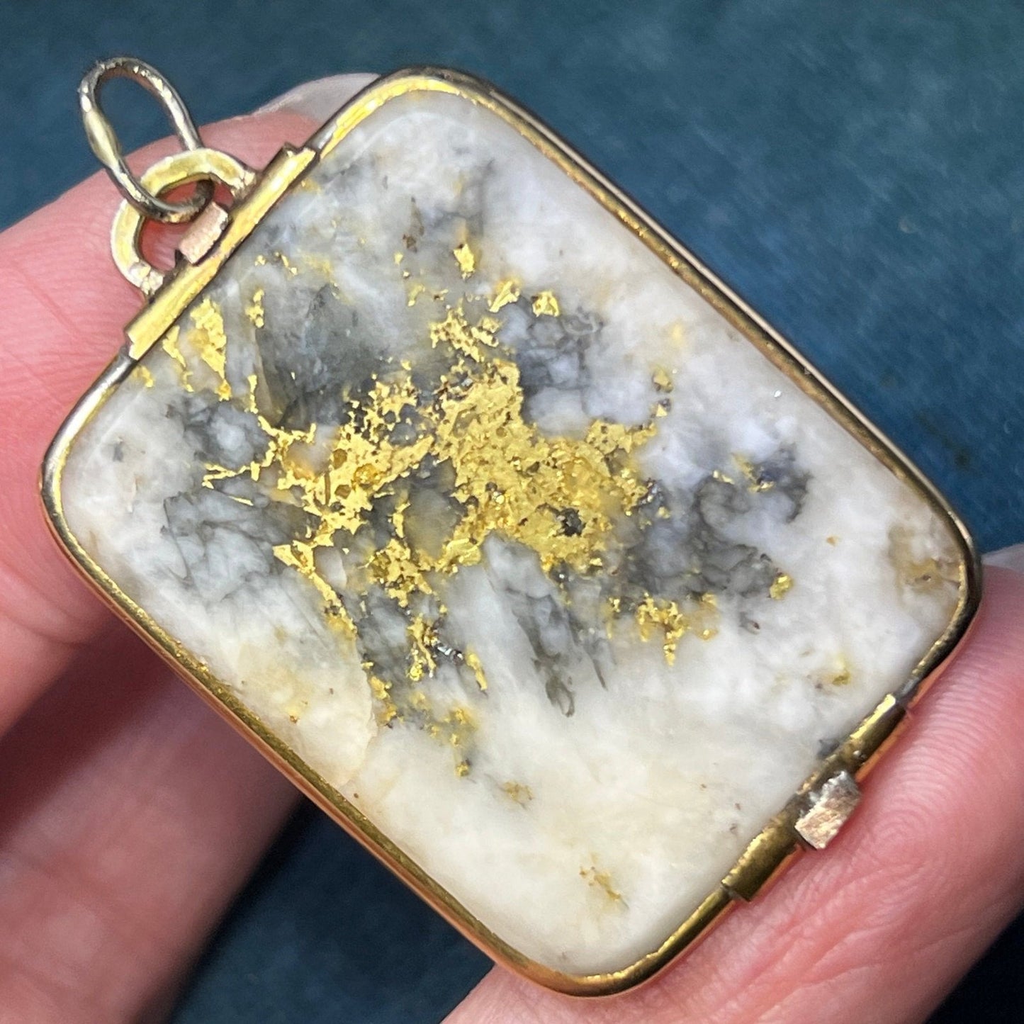 For sale is a 14k yellow gold pendant with Alaskan Gold-in-Quartz. Gold-in-Quartz, also known as Gold Quartz or Gold bearing quartz is a rare and sought-after gemstone for jewelry makers today. It consists of white (or gray or black) quartz with veins of pure gold ore running through it. The most valuable gems are those with white or cream quartz and lots of gold veins. This quartz is a creamy shade of white with bright burnished 24k gold veins. The quartz is exceptionally large at 1.75 x 1 inches in size. It is cut in a rectangle with rounded ends. The quartz is framed in a hand-crafted 14k gold setting. The pendant has an articulated bail to accommodate your chain. This unusually large pendant could be worn beautifully by either a man or a woman.