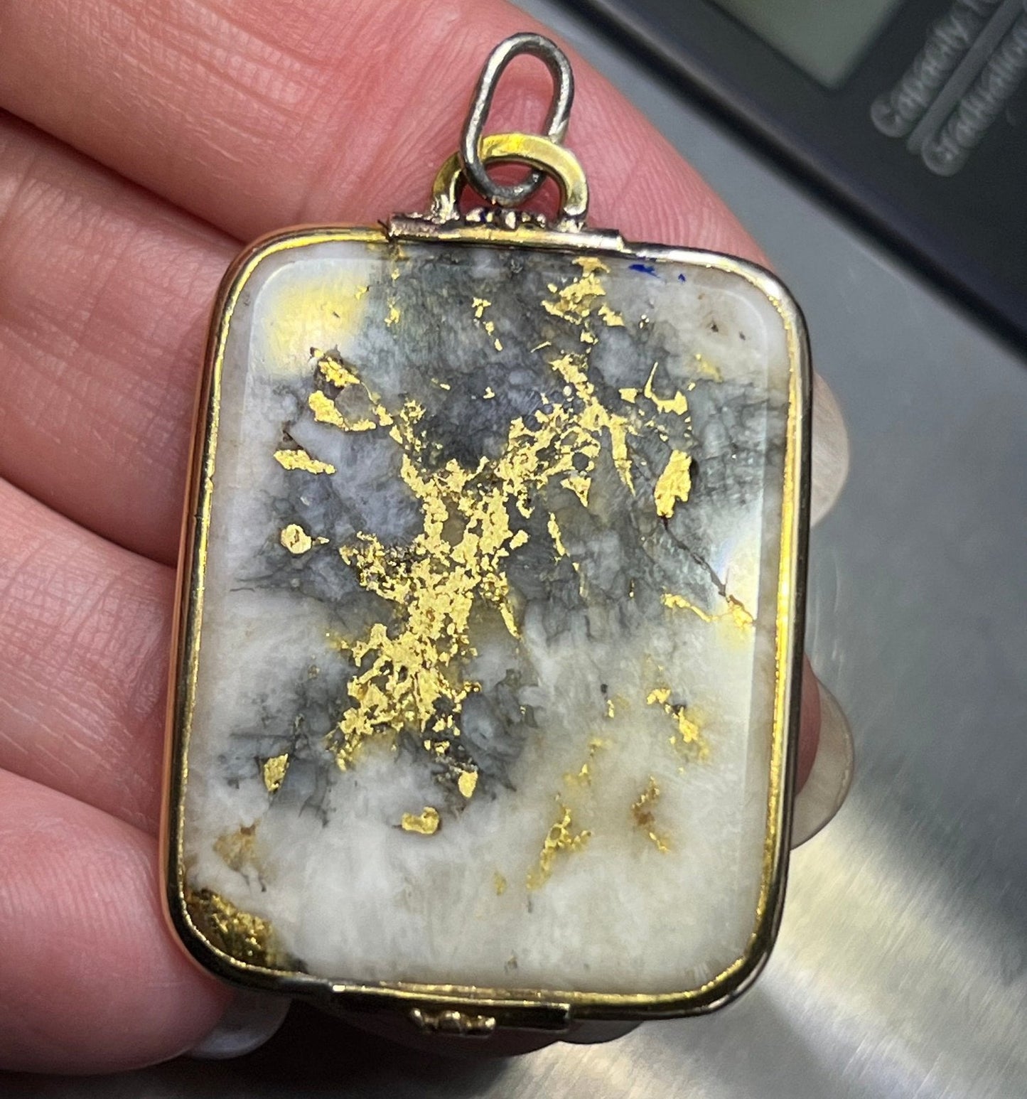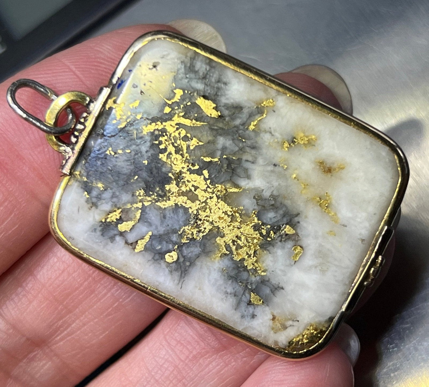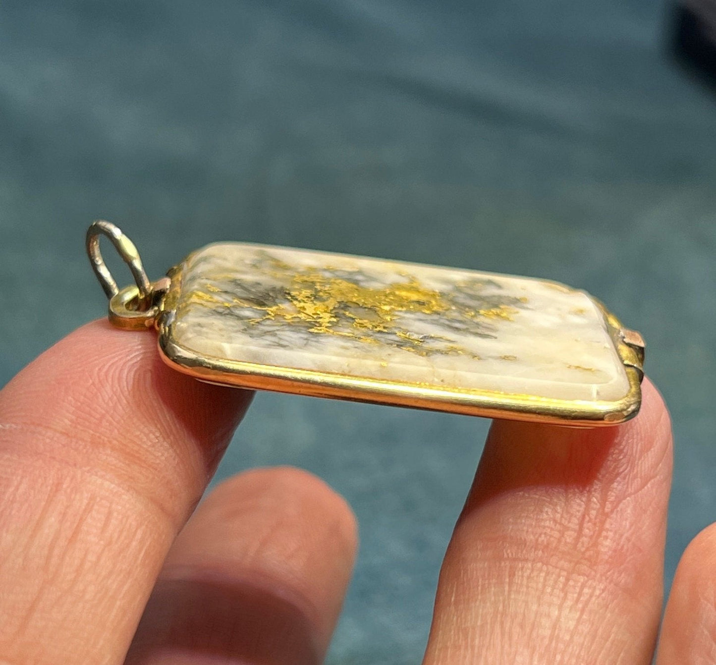 For sale is a 14k yellow gold pendant with Alaskan Gold-in-Quartz. Gold-in-Quartz, also known as Gold Quartz or Gold bearing quartz is a rare and sought-after gemstone for jewelry makers today. It consists of white (or gray or black) quartz with veins of pure gold ore running through it. The most valuable gems are those with white or cream quartz and lots of gold veins. This quartz is a creamy shade of white with bright burnished 24k gold veins. The quartz is exceptionally large at 1.75 x 1 inches in size. It is cut in a rectangle with rounded ends. The quartz is framed in a hand-crafted 14k gold setting. The pendant has an articulated bail to accommodate your chain. This unusually large pendant could be worn beautifully by either a man or a woman.