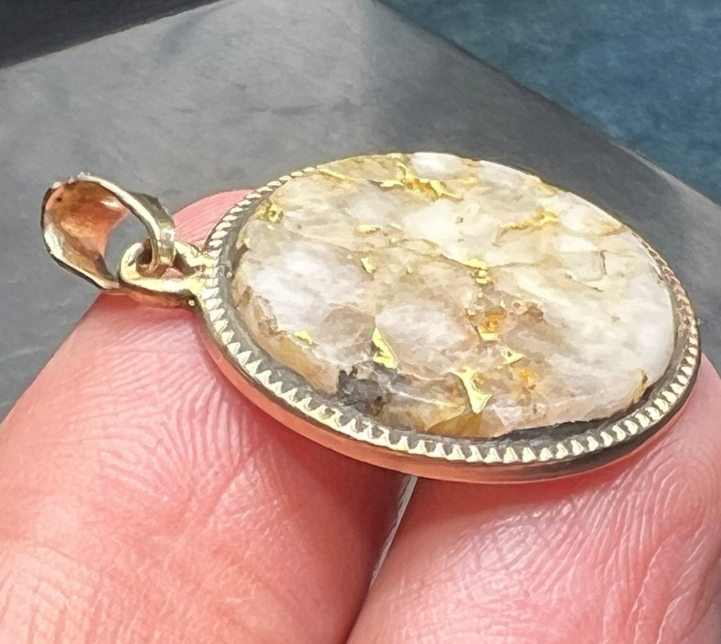 For sale is a 14k yellow gold pendant with Alaskan Gold-in-Quartz. Gold-in-Quartz, also known as Gold Quartz or Gold bearing quartz is a rare and sought-after gemstone for jewelry makers today. It consists of white (or gray or black) quartz with veins of pure gold ore running through it. The most valuable gems are those with white or cream quartz and lots of gold veins. This quartz is a creamy shade of white with bright burnished 24k gold veins. The quartz is cut in a flat circle that is polished smooth. The quartz is framed in a hand-crafted 14k gold setting with coin edging. The pendant has an articulated bail to accommodate your chain. This unusually large pendant could be worn beautifully by either a man or a woman.