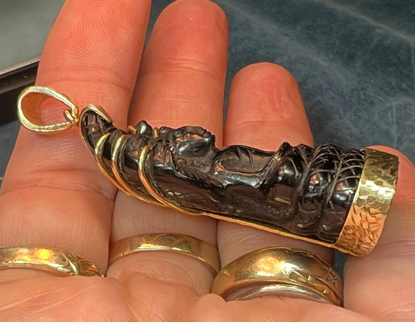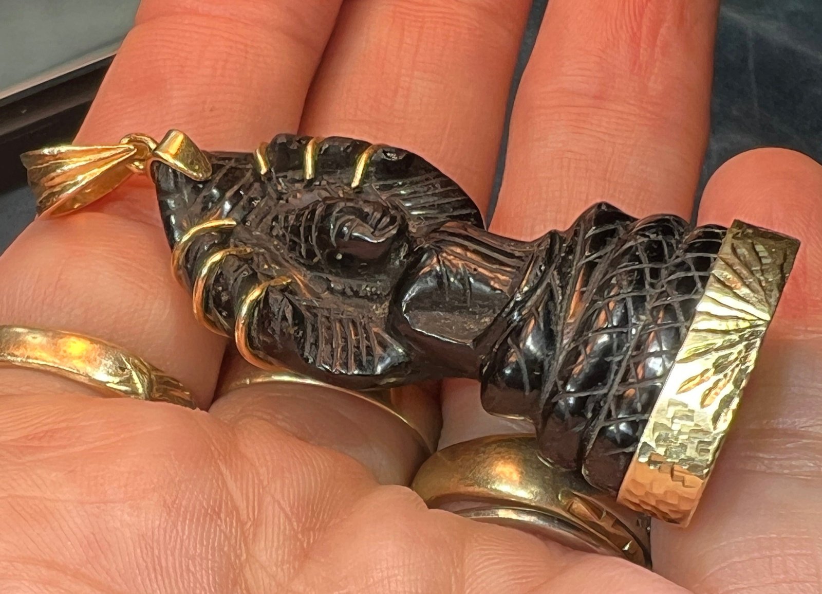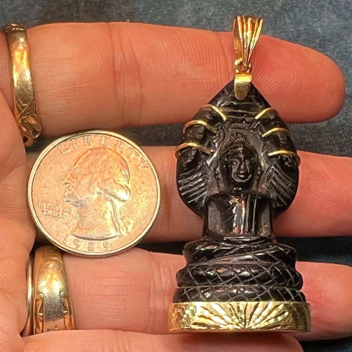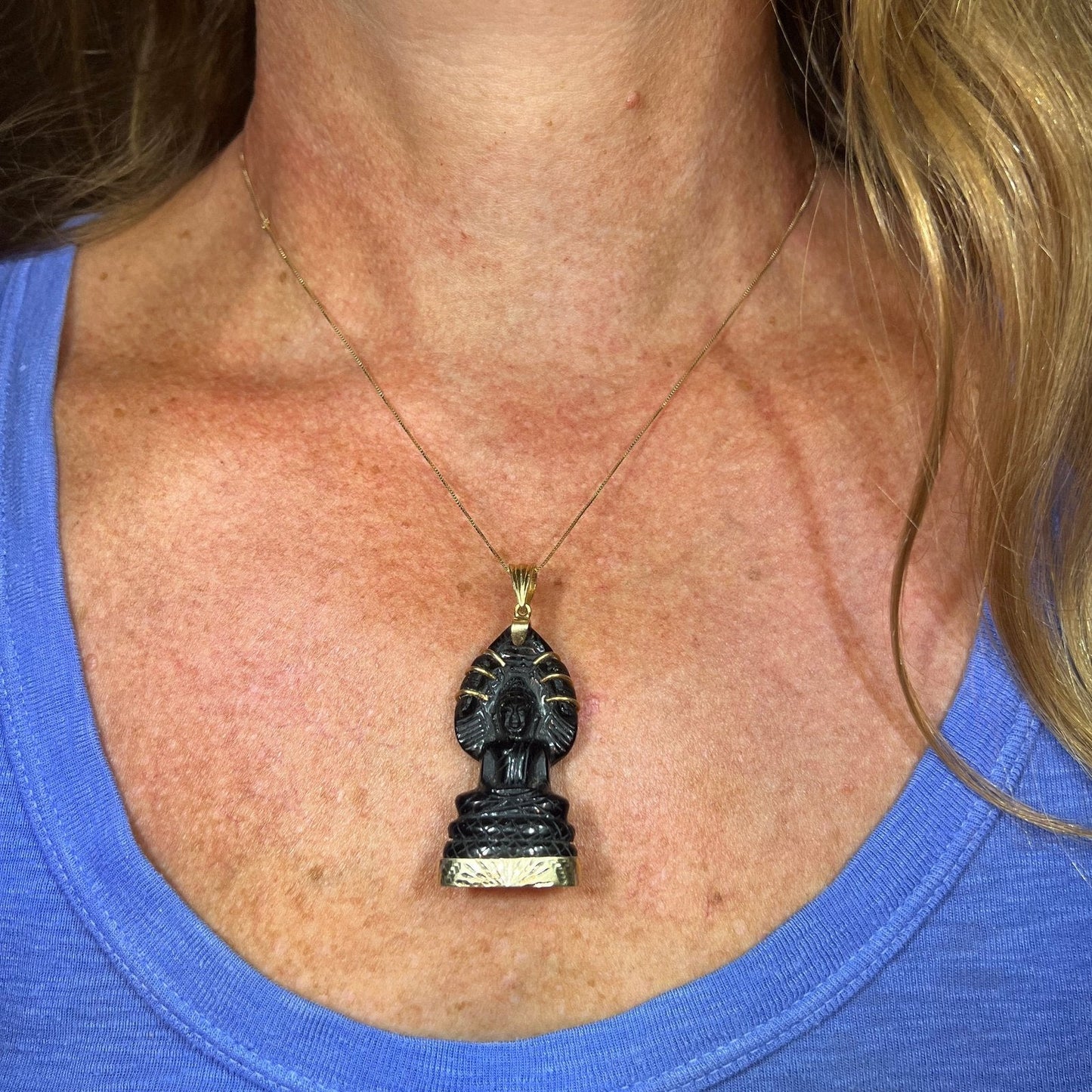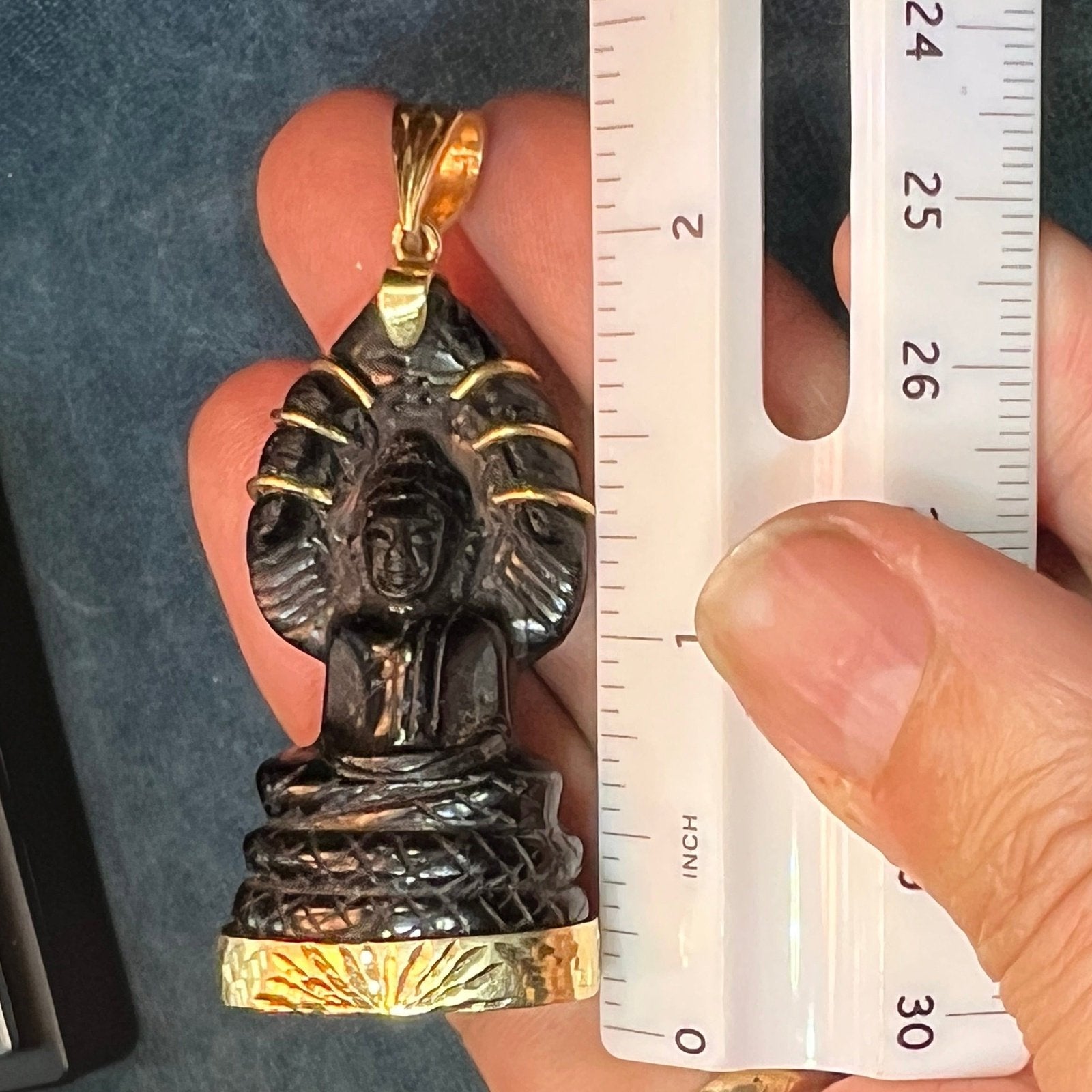 18k Yellow Gold Carved Black Jade NAGA Buddha Pendant. 2" + 20g