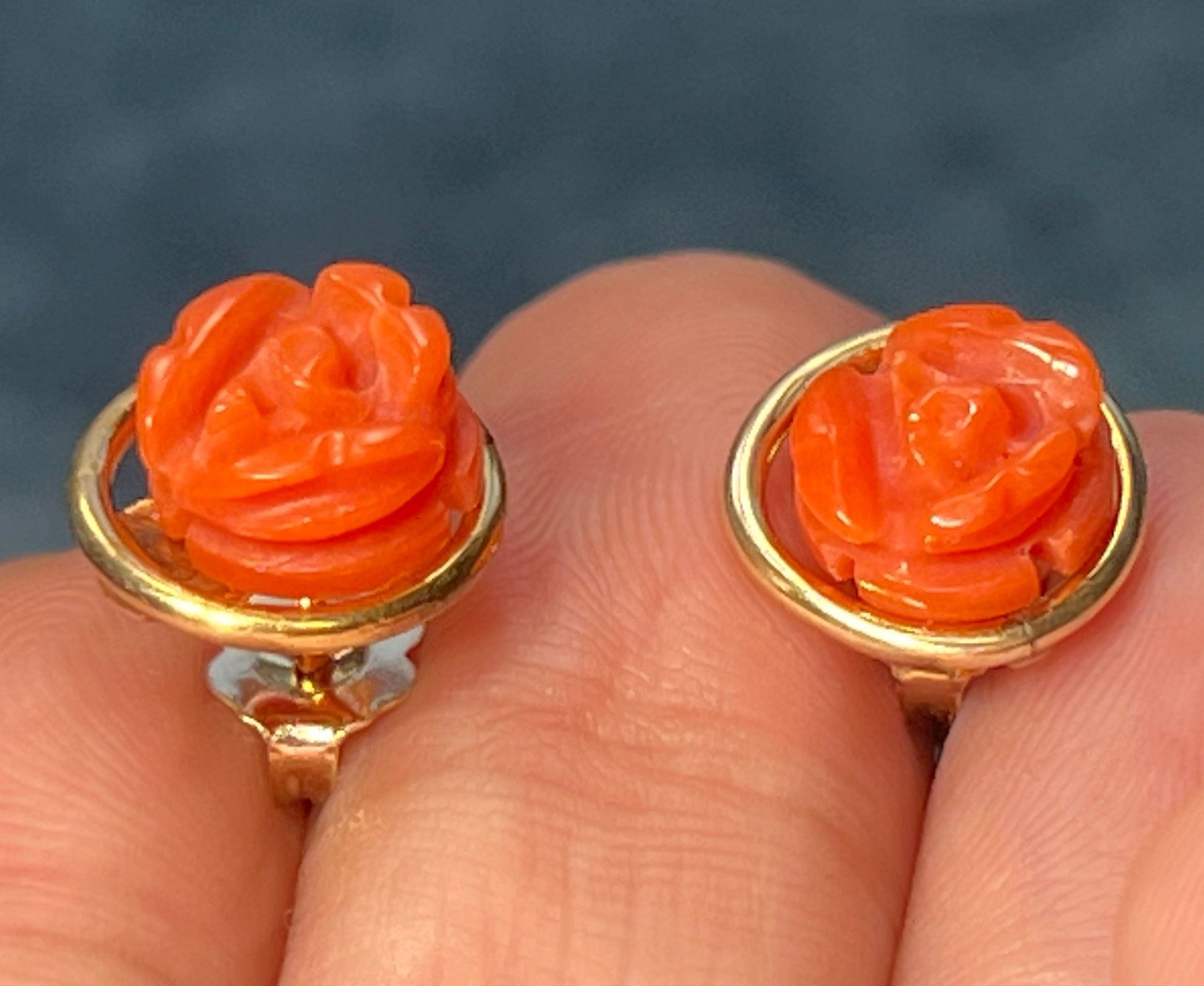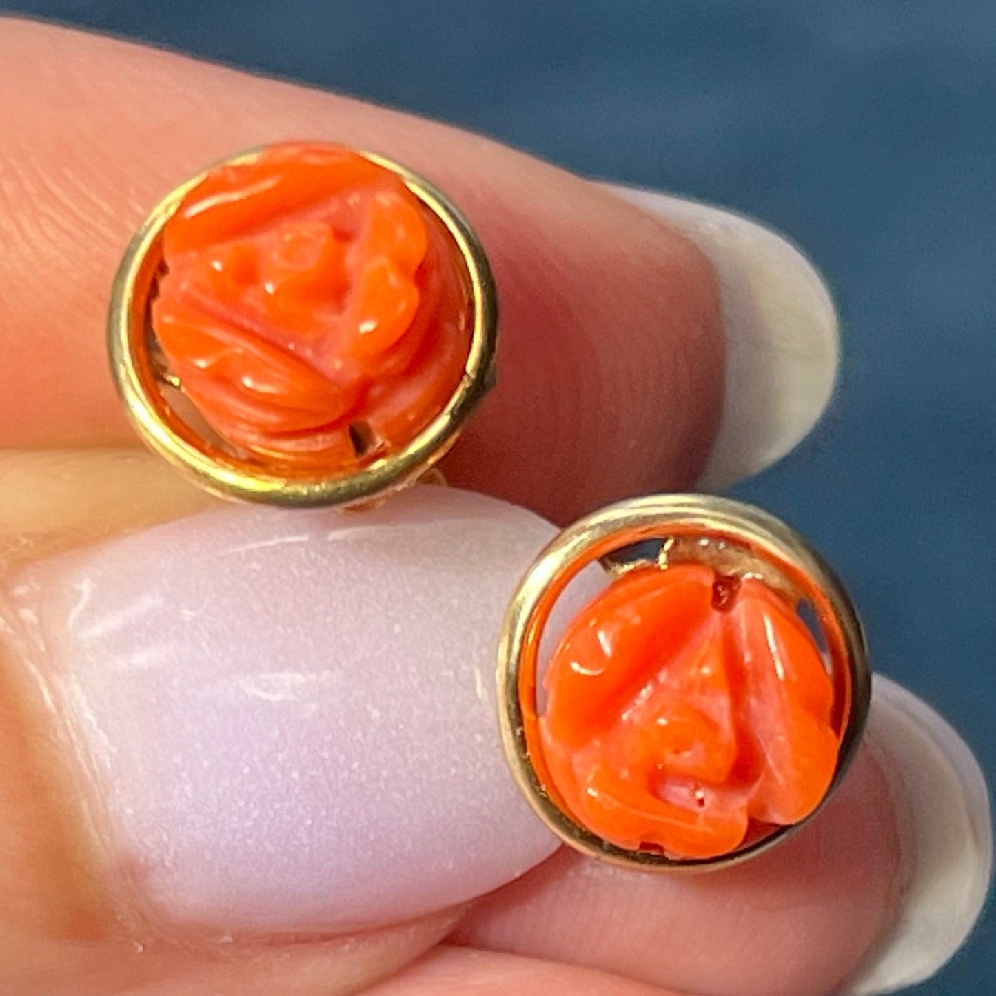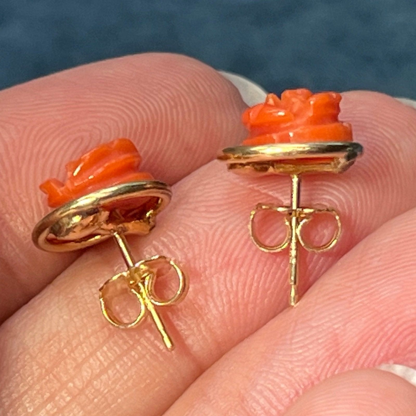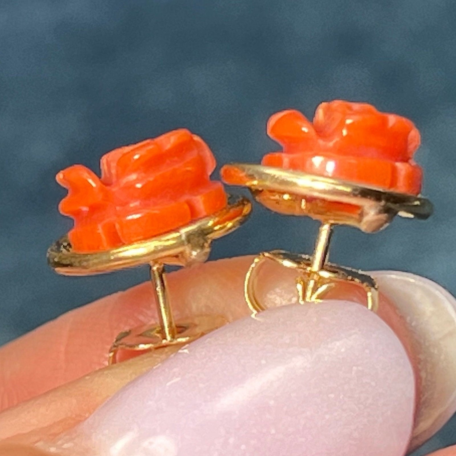 14k Yellow Gold Carved Red Coral Rosebud Earrings