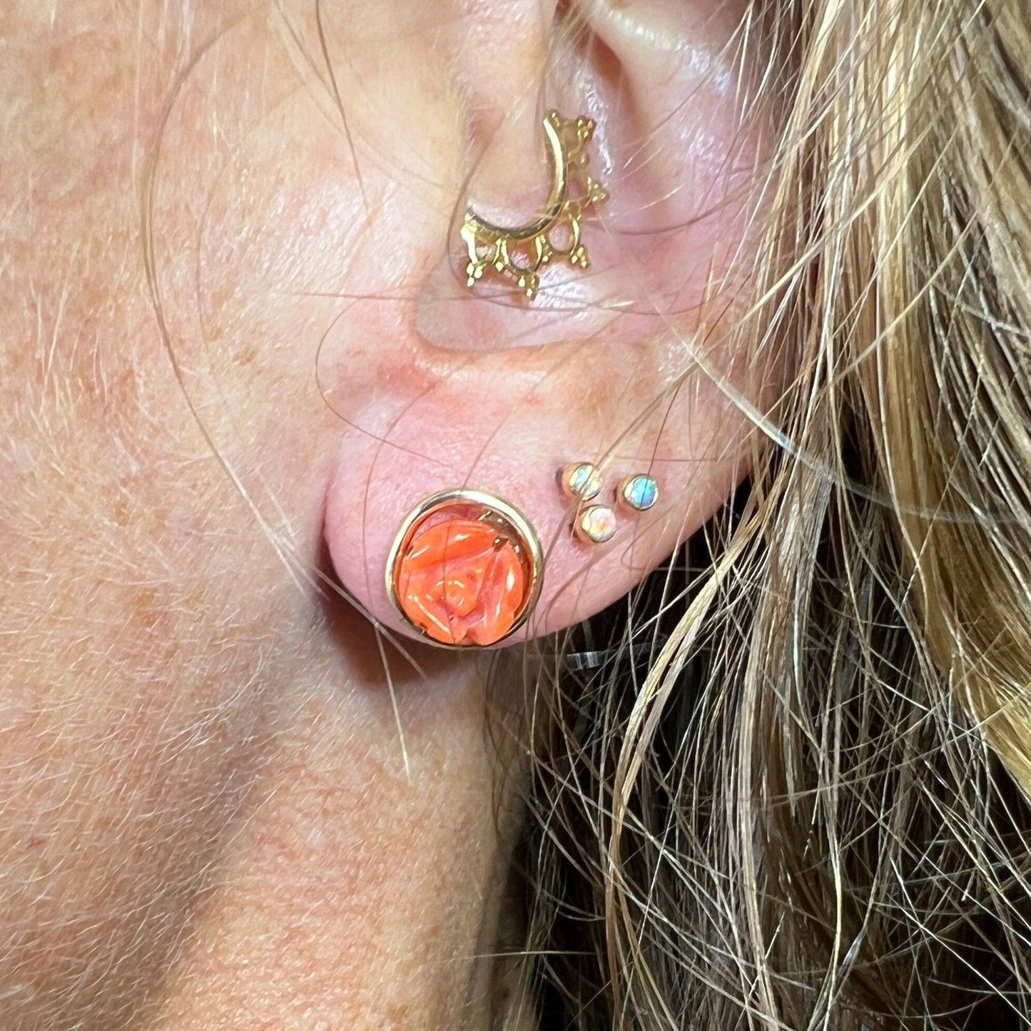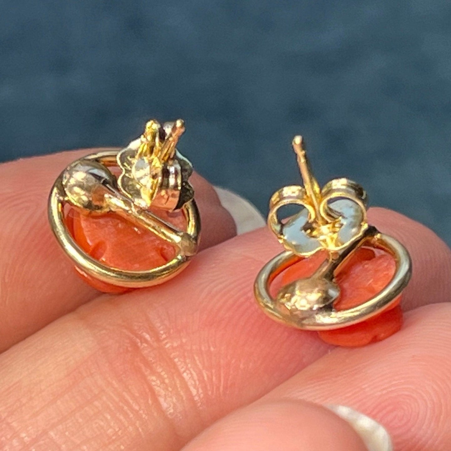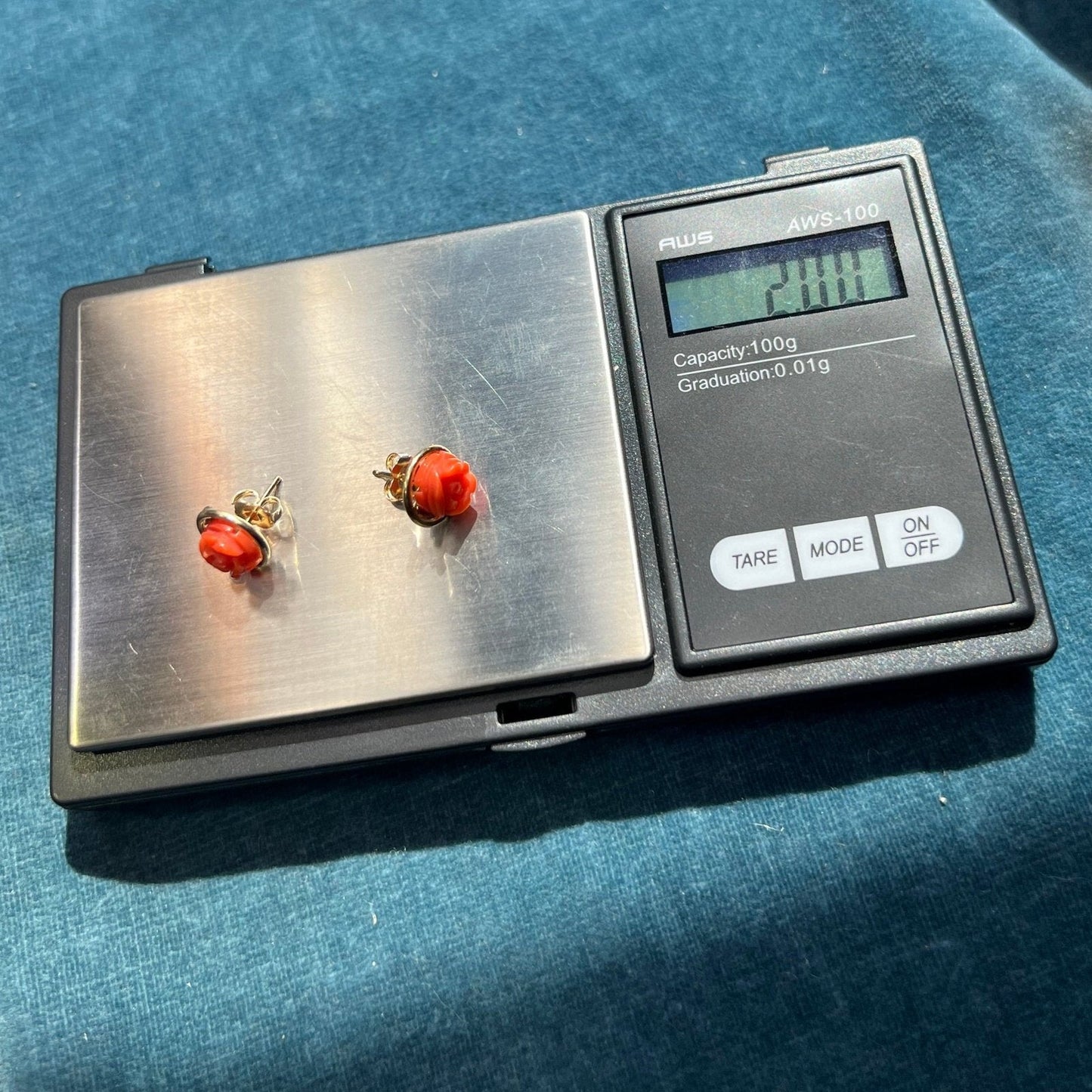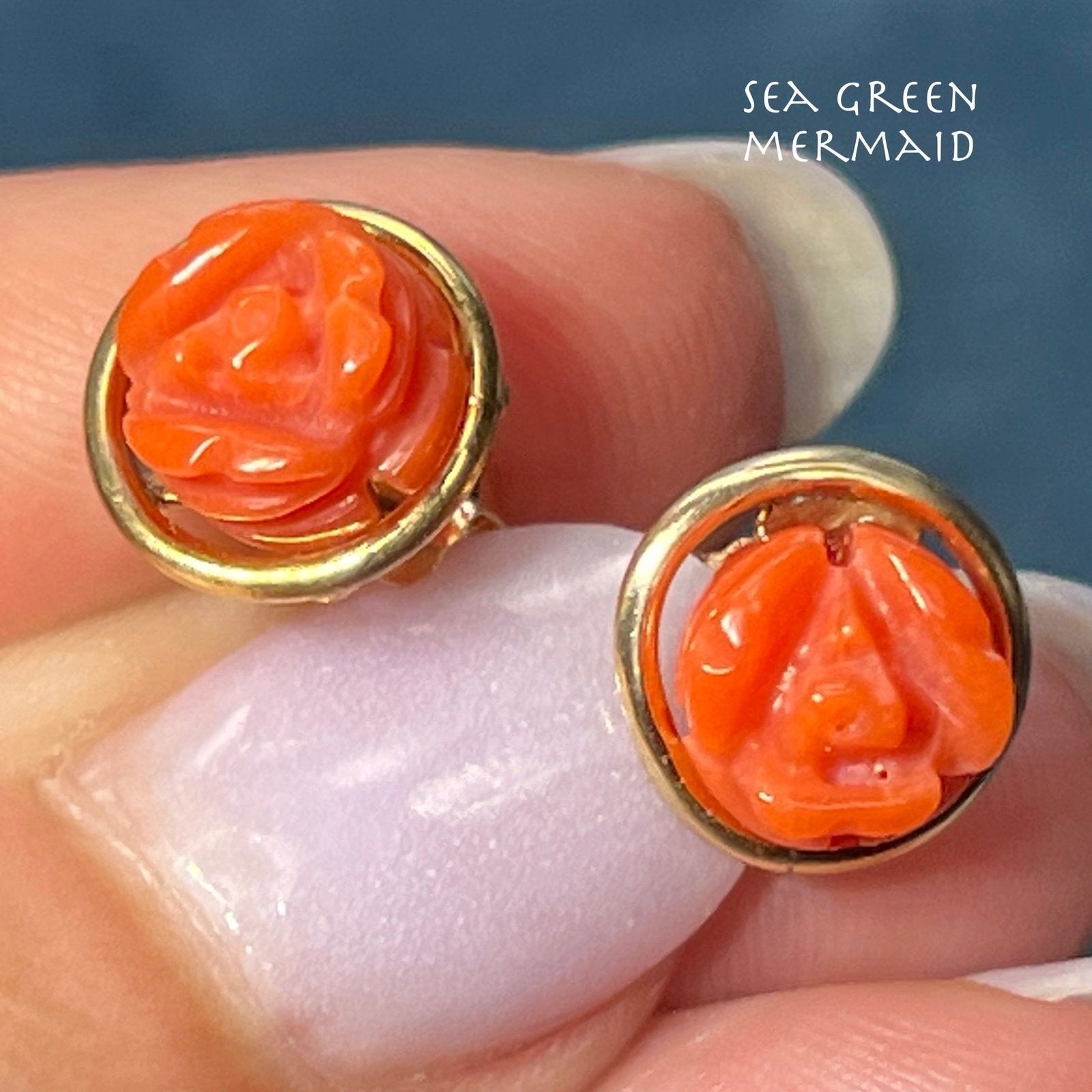 14k Yellow Gold Carved Red Coral Rosebud Earrings
