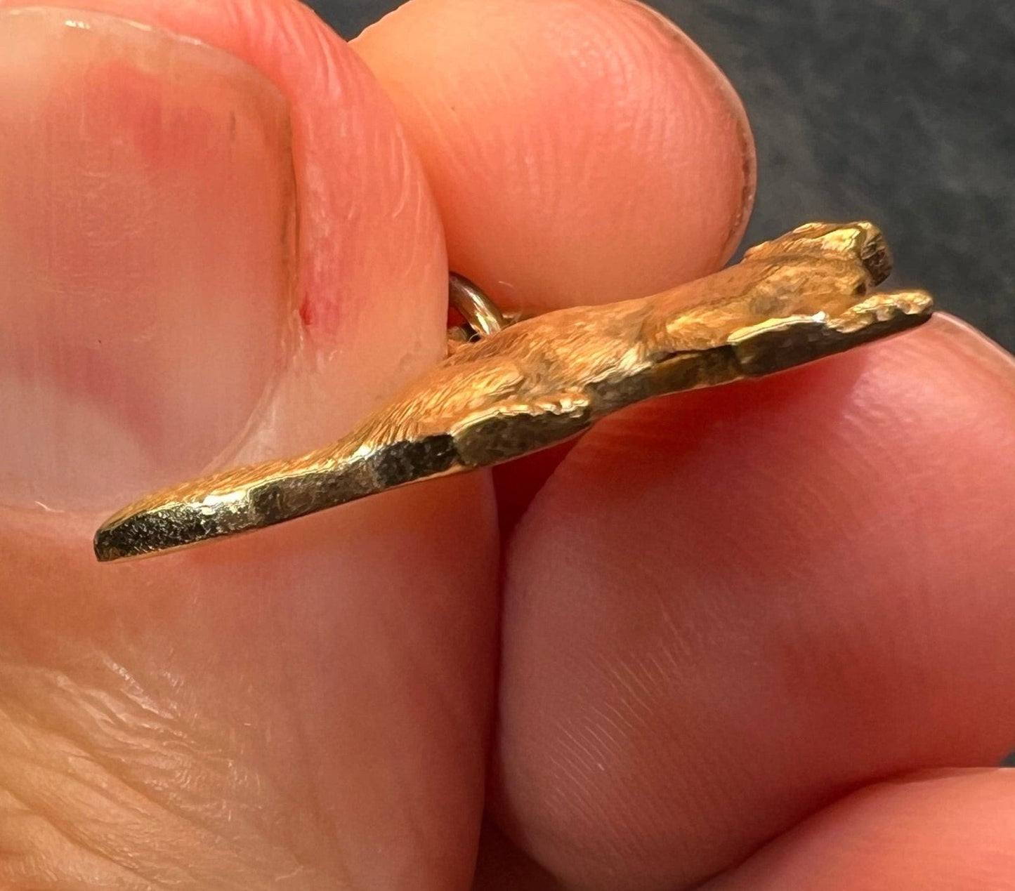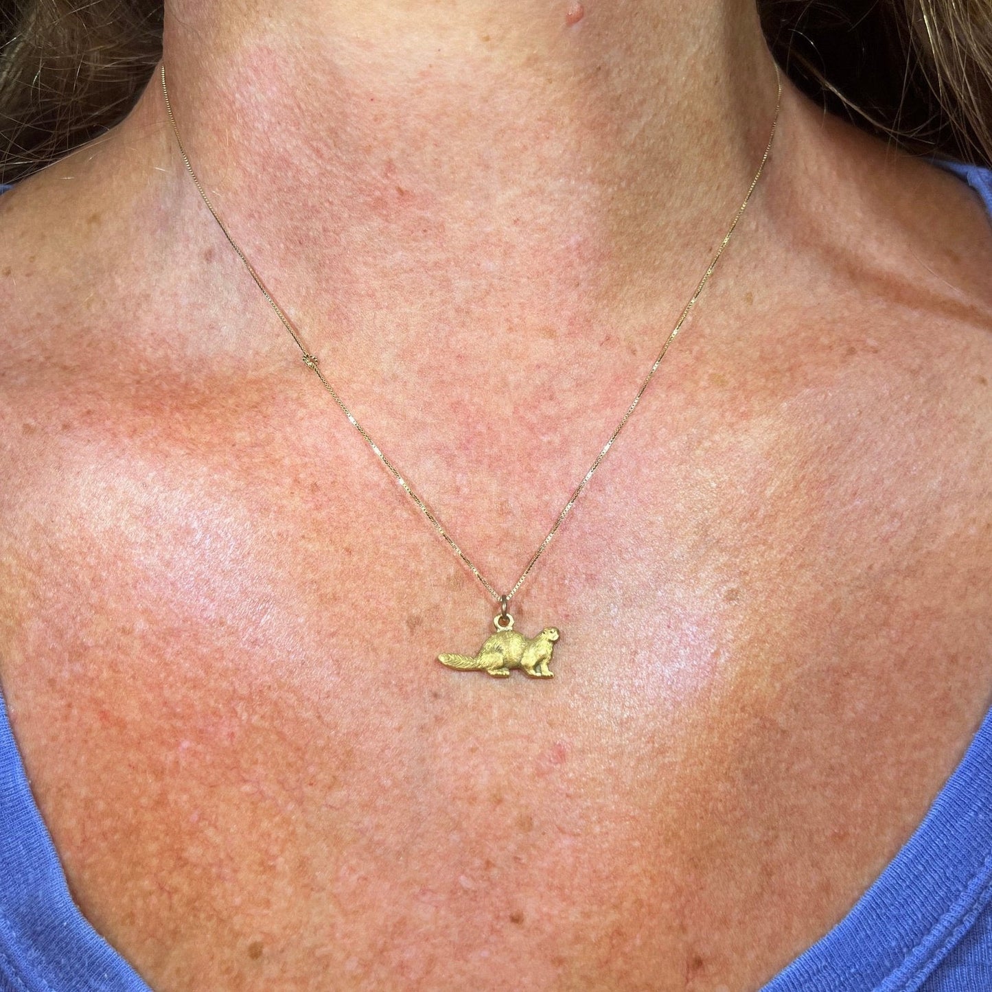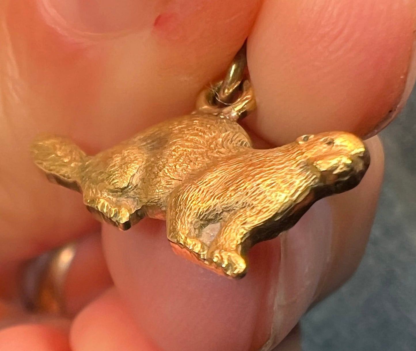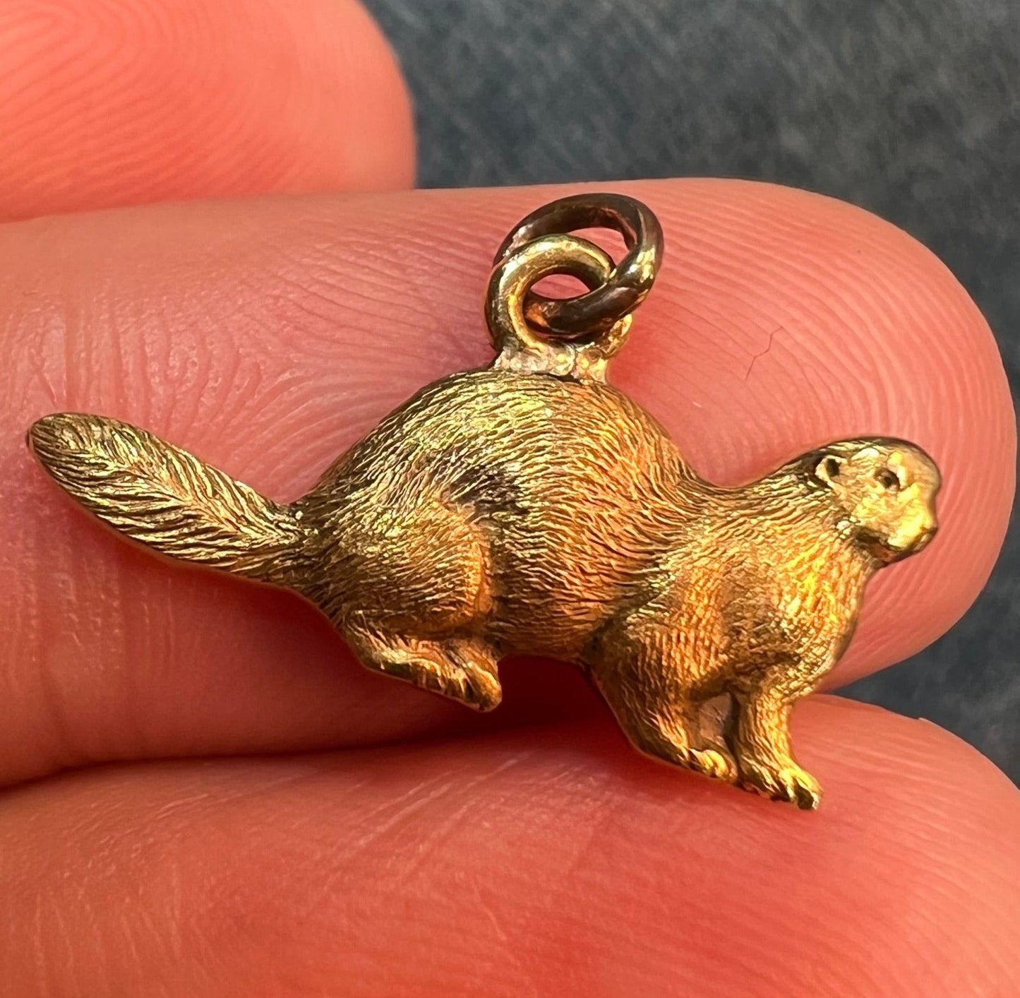 For sale is a 10k yellow gold running river otter or beaver pendant. This unusual pendant features a river otter in profile. The otter is sleek and graceful. She has shaggy textured fur and clearly detailed facial features. Her tail is long and powerful, and her little paws have detailed claws. The pendant has a simple jump ring bail to accommodate your chain.