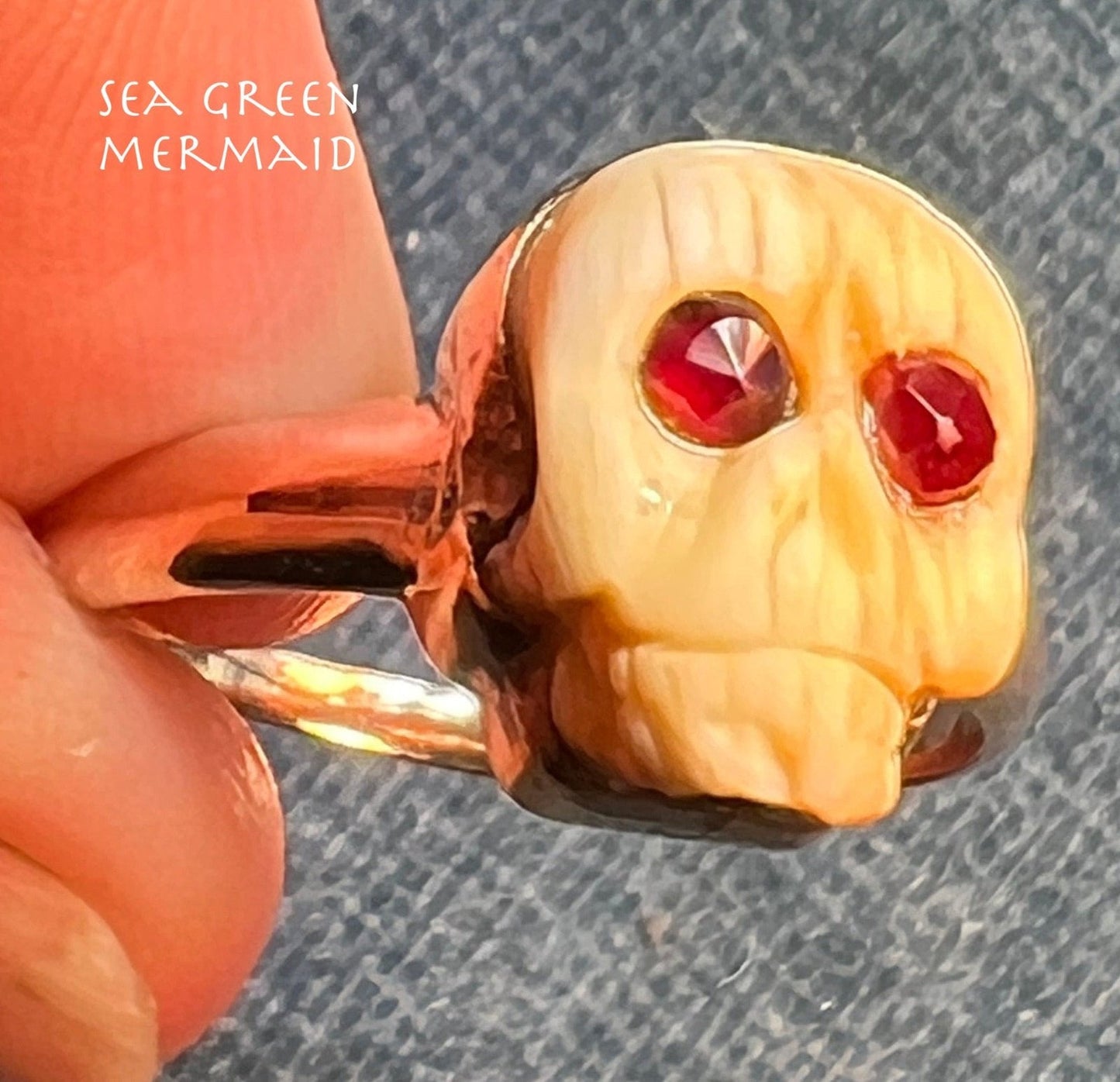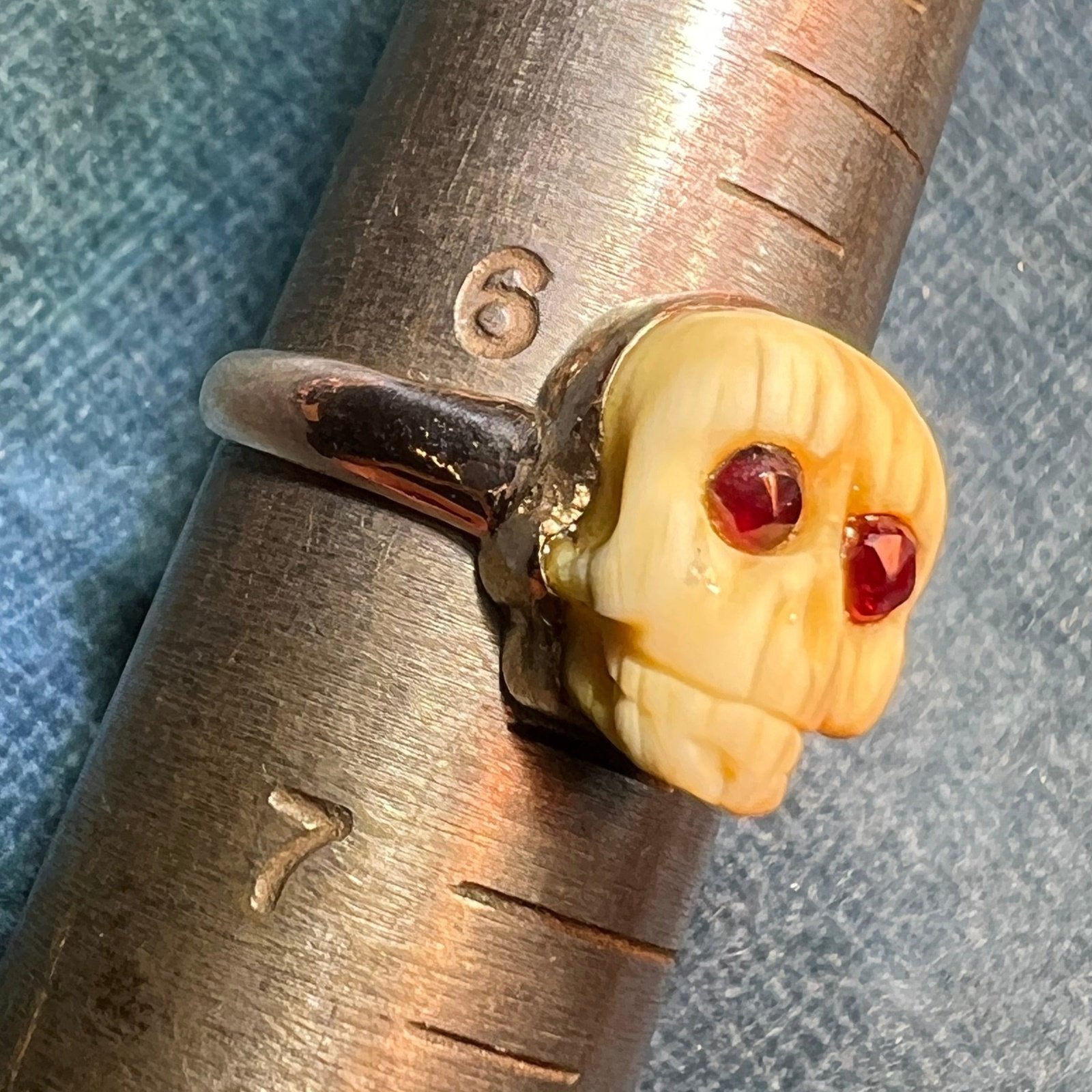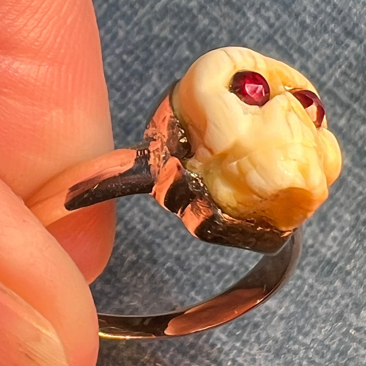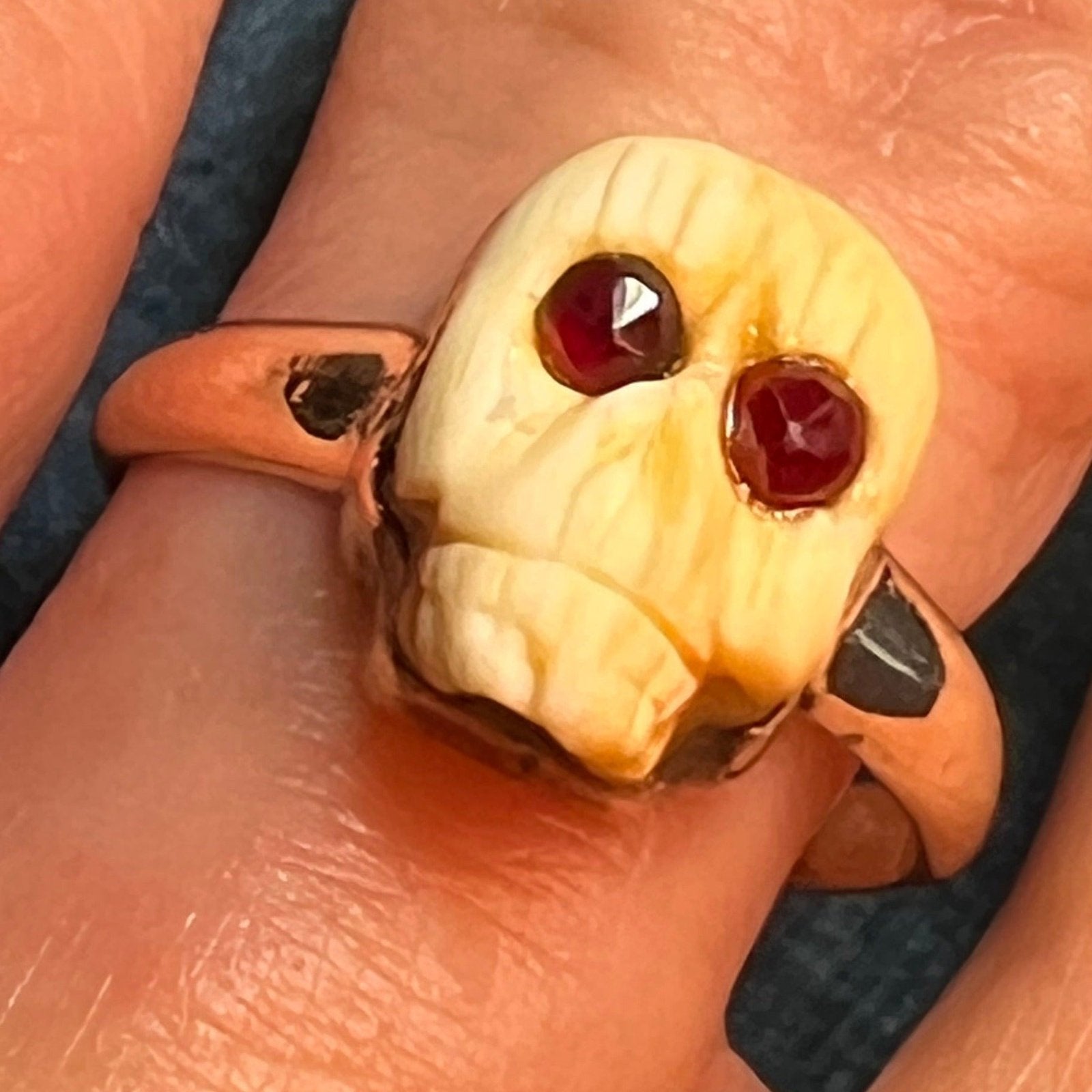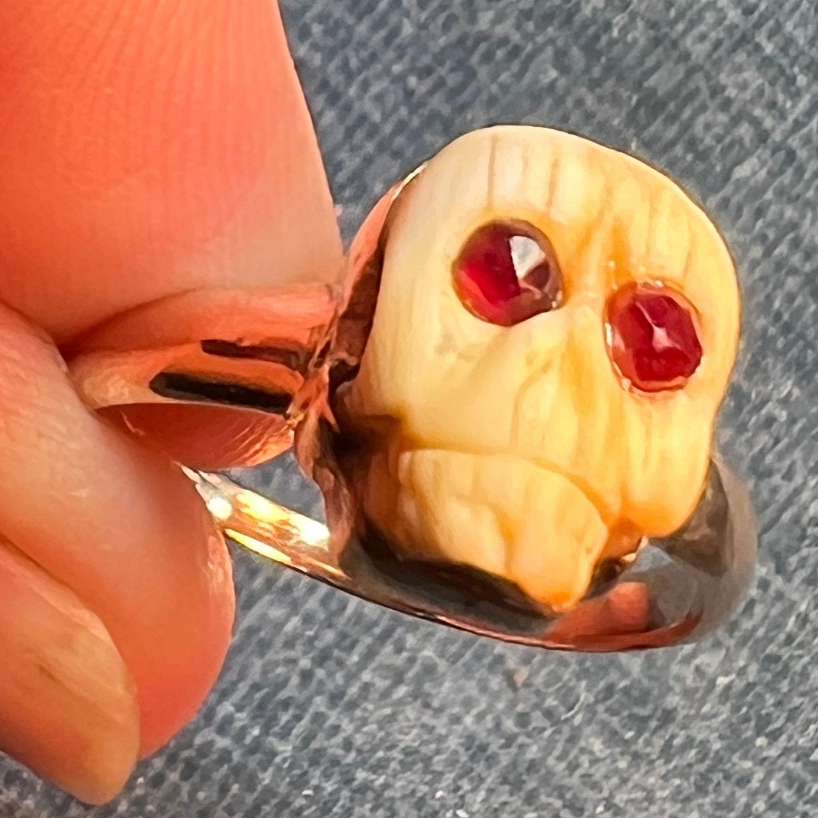 10k Yellow Gold Carved Agate SKULL Ring w Garnet Eyes. Memento Mori
