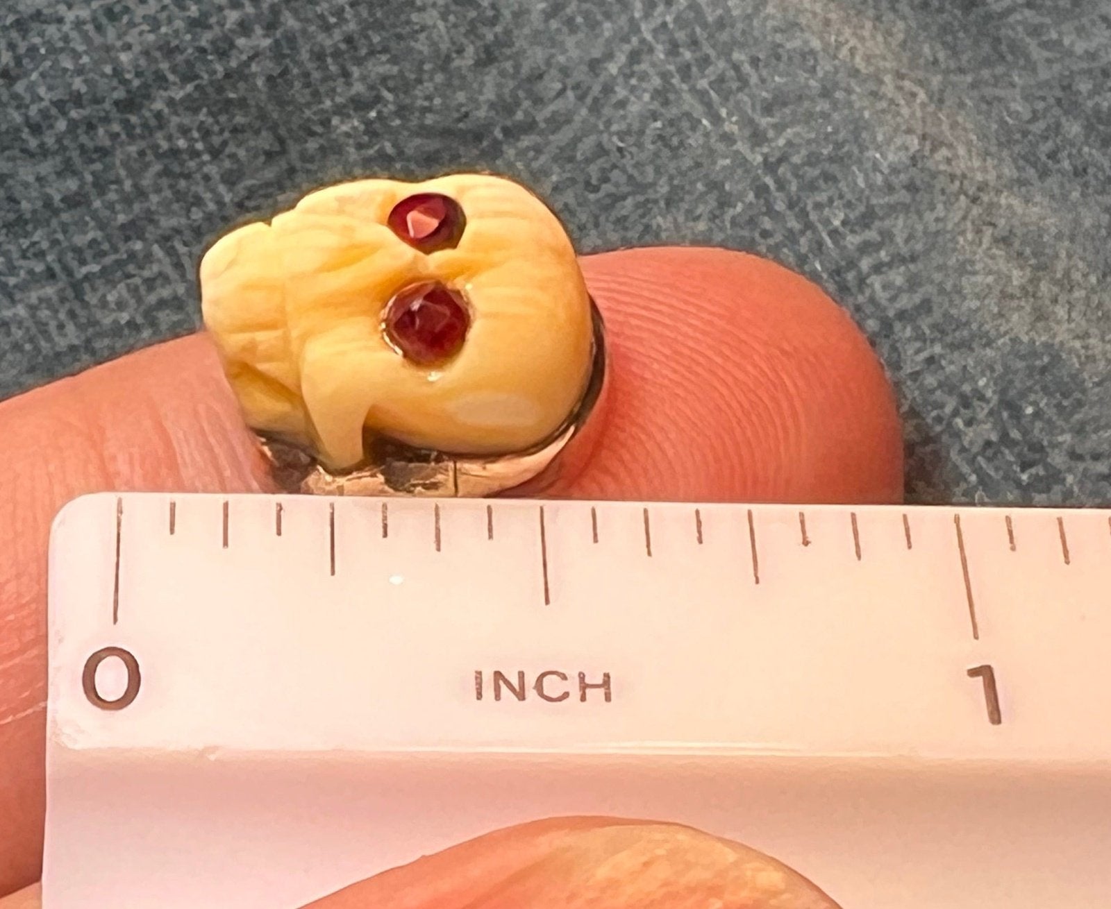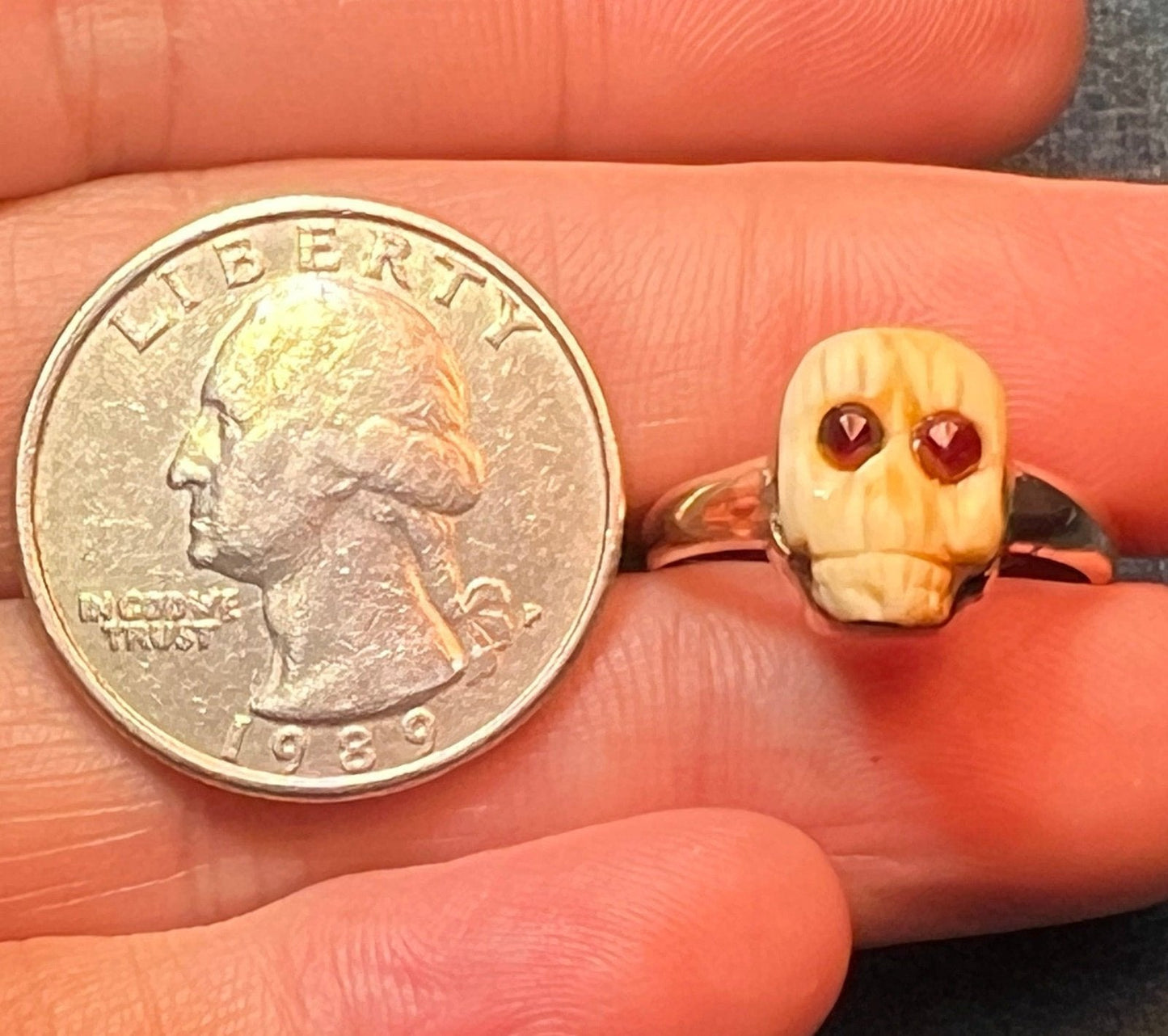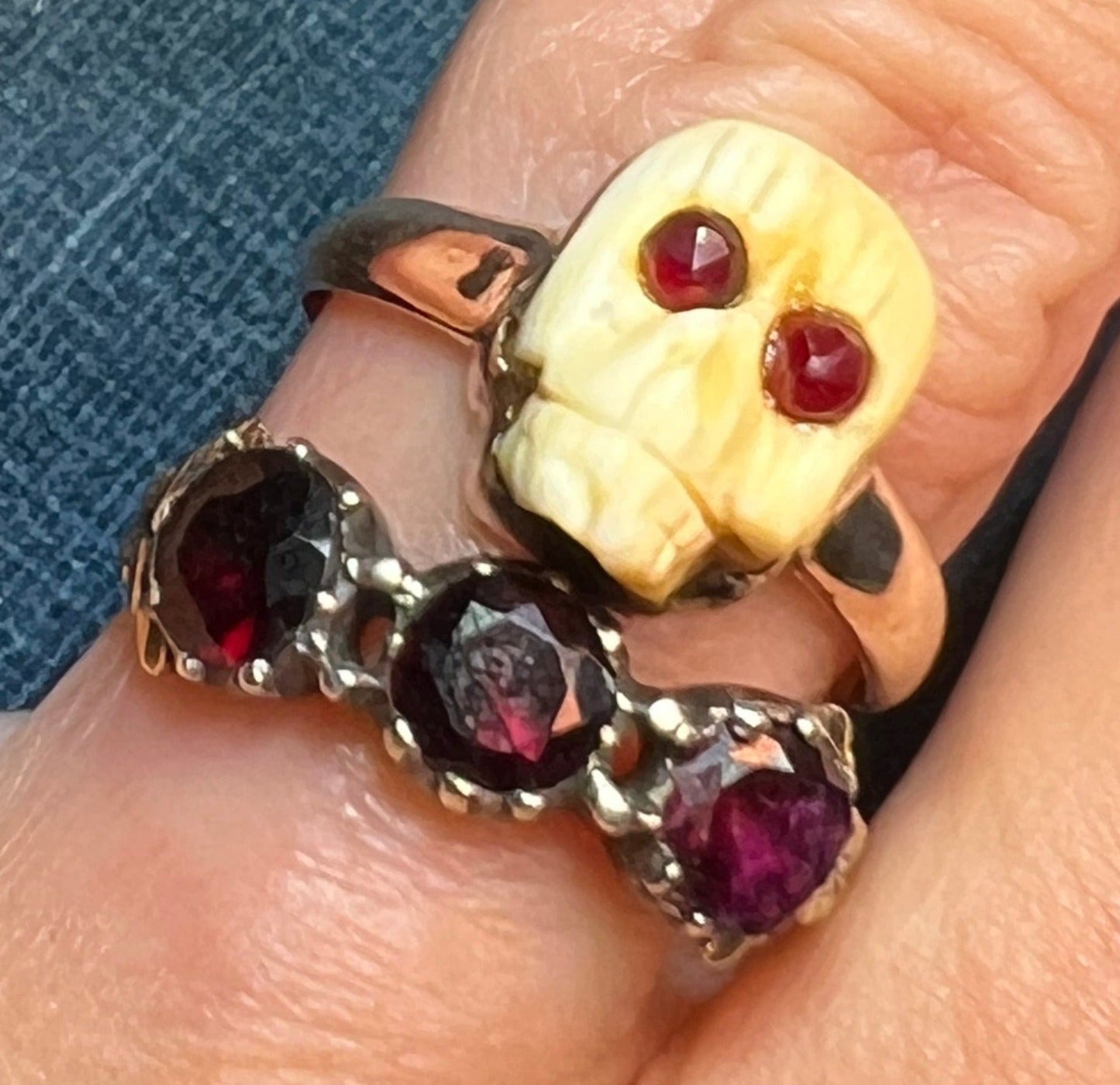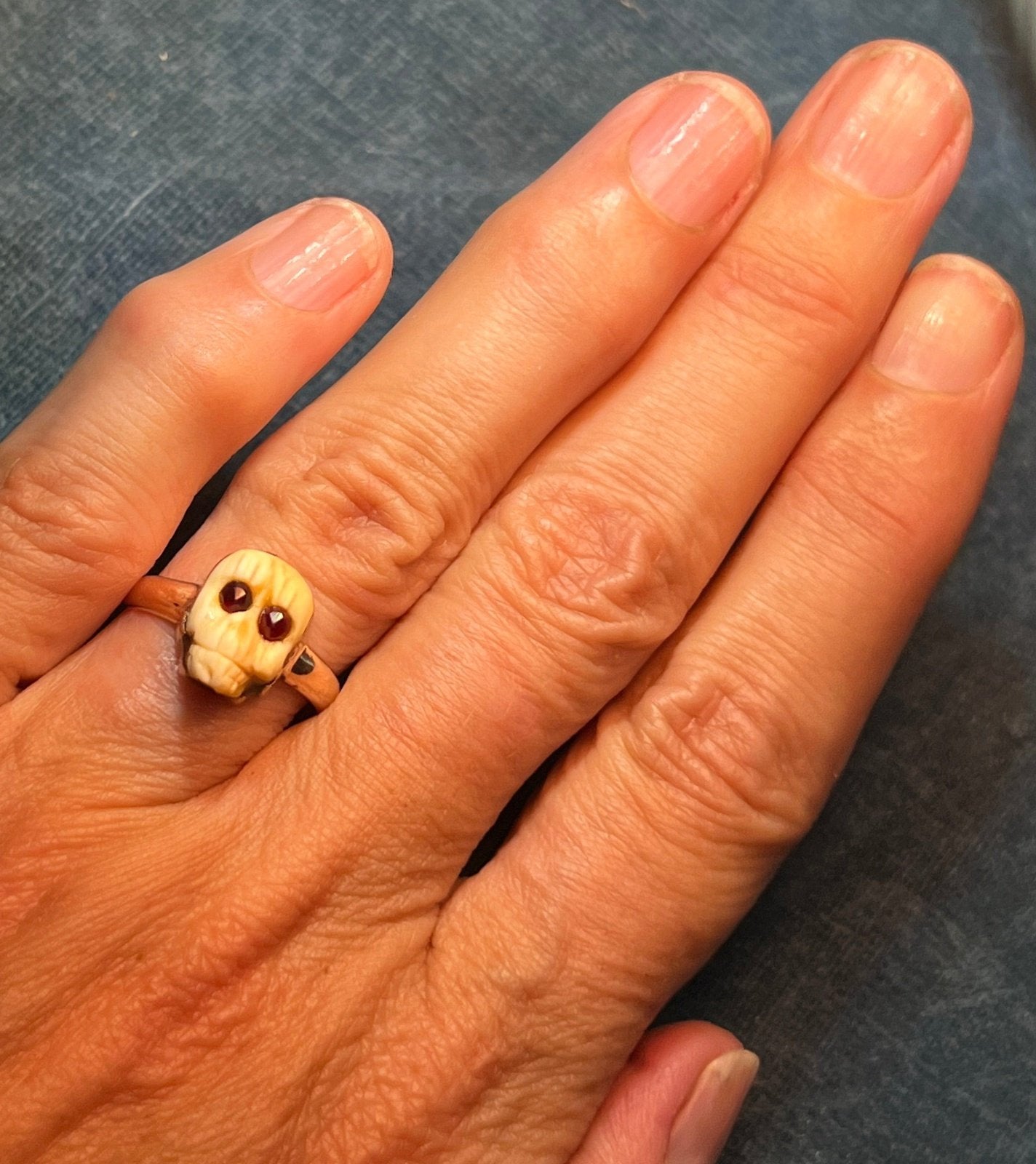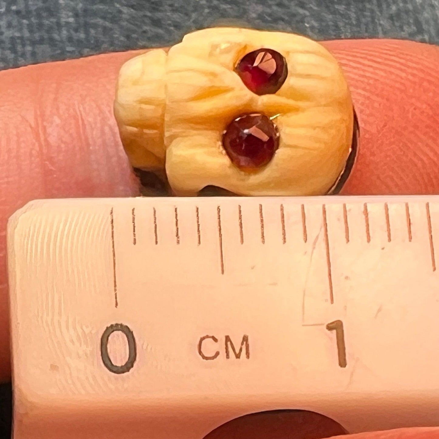 10k Yellow Gold Carved Agate SKULL Ring w Garnet Eyes. Memento Mori