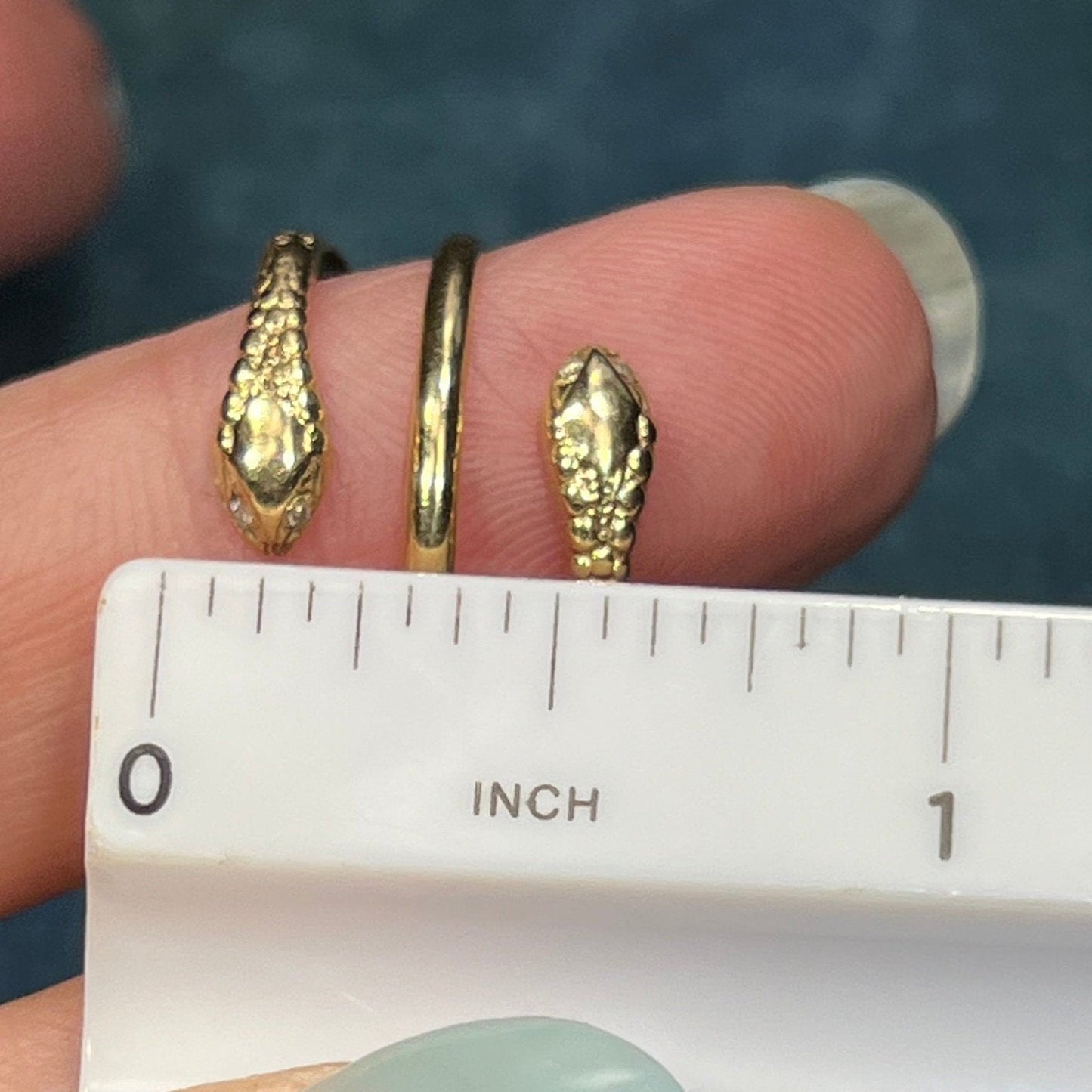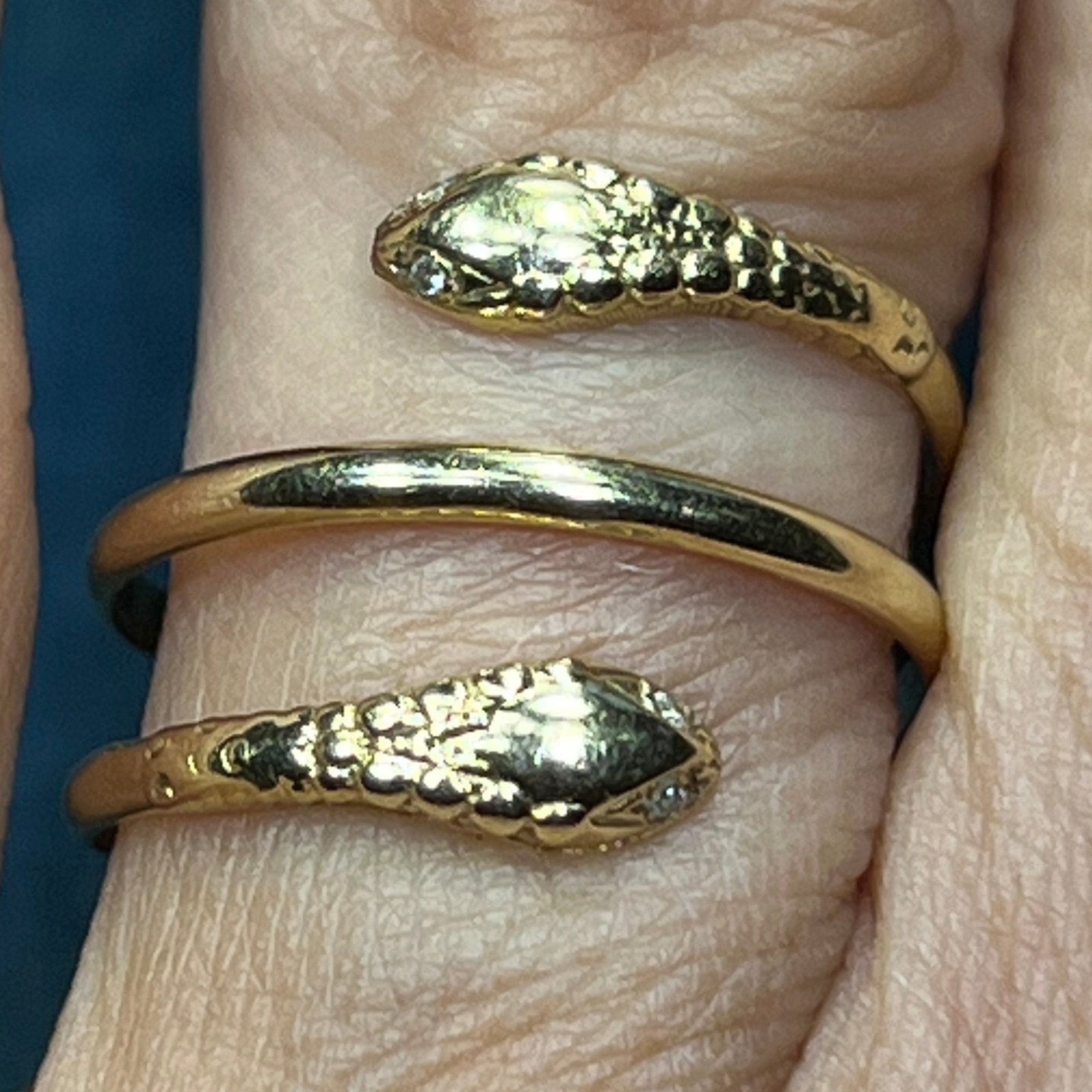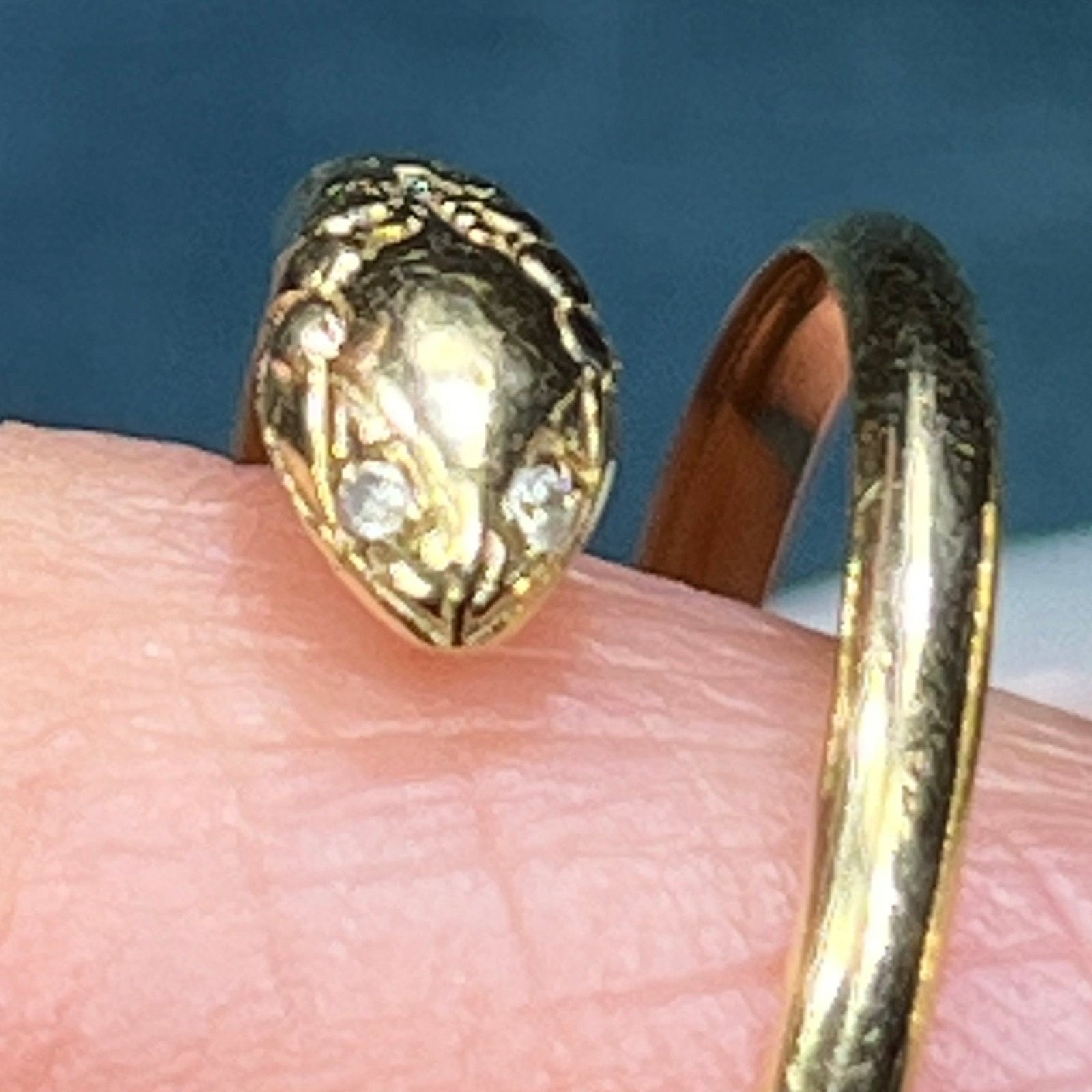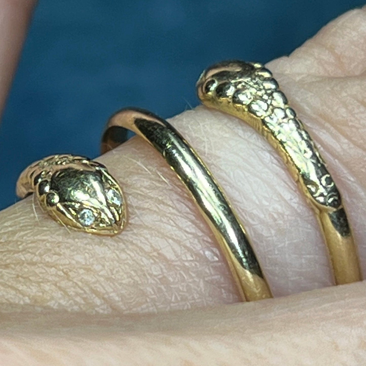 For sale is a 14k yellow gold coiled snake ring with diamond eyes. This beautifully crafted antique ring hails from the Victorian era. The snake's body forms the coiled ring, wrapping twice around your finger. The snake has two heads, one at each end of her body. Each snake head has tiny rose-cut diamond eyes. The snake's heads are heavily textured with raised scales. The snake's body is polished smooth. The ring is currently size 7 but can be easily adjusted by your jeweler to fit a large range of sizes. This ring combines beautifully with other period jewelry, such as rose-cut diamonds, garnets, onyx, cameos, or memento mori rings.