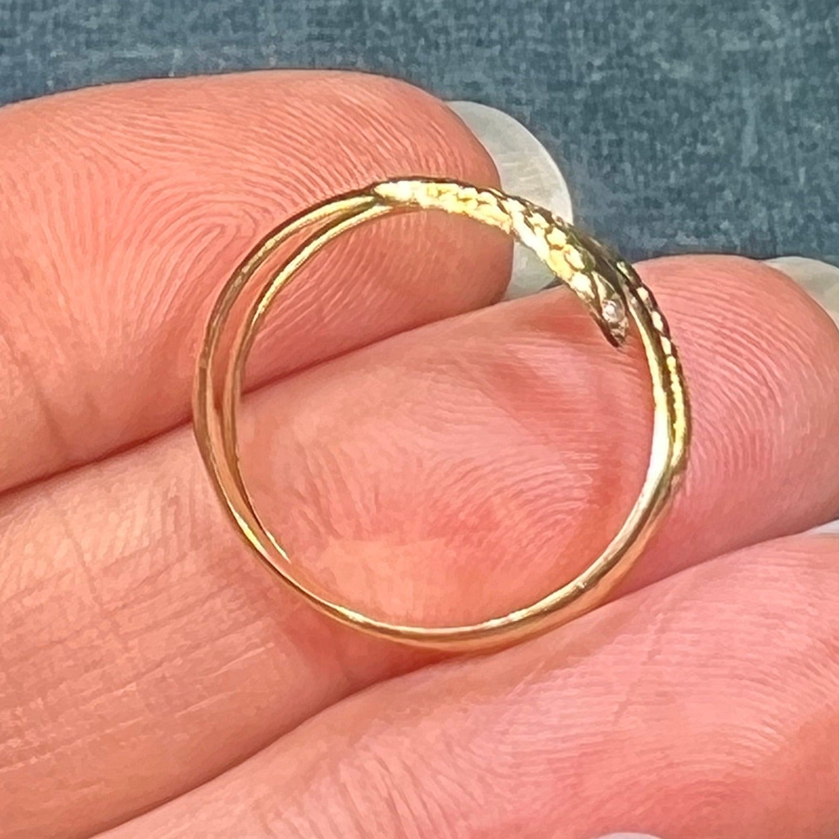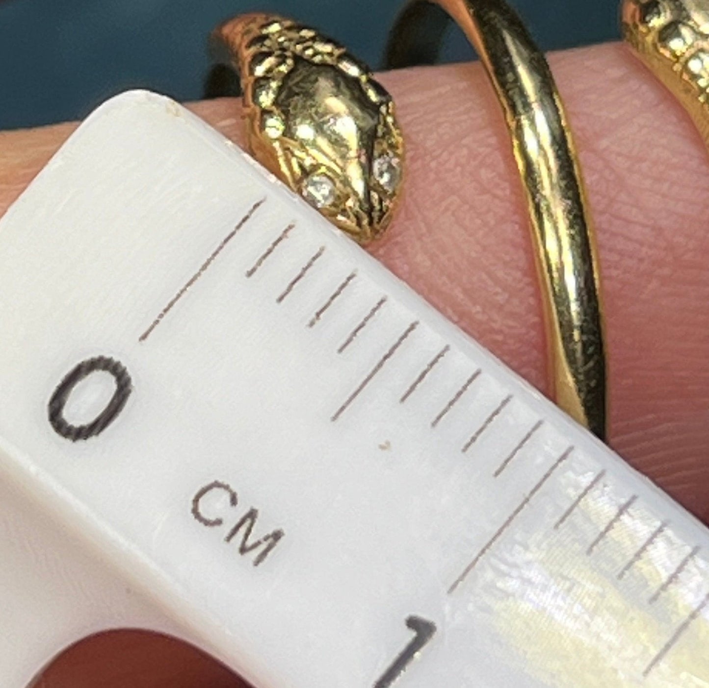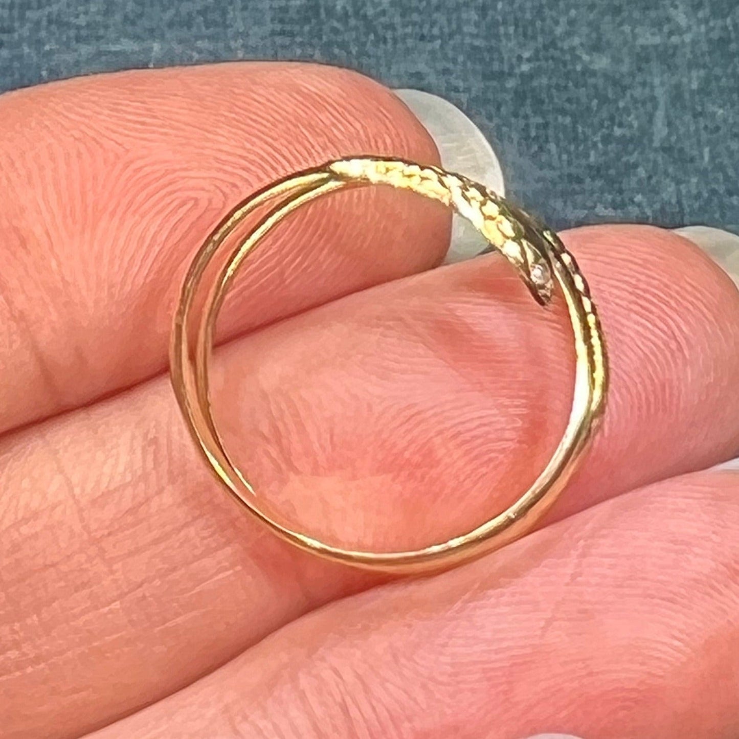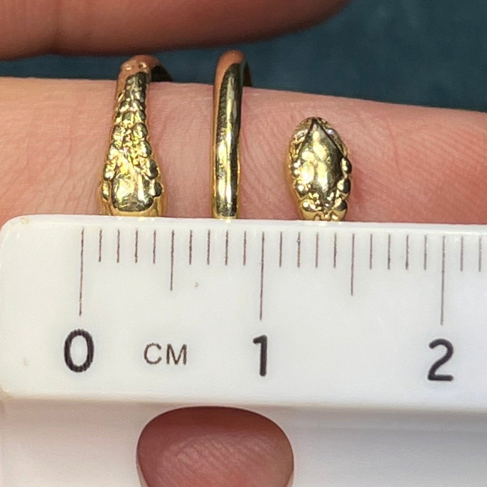 For sale is a 14k yellow gold coiled snake ring with diamond eyes. This beautifully crafted antique ring hails from the Victorian era. The snake's body forms the coiled ring, wrapping twice around your finger. The snake has two heads, one at each end of her body. Each snake head has tiny rose-cut diamond eyes. The snake's heads are heavily textured with raised scales. The snake's body is polished smooth. The ring is currently size 7 but can be easily adjusted by your jeweler to fit a large range of sizes. This ring combines beautifully with other period jewelry, such as rose-cut diamonds, garnets, onyx, cameos, or memento mori rings.