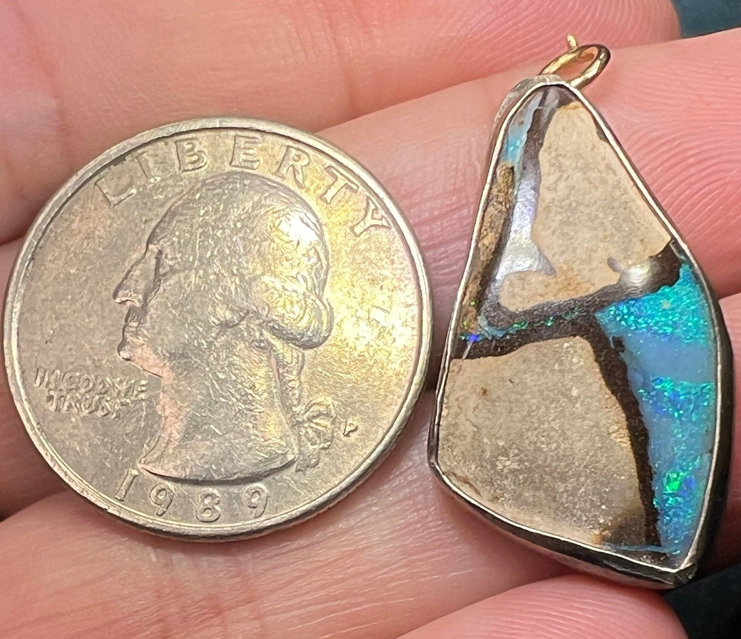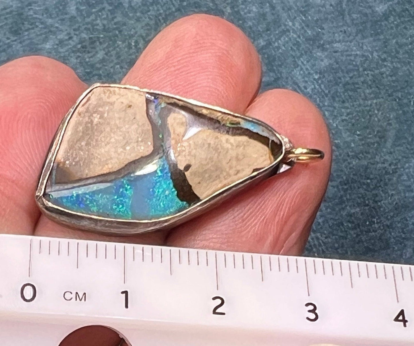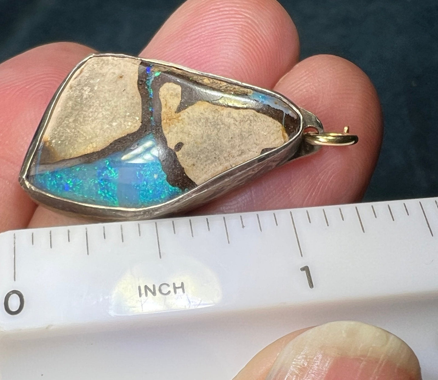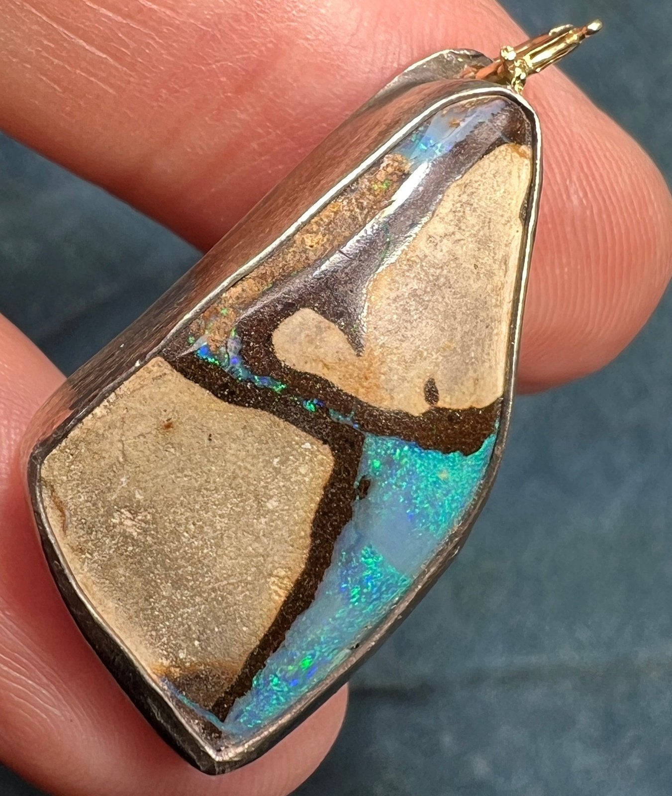 For sale is a an Australian boulder opal pendant in 925 sterling silver. This opal is truly one of a kind. The blue-green opal glitters with iridescence in shades of blue and green. The opalescence snakes like a river through the pale gray boulder (matrix). The opal forms a zig-zag design through the matrix, like a lightning bolt. The gray matrix is edged in black stone where it meets the blue opal, creating a dramatic contrast. The opal has an interesting segmented design, like the stripes of a zebra to my eye. The opal is bezel set in a hand-crafted sterling frame. The pendant is completely backed in silver. I have added a 14k yellow gold spring ring clasp for you to use as a bail.
