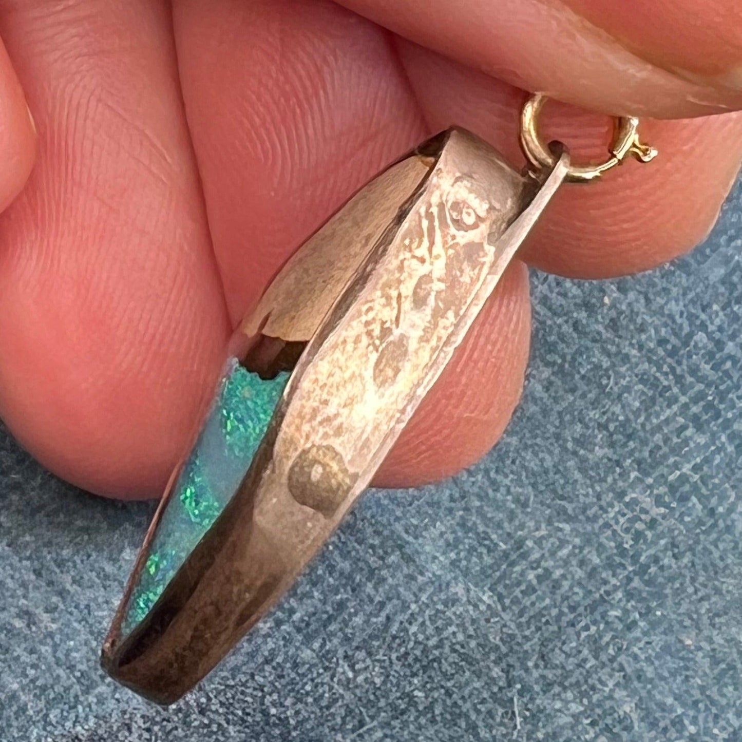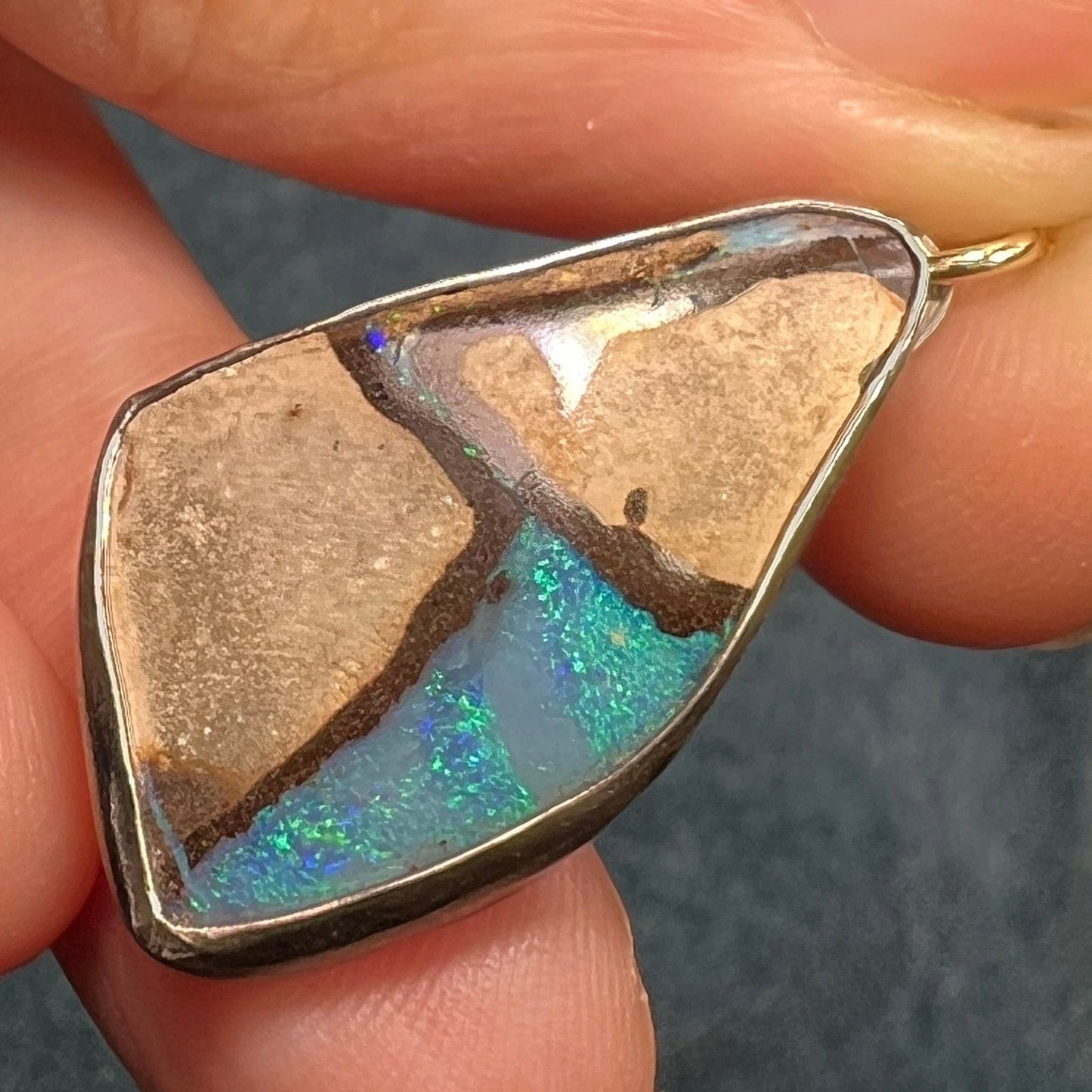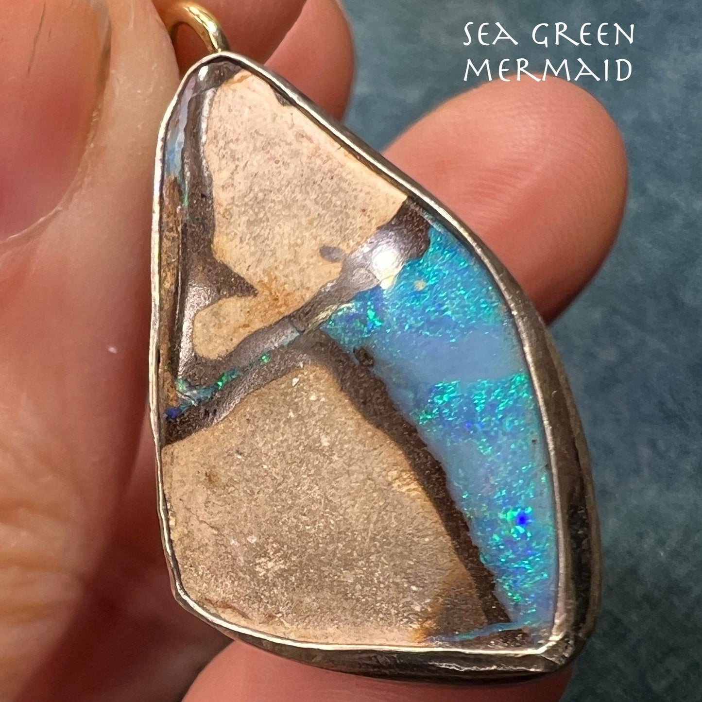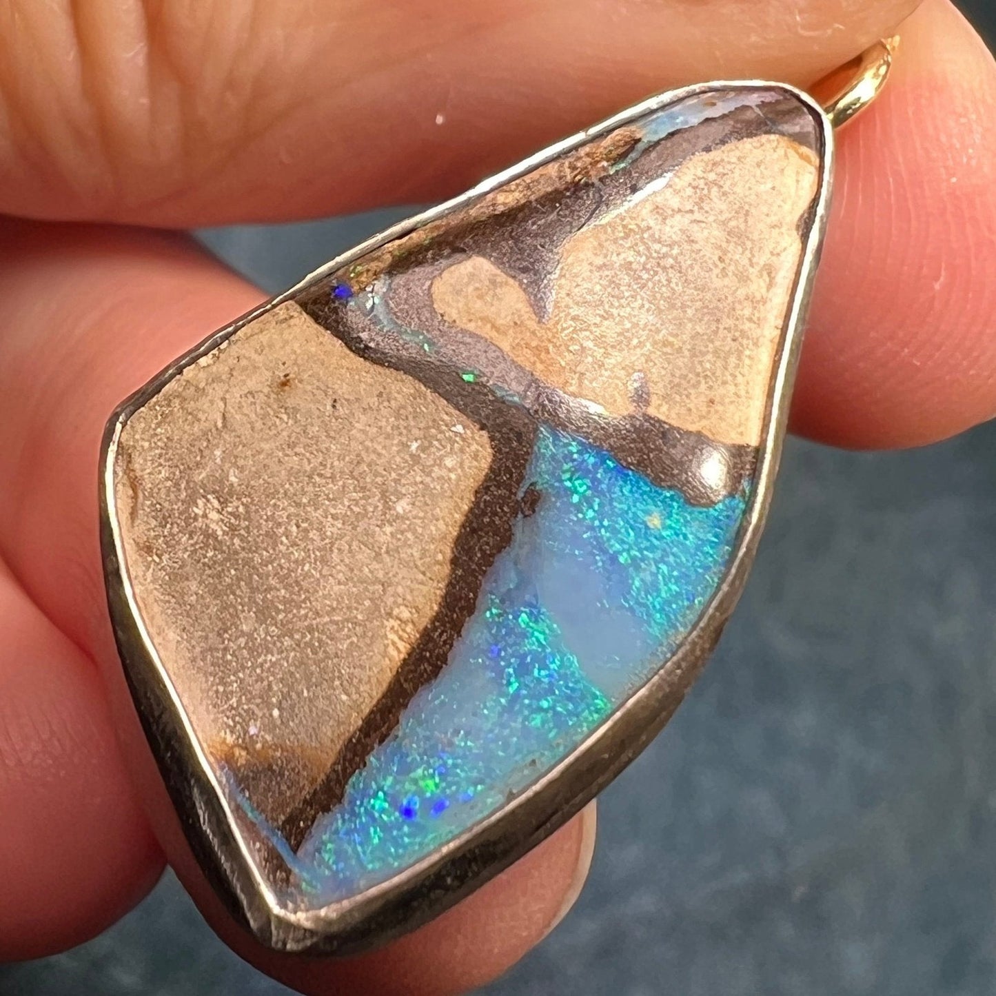 For sale is a an Australian boulder opal pendant in 925 sterling silver. This opal is truly one of a kind. The blue-green opal glitters with iridescence in shades of blue and green. The opalescence snakes like a river through the pale gray boulder (matrix). The opal forms a zig-zag design through the matrix, like a lightning bolt. The gray matrix is edged in black stone where it meets the blue opal, creating a dramatic contrast. The opal has an interesting segmented design, like the stripes of a zebra to my eye. The opal is bezel set in a hand-crafted sterling frame. The pendant is completely backed in silver. I have added a 14k yellow gold spring ring clasp for you to use as a bail.