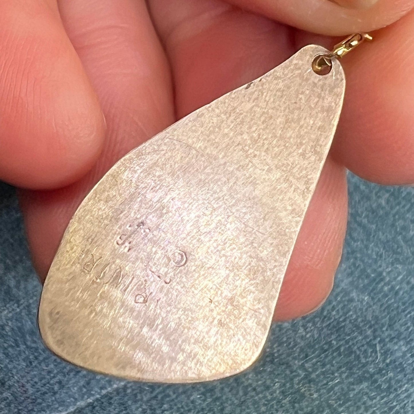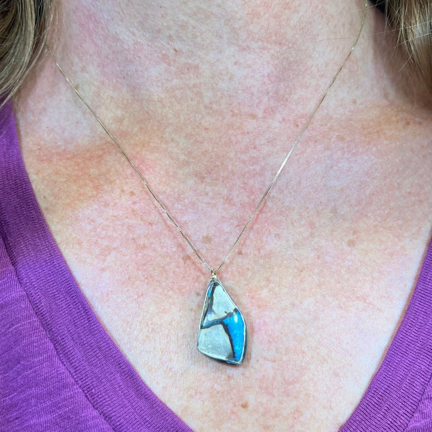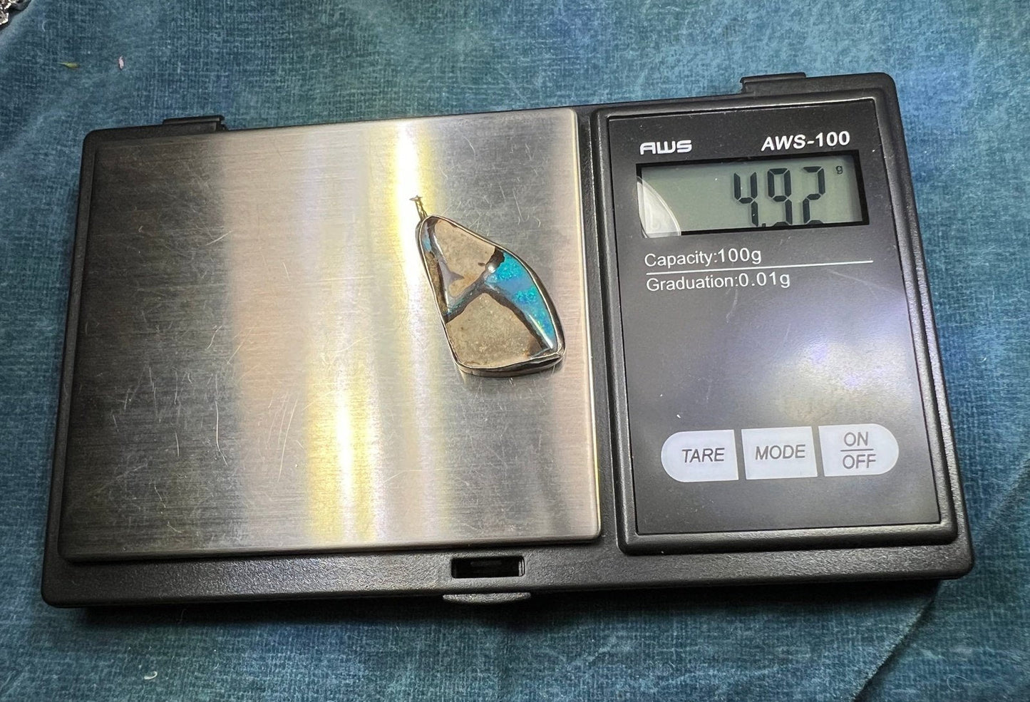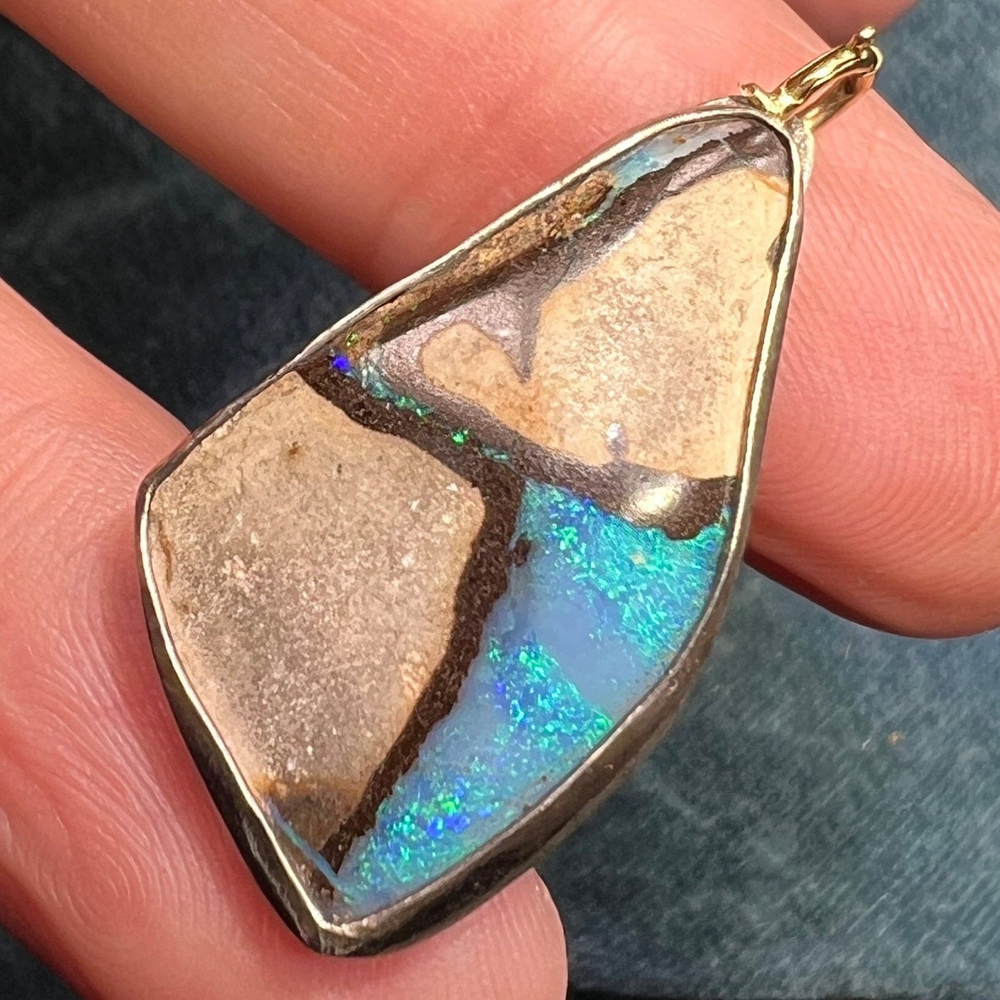 For sale is a an Australian boulder opal pendant in 925 sterling silver. This opal is truly one of a kind. The blue-green opal glitters with iridescence in shades of blue and green. The opalescence snakes like a river through the pale gray boulder (matrix). The opal forms a zig-zag design through the matrix, like a lightning bolt. The gray matrix is edged in black stone where it meets the blue opal, creating a dramatic contrast. The opal has an interesting segmented design, like the stripes of a zebra to my eye. The opal is bezel set in a hand-crafted sterling frame. The pendant is completely backed in silver. I have added a 14k yellow gold spring ring clasp for you to use as a bail.