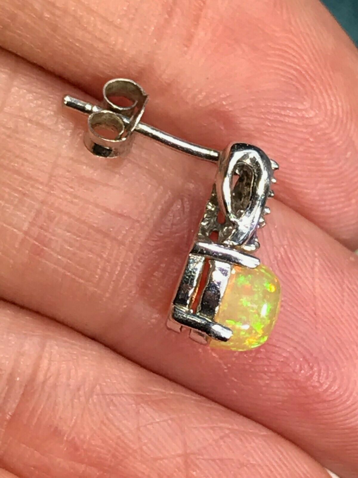 For sale is a pair of Ethiopian Welo opal and tanzanite earrings. Each earring features a domed, rounded-rectangle opal. These opals have exceptional flash and fire even in dim light. They flash with cherry red and orange in some lights, and primarily neon green and yellow-orange in other light. The opals are accented above with periwinkle tanzanite set against a swirling ribbon of silver. All gemstones are secure in prong settings. These are unusual and vibrant earrings that will delight the opal lover.
