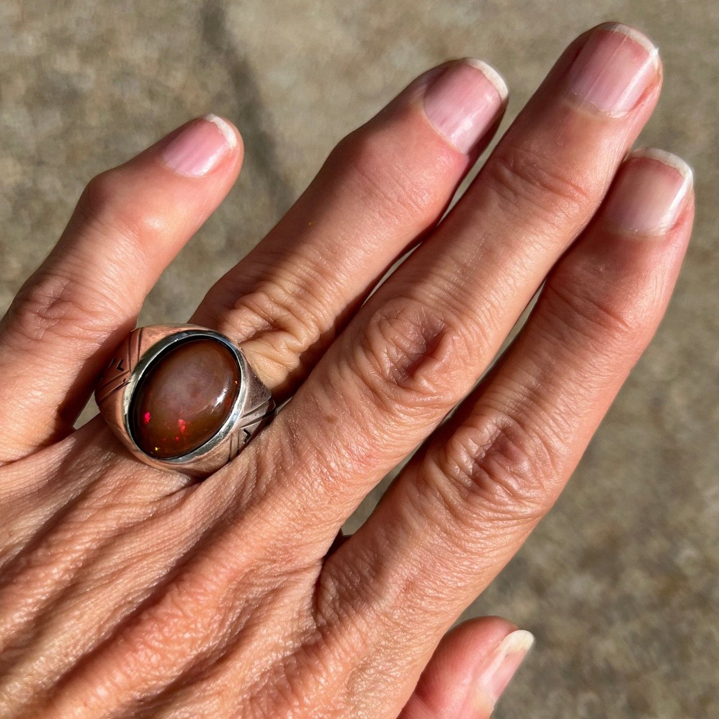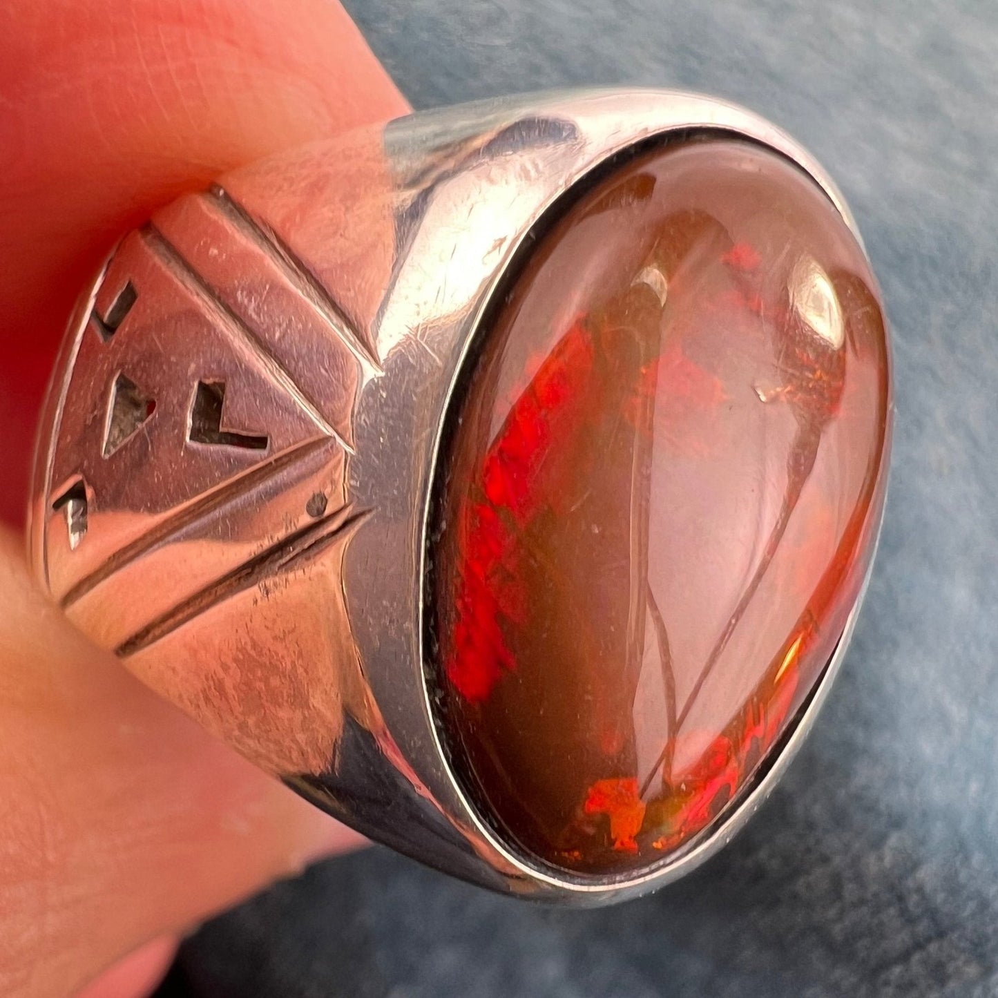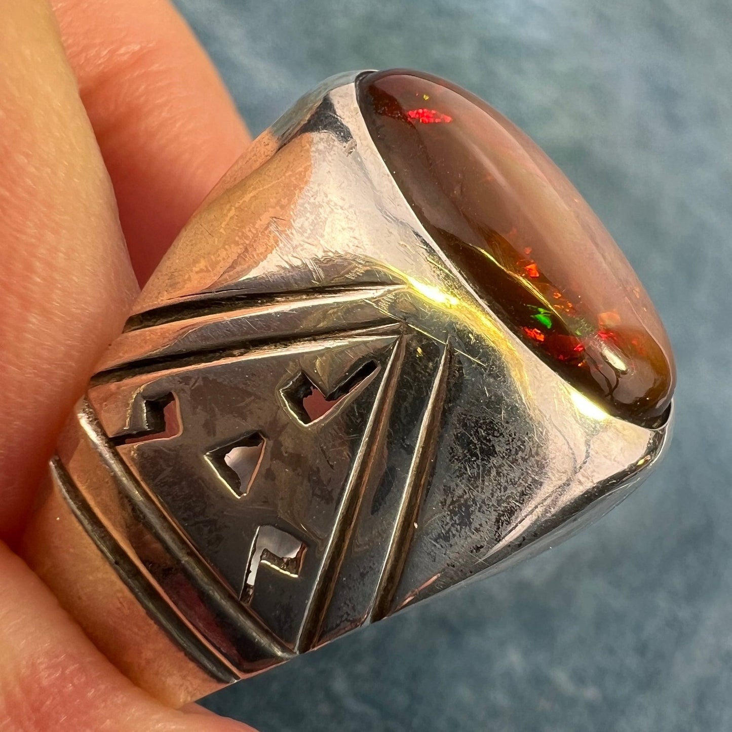 In bright light the opal appears tan, with cherry red, lime green, and vibrant orange fire that shifts in the sunlight. The opal is cloudy, and this effects the appearance, muting the fire and color somewhat on the top of the stone. The opal is set in a beautifully crafted signet style ring with an engraved chevron design and cutout symbols on each shoulder.