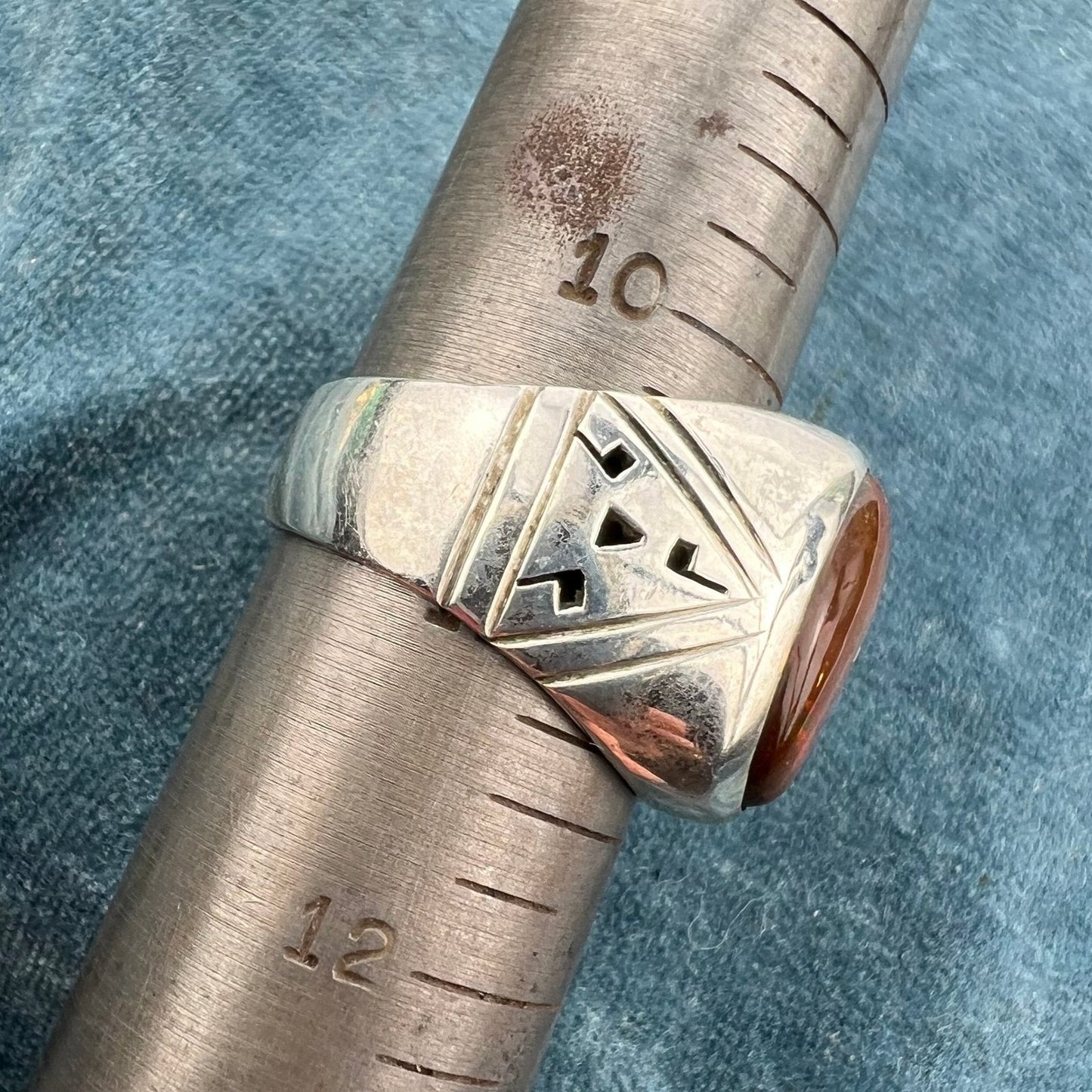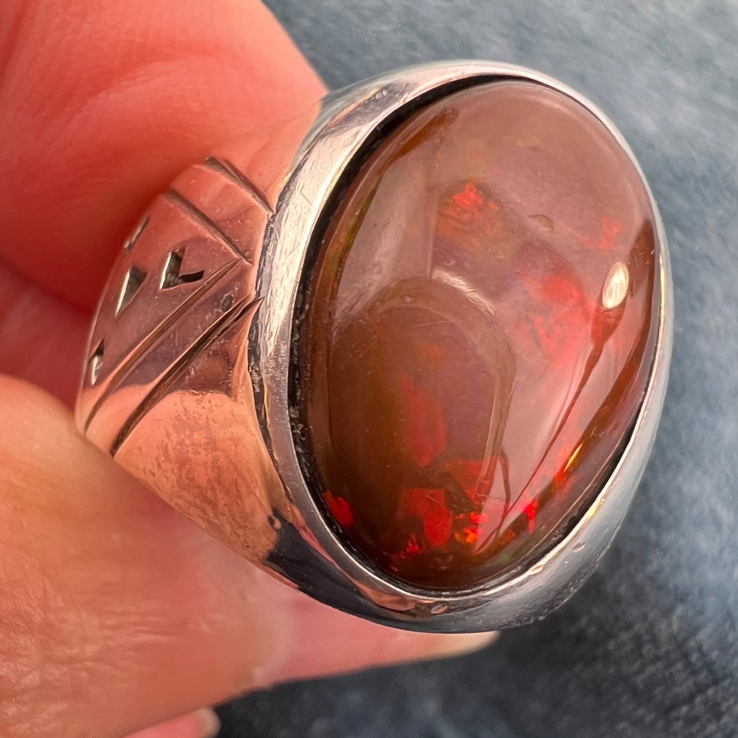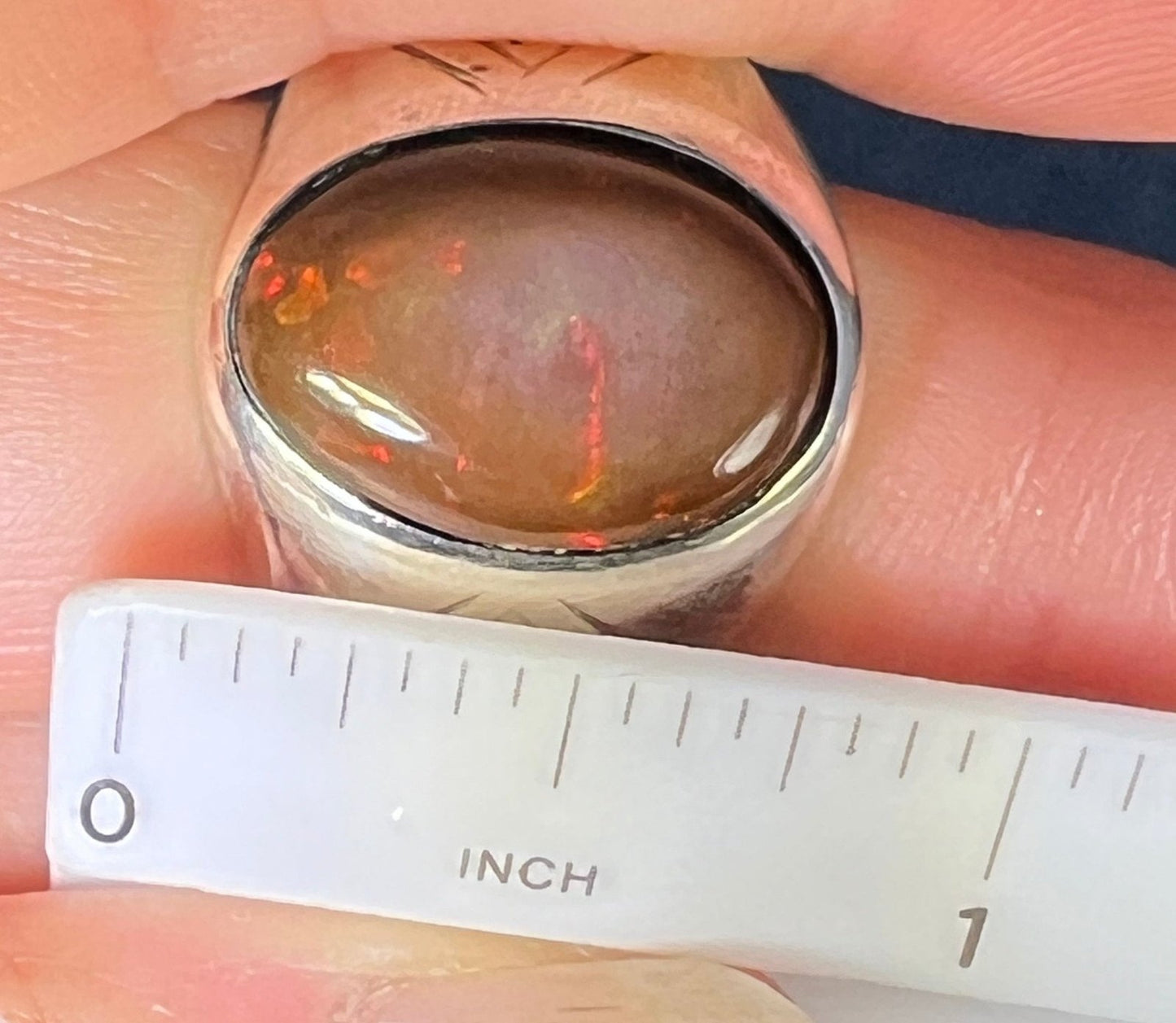 In bright light the opal appears tan, with cherry red, lime green, and vibrant orange fire that shifts in the sunlight. The opal is cloudy, and this effects the appearance, muting the fire and color somewhat on the top of the stone. The opal is set in a beautifully crafted signet style ring with an engraved chevron design and cutout symbols on each shoulder.