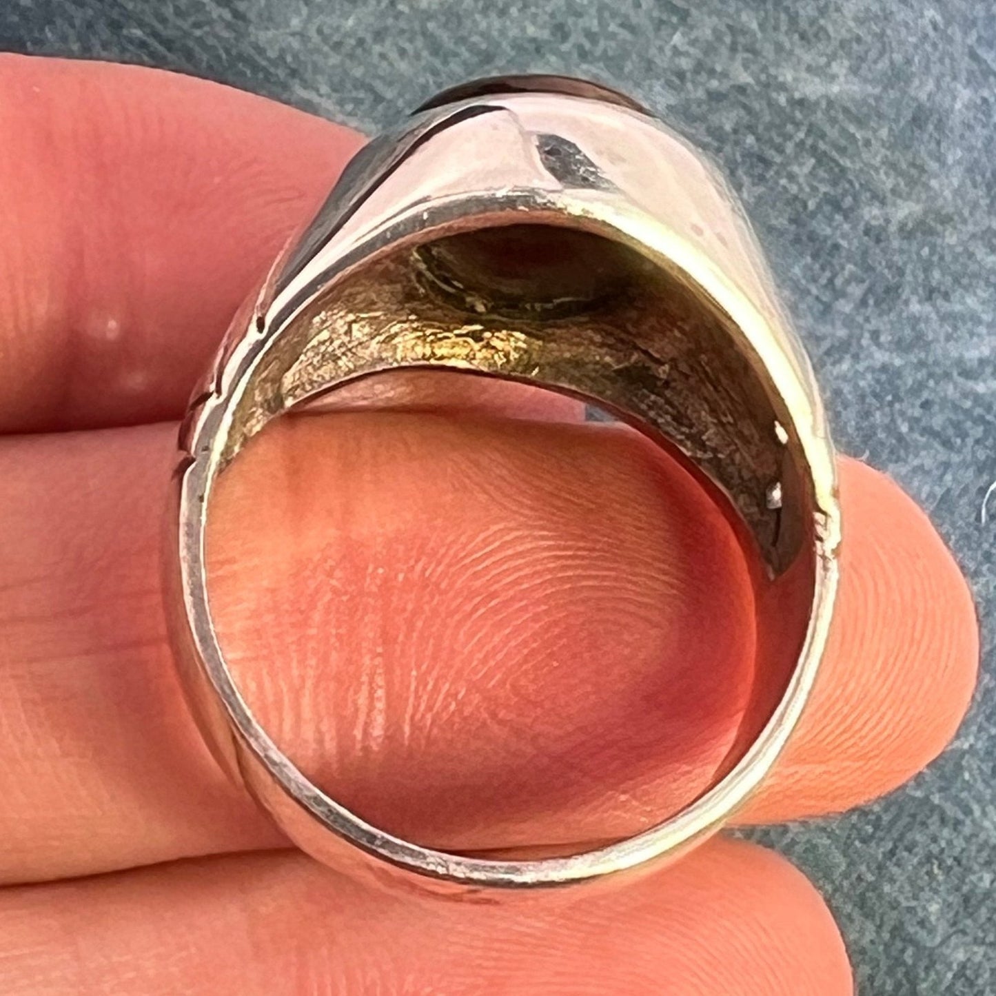 For sale is a very unusual Mexican black opal opal signet ring in sterling silver. This opal is a dark, very large, slightly domed oval. In dim light, the opal appears deep brown with vivid red opalescence that swirls beneath the surface.