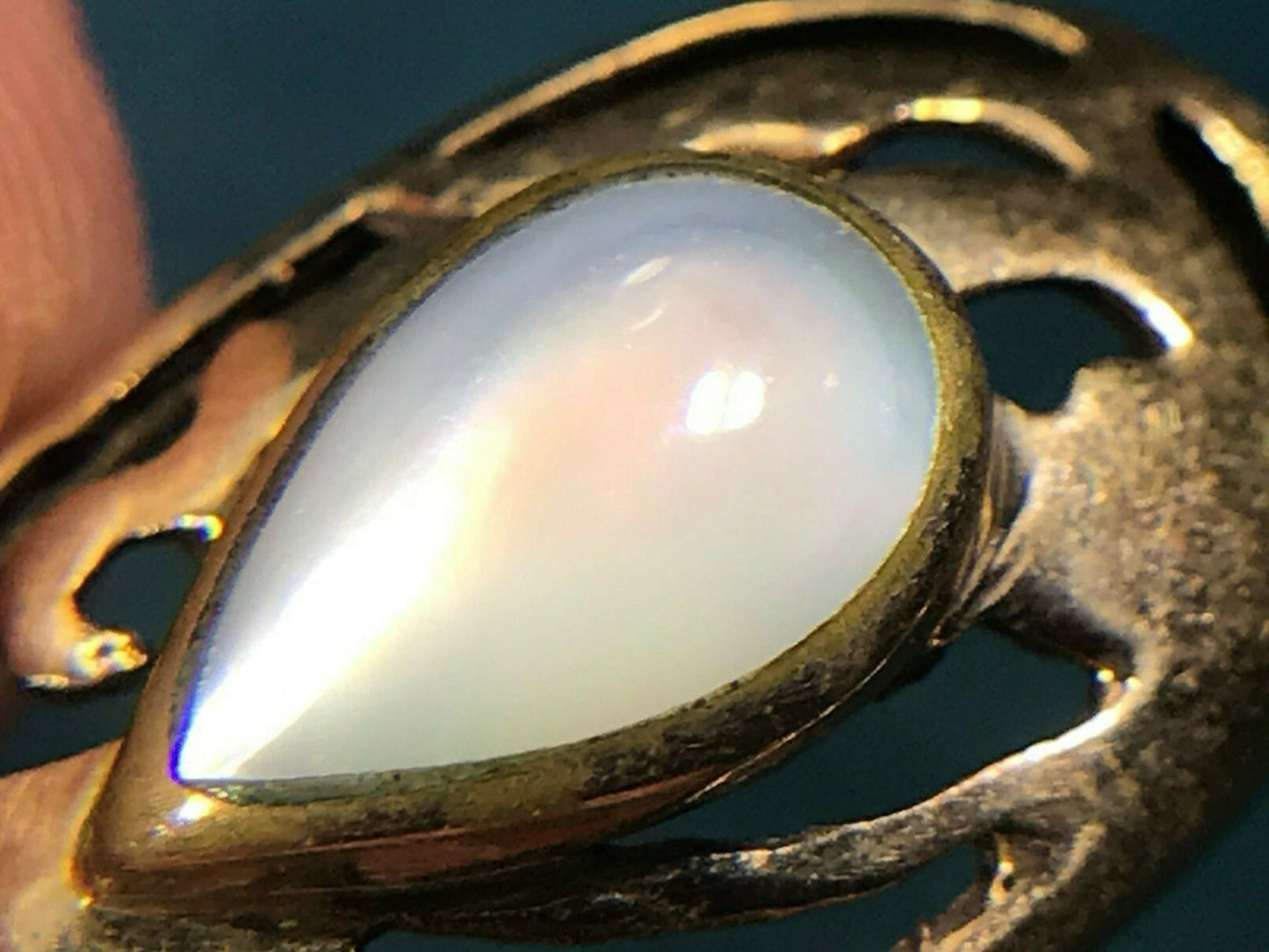 Each earring features a glowing teardrop of milky white mother of pearl that is bezel-set in the lower half of the earring. The earrings are suspended from shepherds hooks. The back of the gold teardrops has a heavy silver patina. This is not visible from the front of the earrings.
