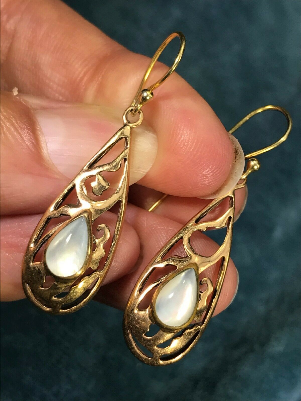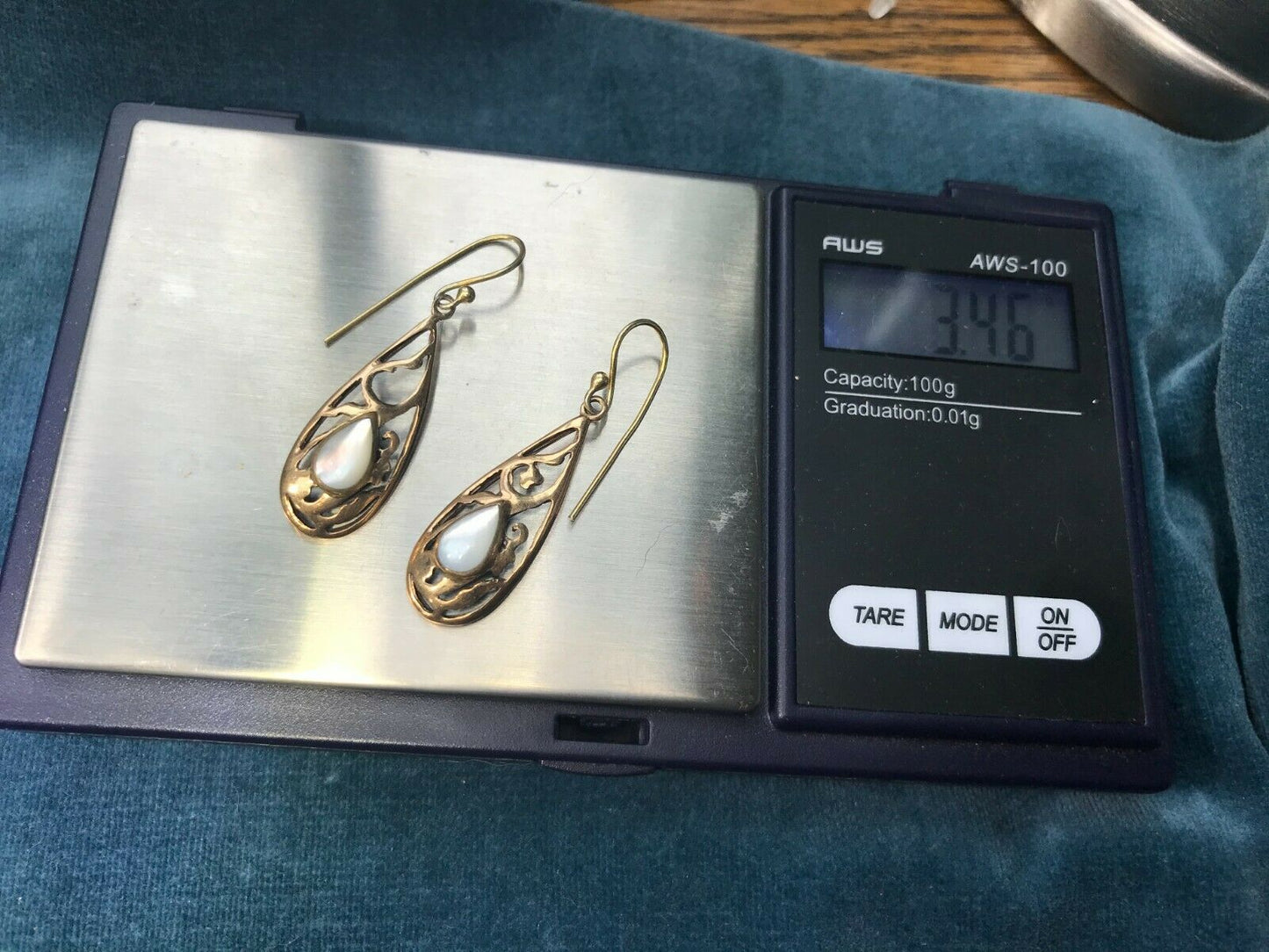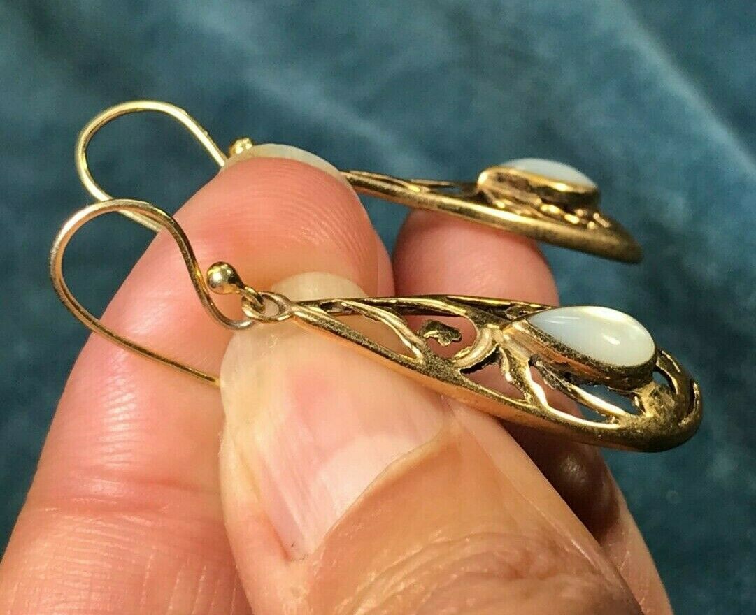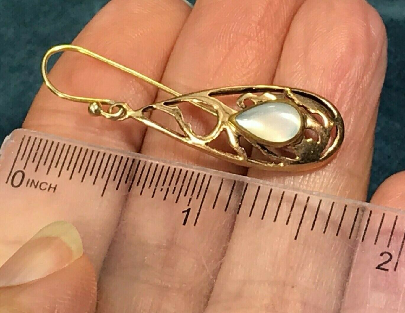 10k Yellow Gold Filigree MOP Pearl Earrings. 1.5" Drop