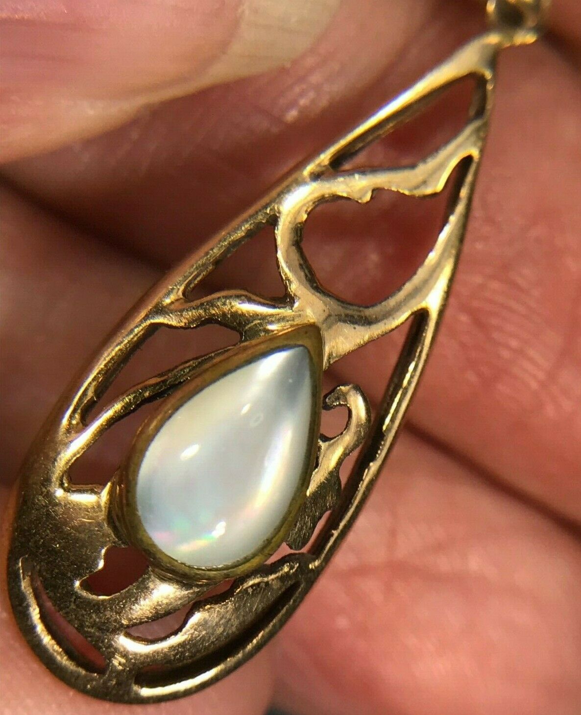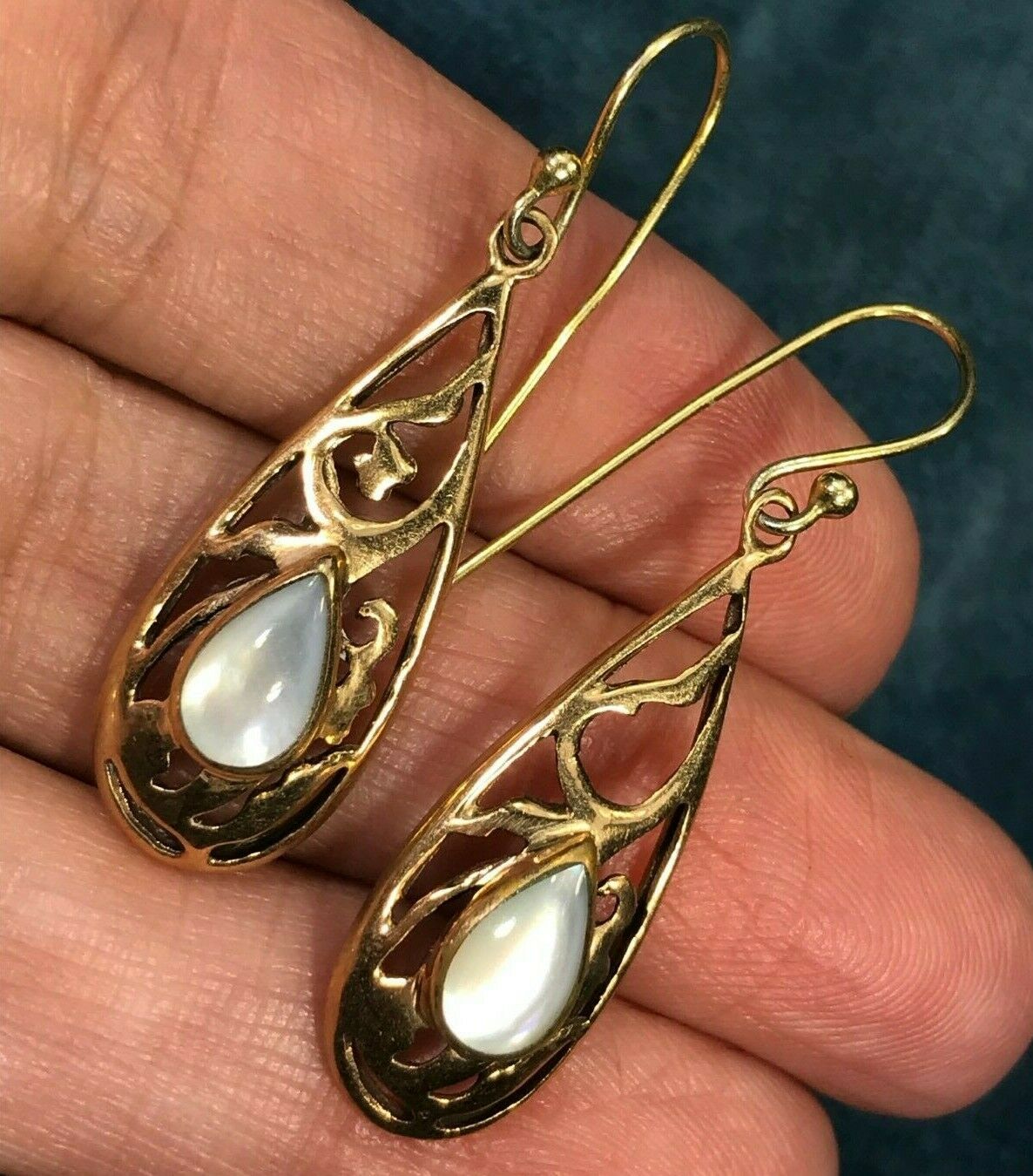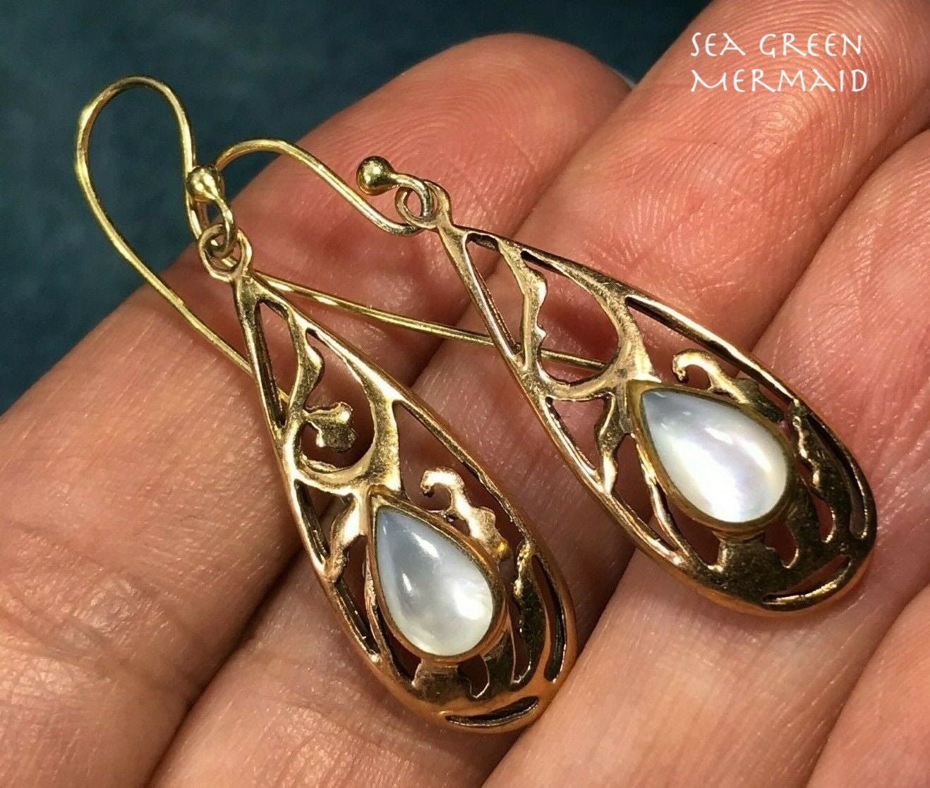 10k Yellow Gold Filigree MOP Pearl Earrings. 1.5" Drop