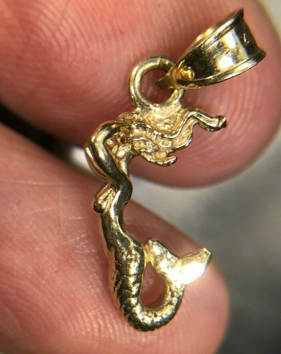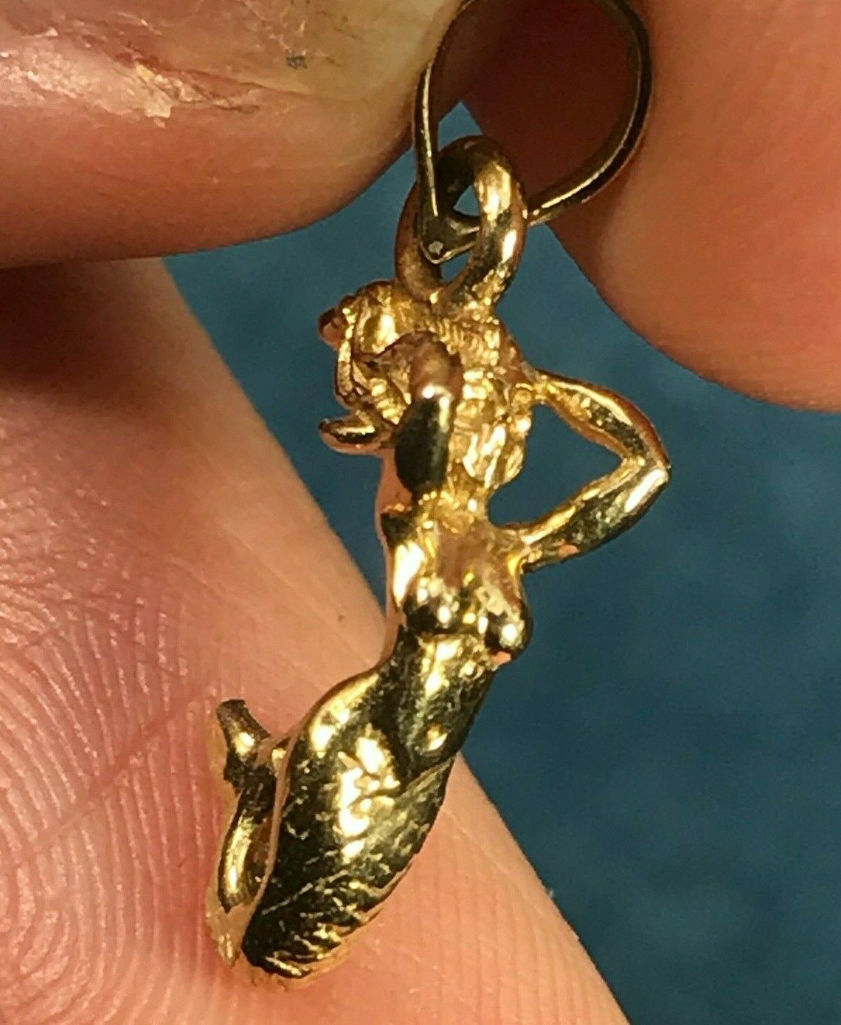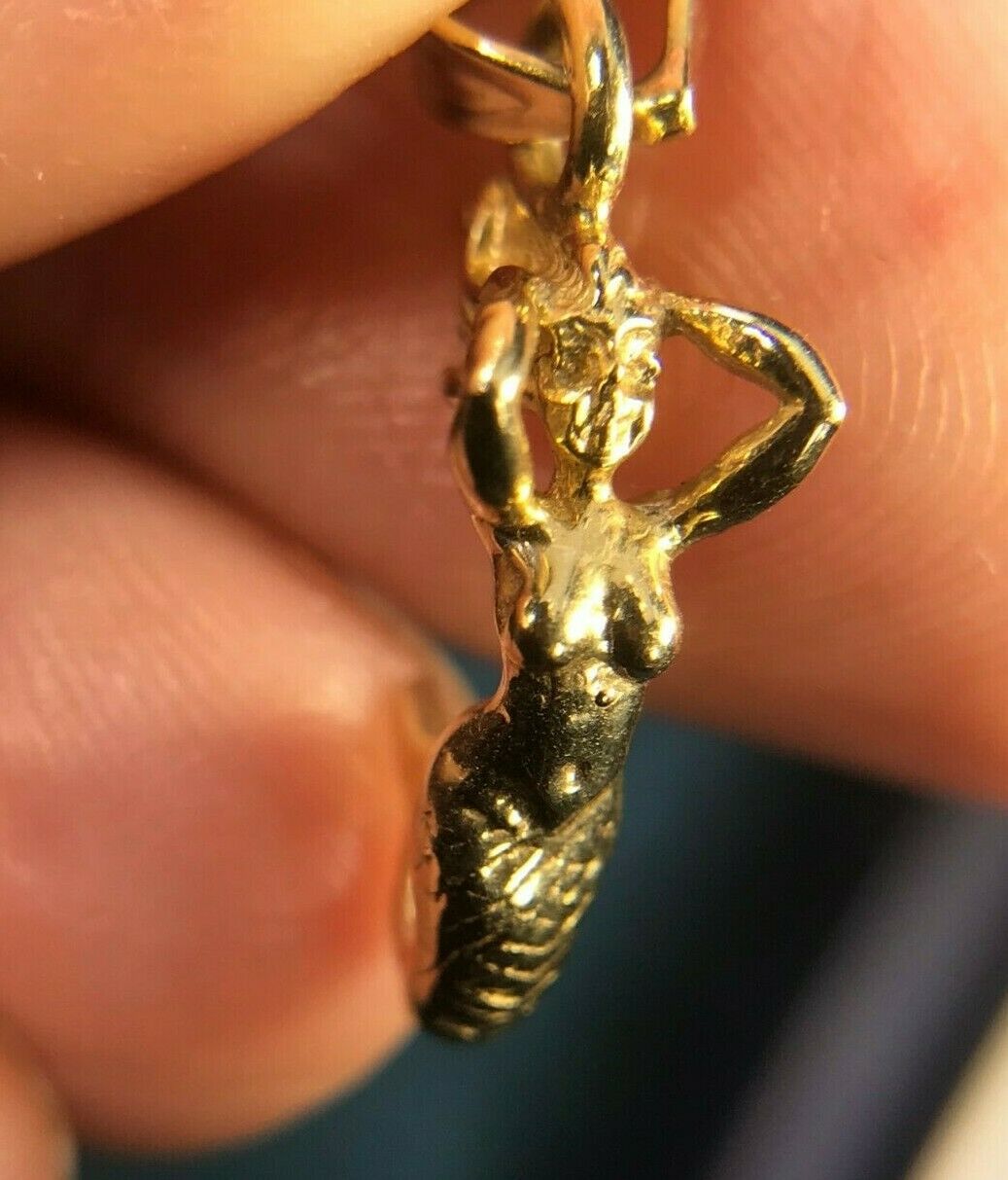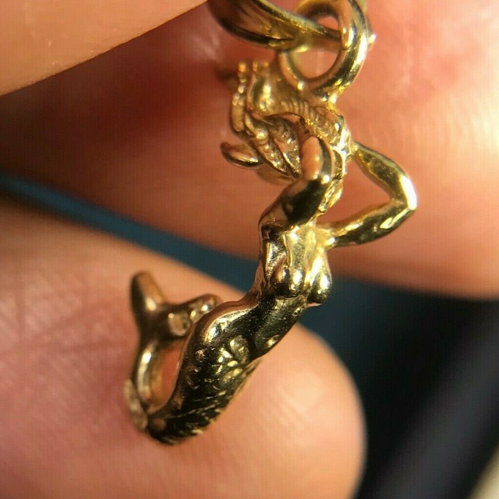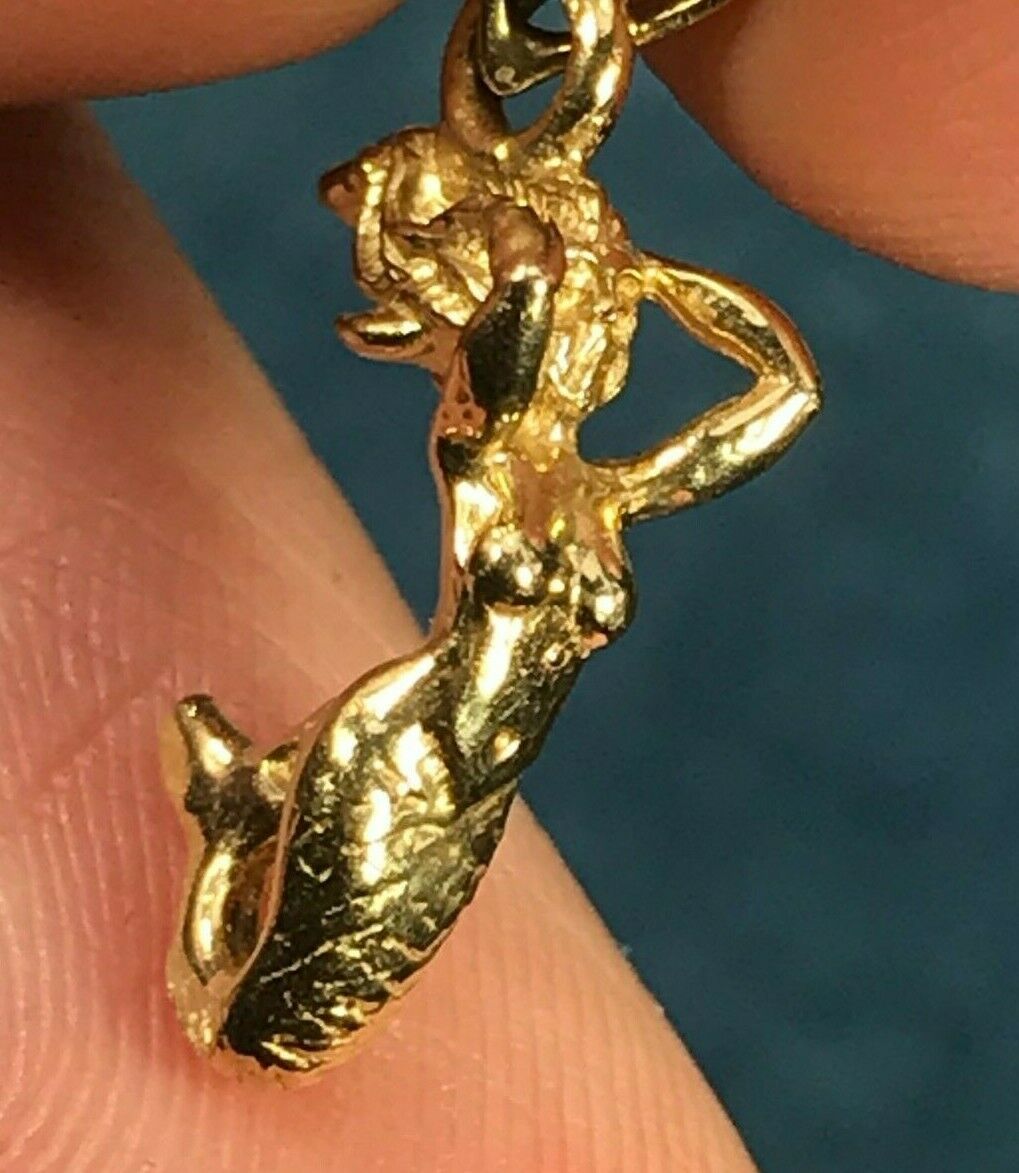 For sale is a 14k yellow gold mermaid pendant. This is a tiny, exceptionally lovely mermaid. She is positioned with her arms pushing her flowing hair back from her face, and her tail curved up towards her body. Her tail has been engraved with an intricate pattern of scales. The mermaid's torso and arms are crafted with elegant detail. The delicate arch of her back, the swell of her breasts, and even the curve of her biceps is captured with artistic skill. The mermaid pendant has an articulated bail to accommodate your chain. This sweet, tiny pendant would look simple and lovely worn alone, or could be layered with other necklaces.